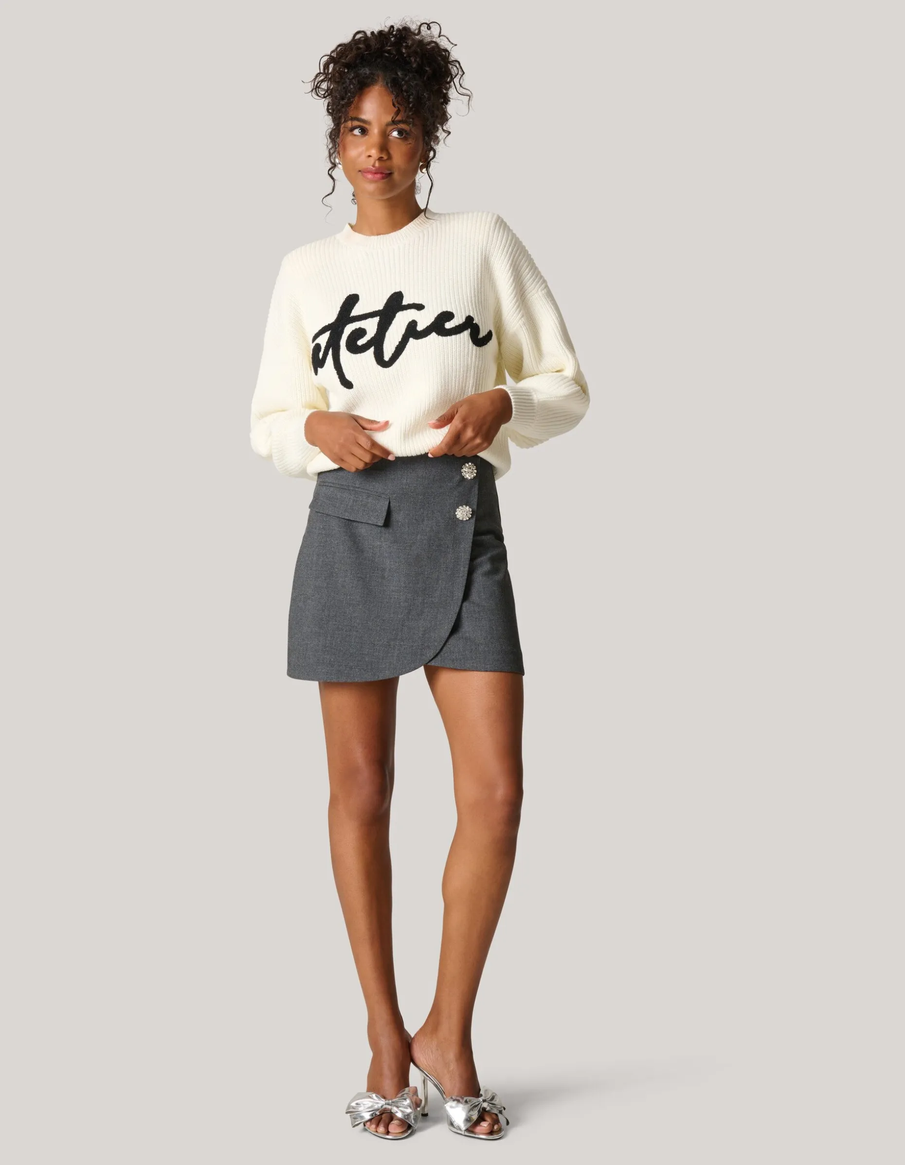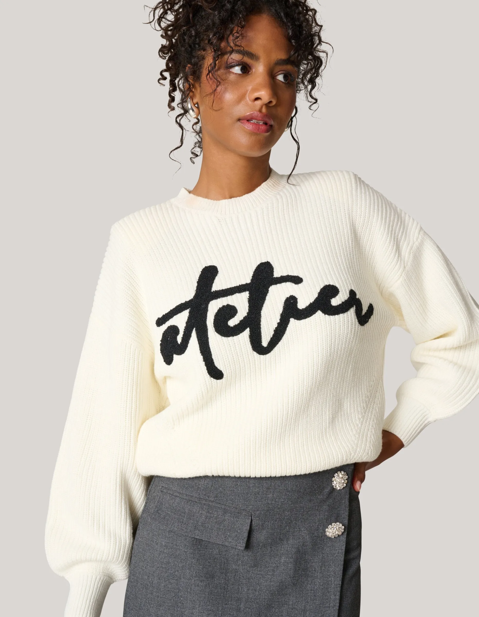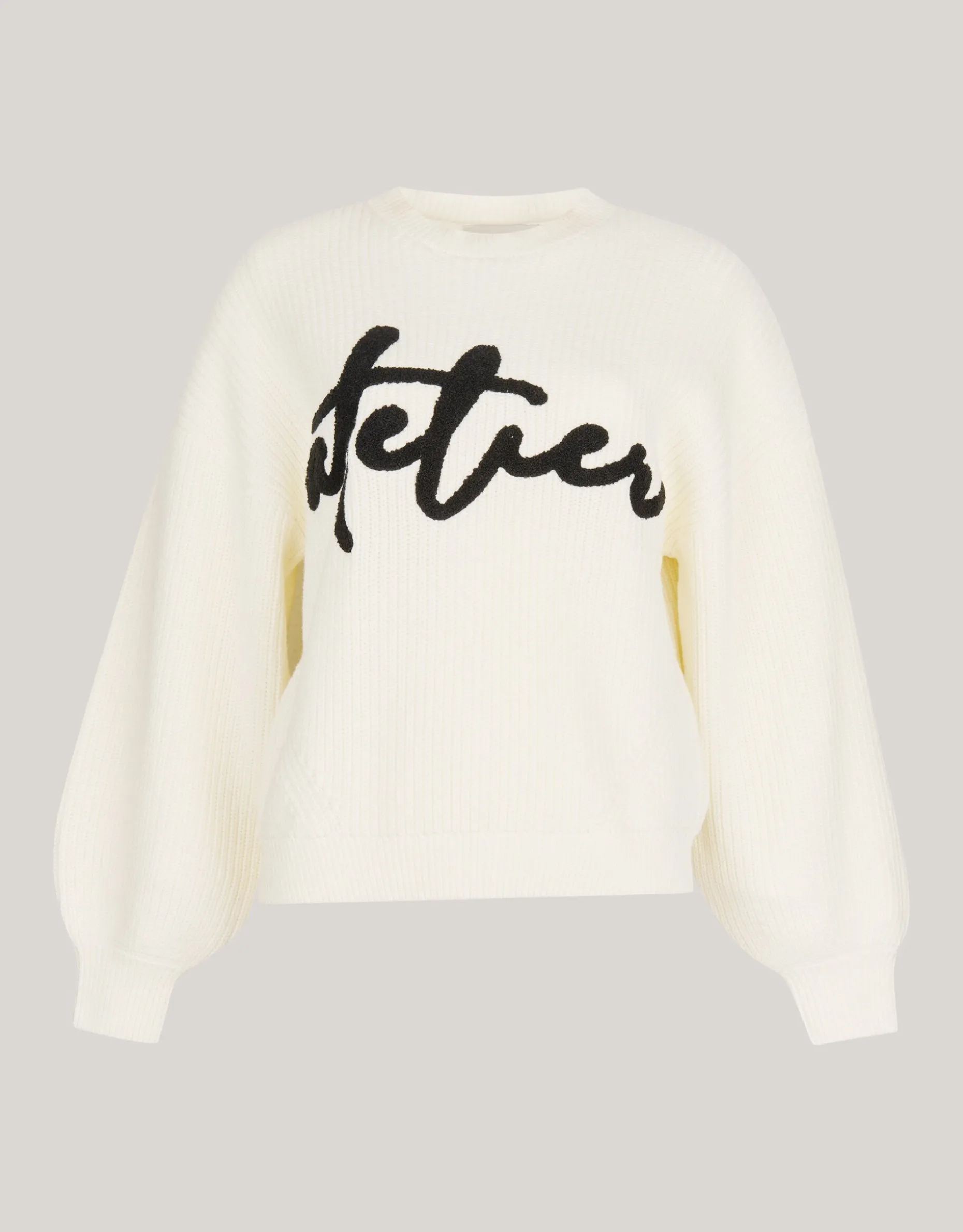 Musthave! De Artwork Trui heeft lange mouwen, een hoge ronde hals, een stretch stof, een grof breisel en een relaxed fit. Het item wordt gekenmerkt door de gebroken witte kleur met een grafisch artwork op de voorzijde. Het artwork is van towelling stof, waardoor het zacht aanvoelt. De trui is met zijn tekstprint en luxe brei een echte musthave voor fit seizoen. Het is gemaakt van katoen en acryl. Door deze samenstelling is het sterk van kwaliteit, comfortabel en voelt het even warm als wol aan. Maak de outfit compleet met een strass strik rok en een paar killer heels voor een edgy look. Het artikel heeft een totale lengte van 56 cm bij maat S.