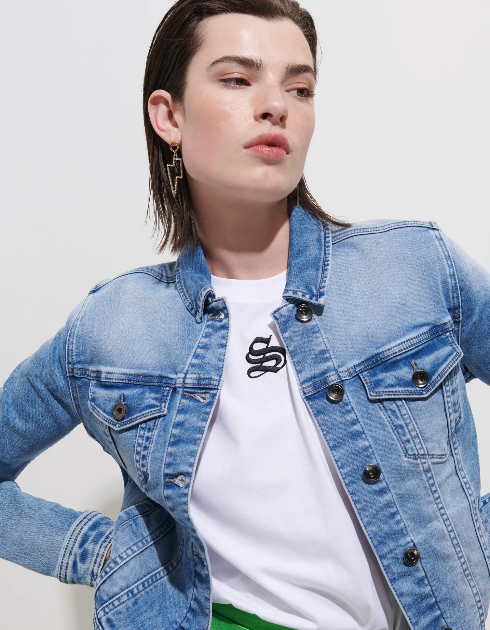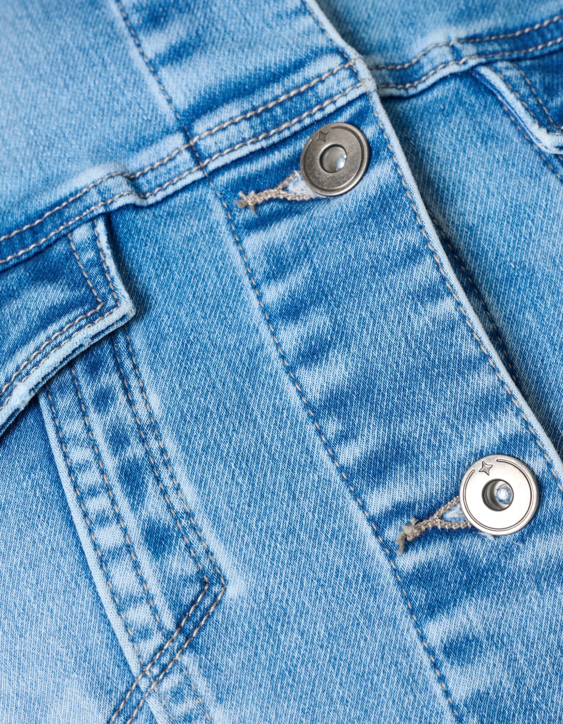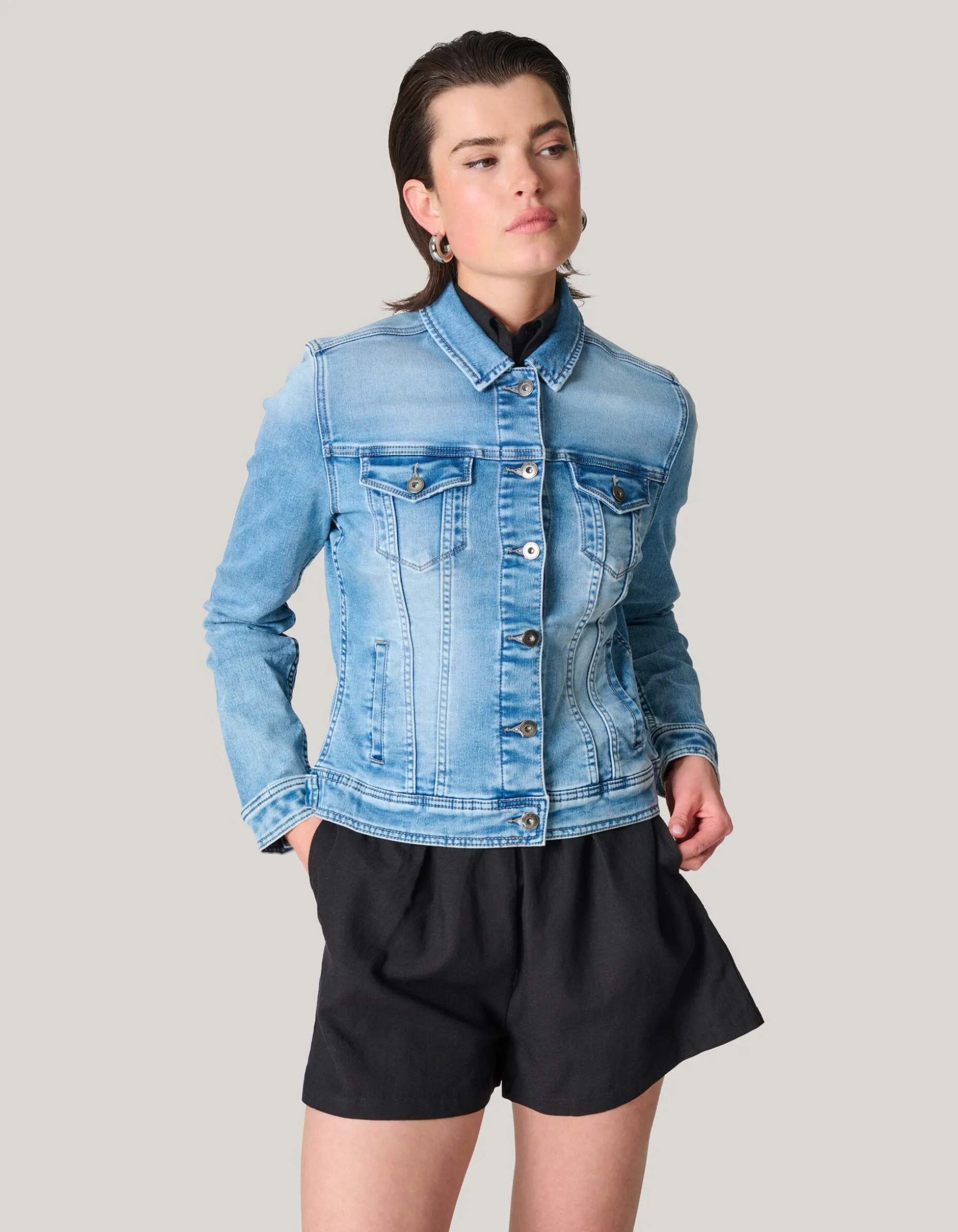 When in doubt wear denim! Het Basis Spijkerjack is een waardevolle toevoeging op jouw garderobe. Dit blauwe denim jack heeft lange mouwen, een getailleerde pasvorm, stretch in de stof en sluit door middel van knopen. Verder heeft het jasje twee borstzakken en twee steekzakken. Dankzij de lichtblauwe kleur is het item super makkelijk te combineren. Draag het jack op een mooi jurkje of een stoere vegan leather short. Combineer het samen met een trendy satijnen rok en een v-hals t-shirt voor een stijlvolle look. Het model heeft een lengte van 174 cm en draagt maat S. Het artikel heeft een totale lengte van 52 cm bij een maat S.