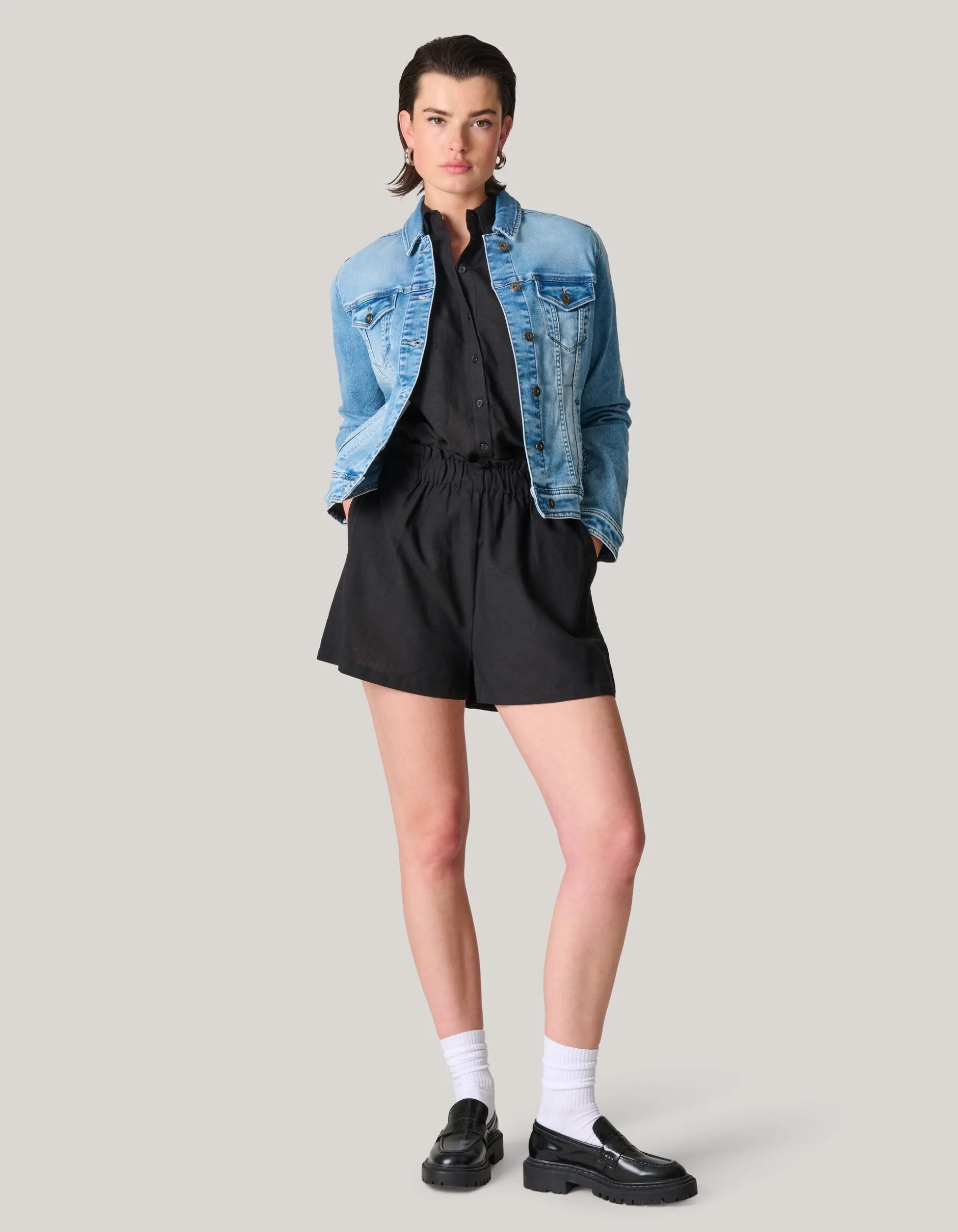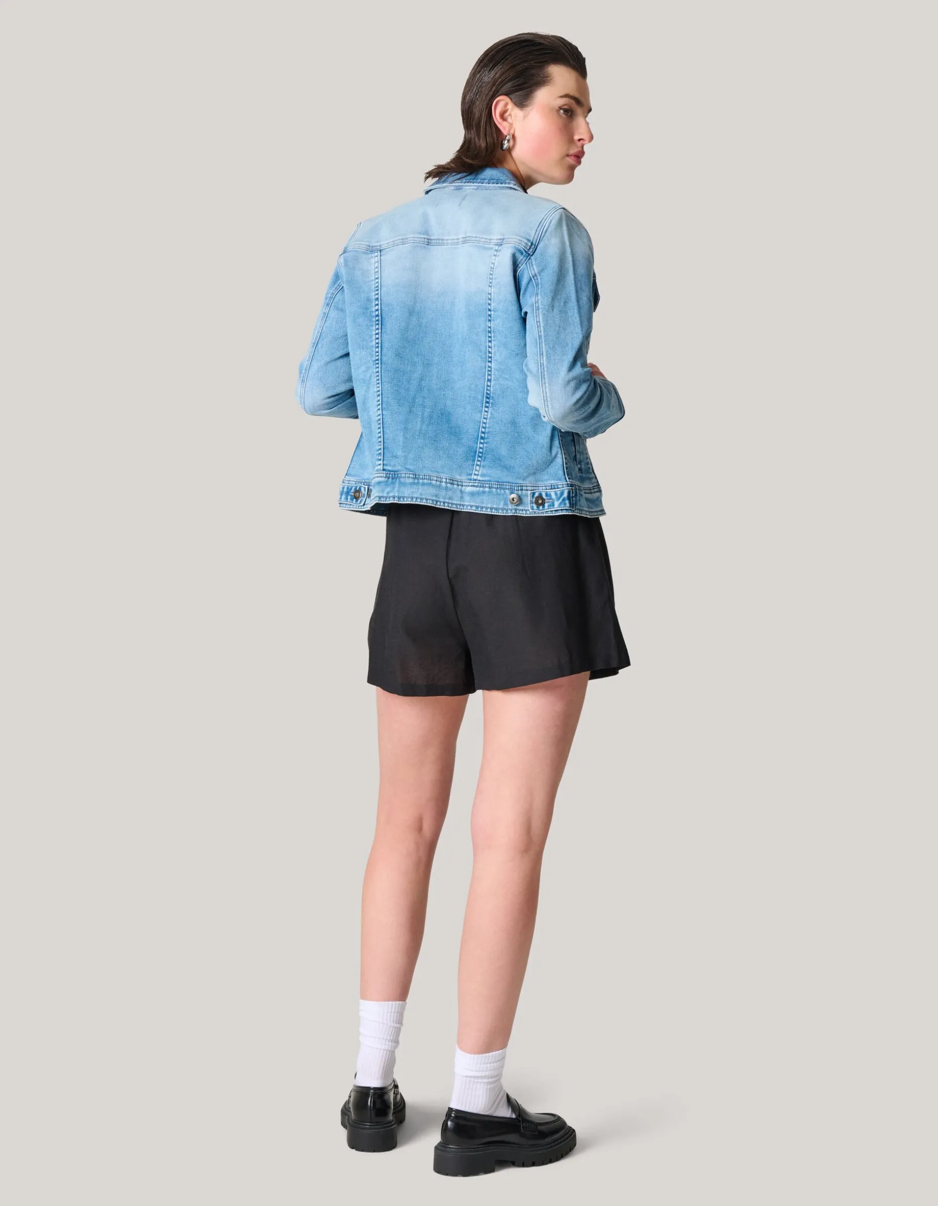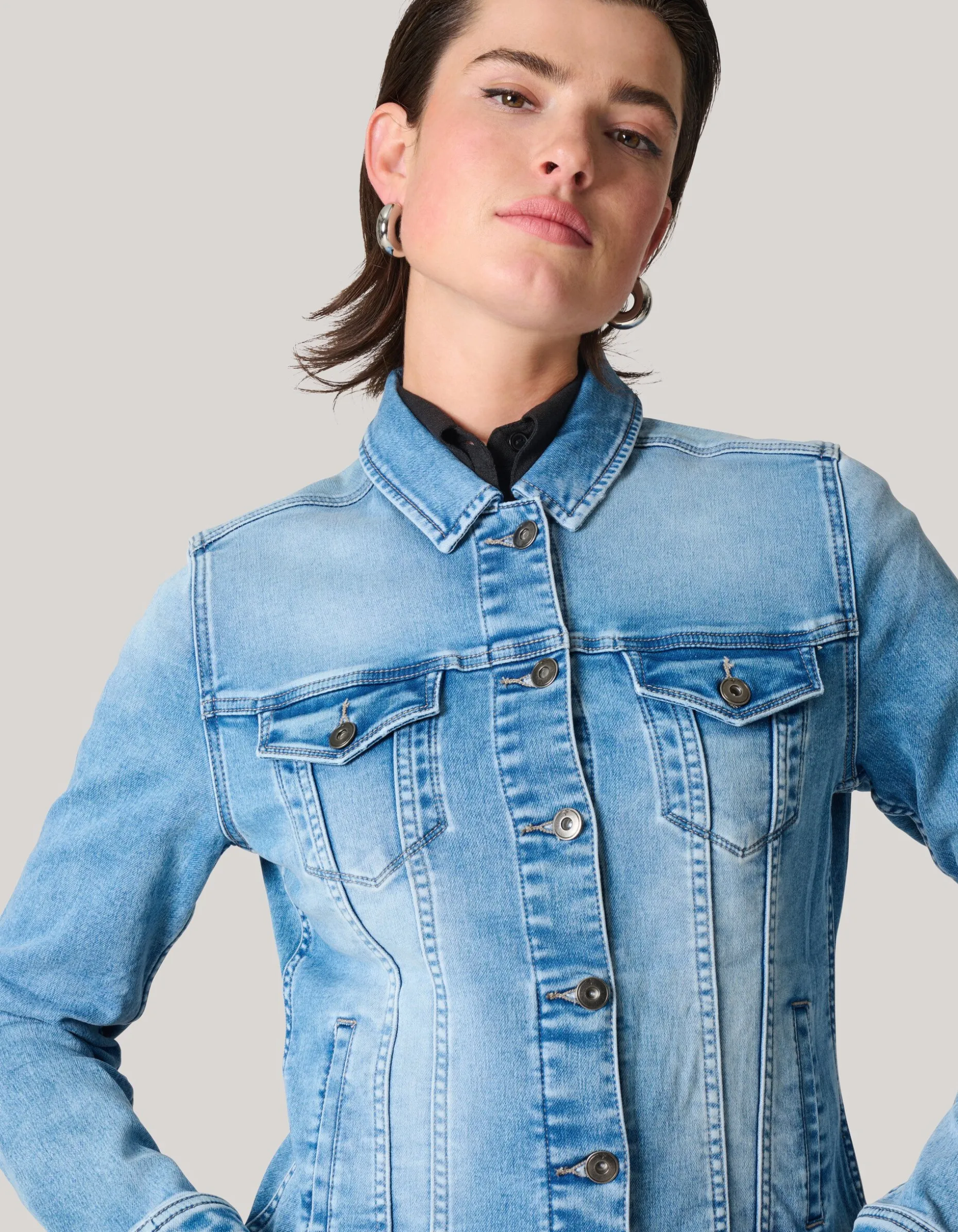 When in doubt wear denim! Het Basis Spijkerjack is een waardevolle toevoeging op jouw garderobe. Dit blauwe denim jack heeft lange mouwen, een getailleerde pasvorm, stretch in de stof en sluit door middel van knopen. Verder heeft het jasje twee borstzakken en twee steekzakken. Dankzij de lichtblauwe kleur is het item super makkelijk te combineren. Draag het jack op een mooi jurkje of een stoere vegan leather short. Combineer het samen met een trendy satijnen rok en een v-hals t-shirt voor een stijlvolle look. Het model heeft een lengte van 174 cm en draagt maat S. Het artikel heeft een totale lengte van 52 cm bij een maat S.