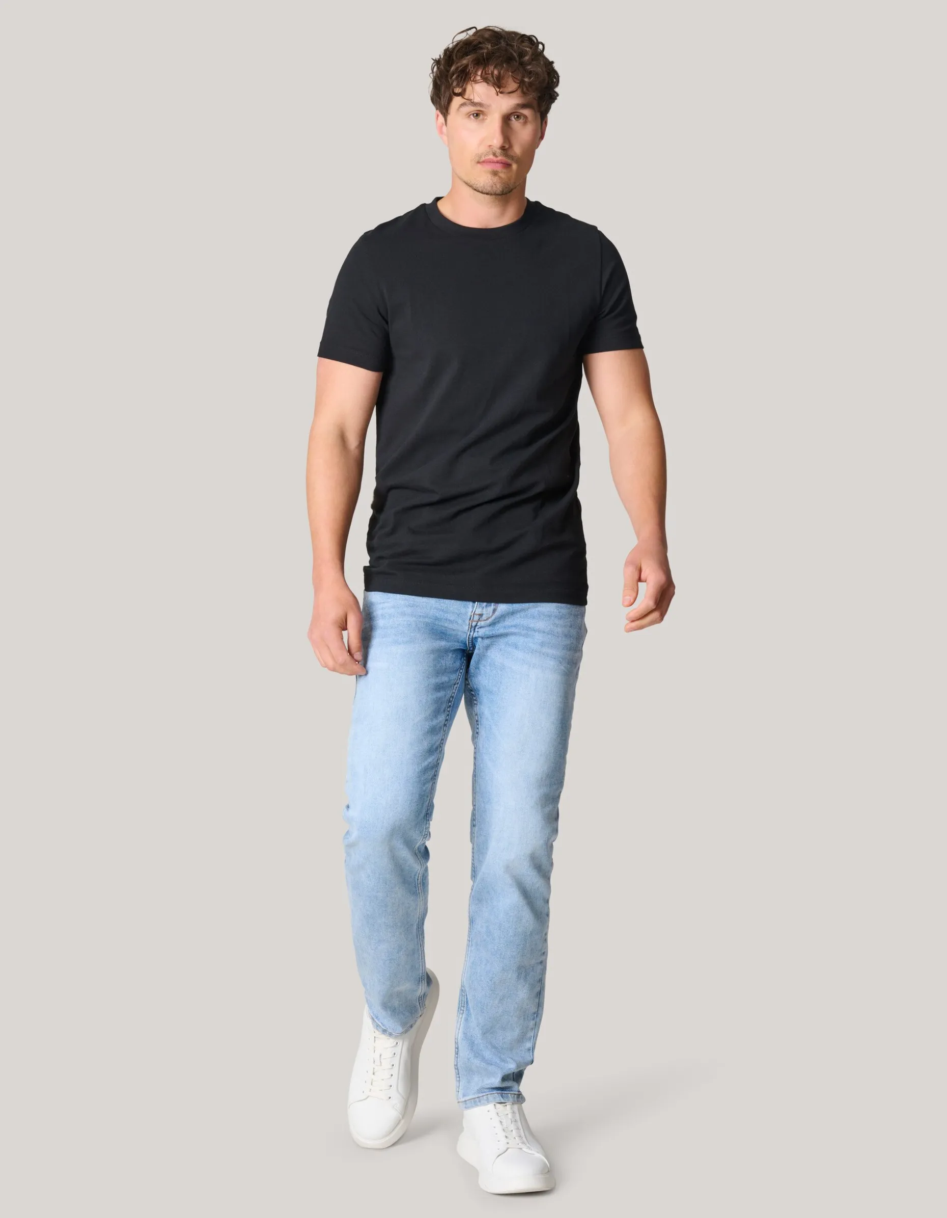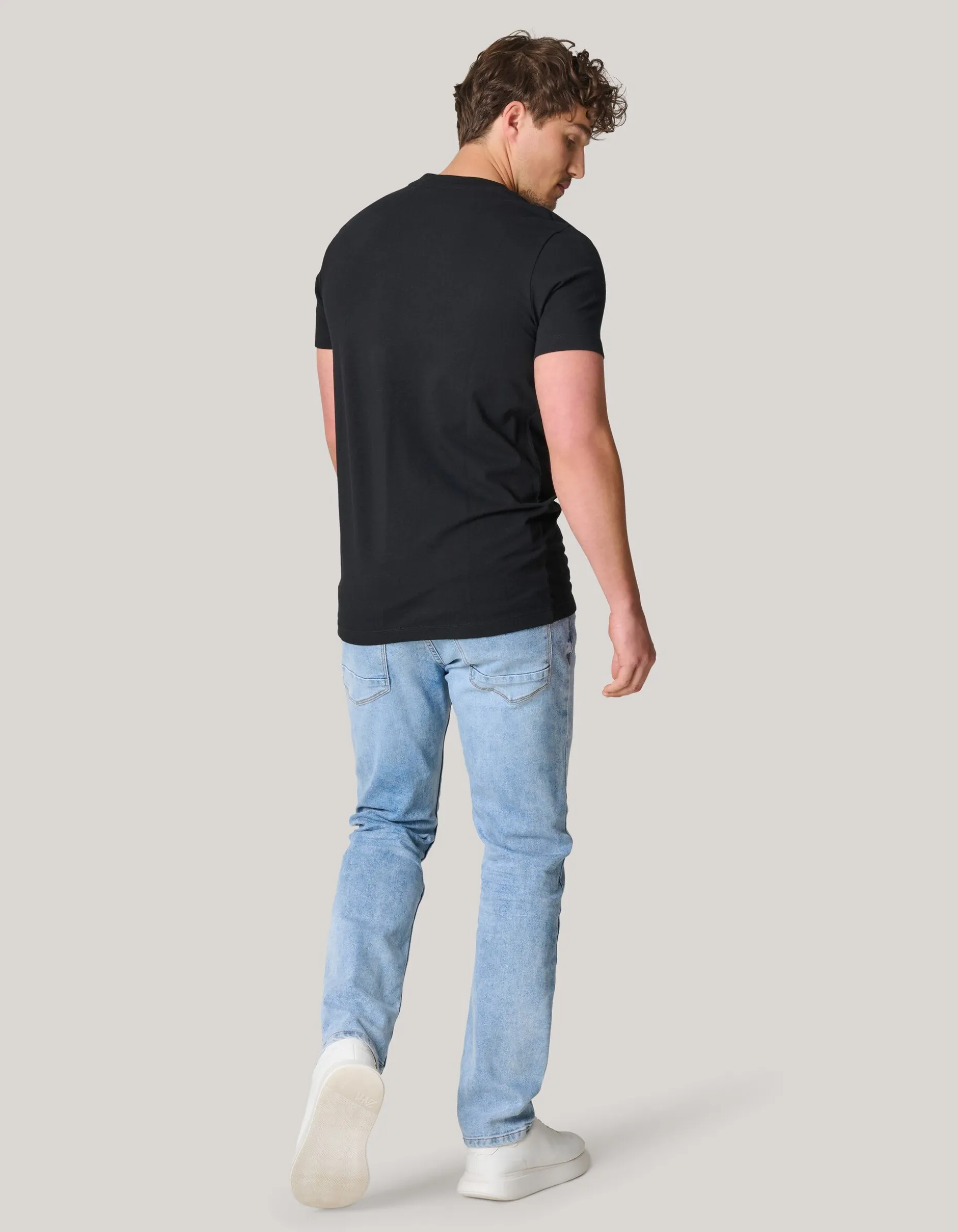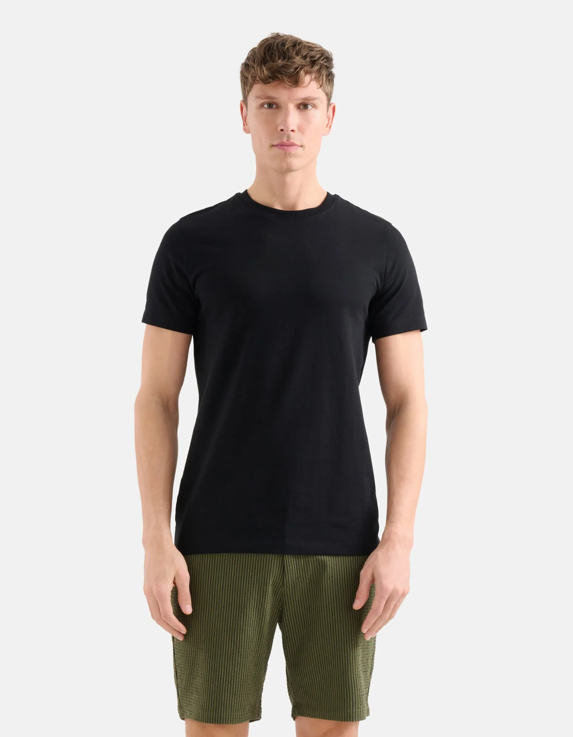 Back to basic! Een Basis T-shirt is een musthave item voor in je garderobe. Het t-shirt heeft een korte mouw, een hoge ronde hals en een regular fit. Het item wordt gekenmerkt door de zwarte kleur en de zachte katoenen stof. Door de tijdloze fit kan je het t-shirt eindeloos combineren met artikelen uit je garderobe! Het is gemaakt van katoen en elastaan. Door deze samenstelling is het sterk van kwaliteit, rekt het deels mee en draagt het comfortabel. Combineer het samen met een zwarte pantalon en een overshirt voor een casual look. Het model heeft een lengte van 186 cm en draagt maat M. Het artikel heeft een totale lengte van 68 cm bij maat M.