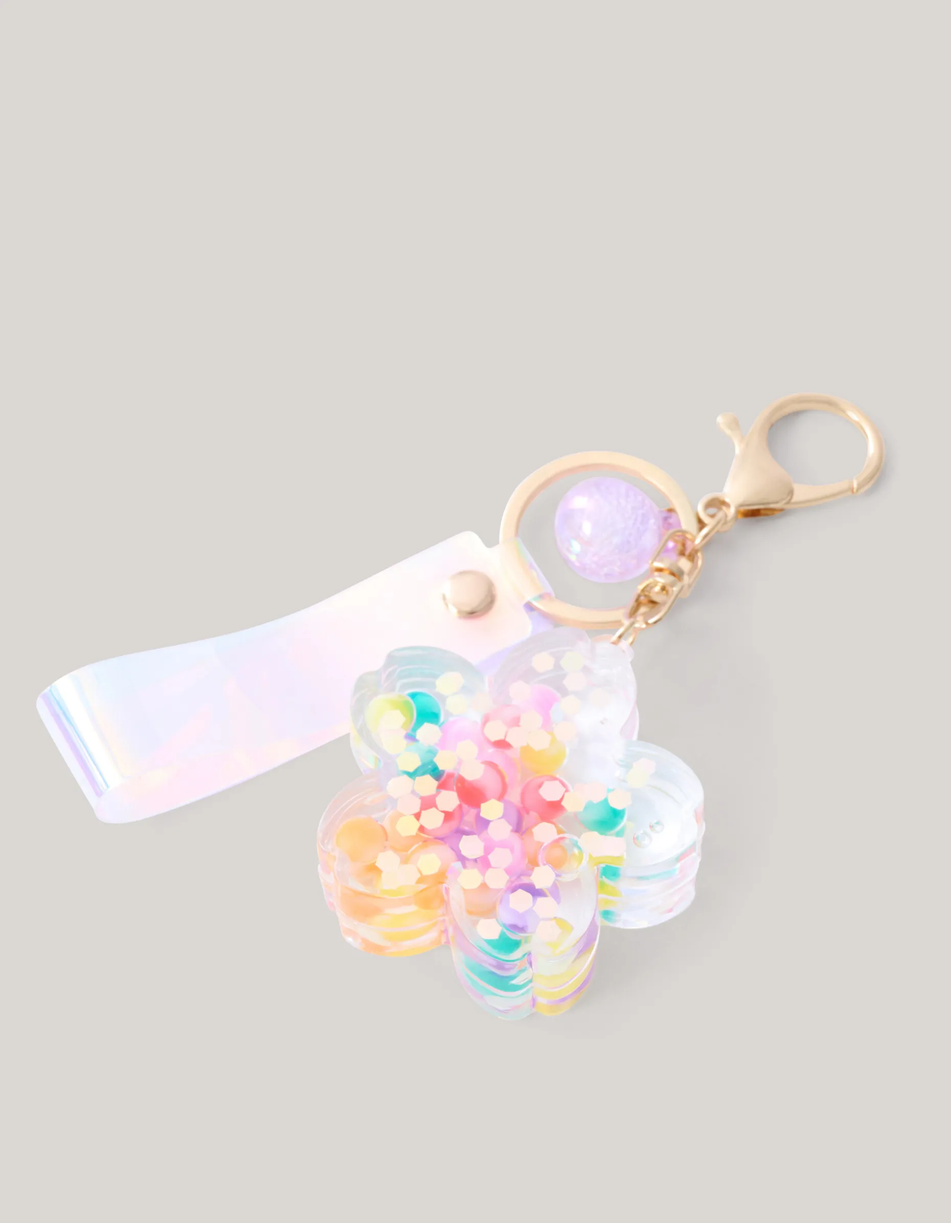 Iconic! Herken je sleutelbos uit duizenden met de Bloem Sleutelhanger Multicolor. Het item wordt gekenmerkt door de gouden ring en een holografisch bandje. Daarnaast hangt er aan de ring een grote transparante bloem. Perfect om je sleutelbos mee bij te houden