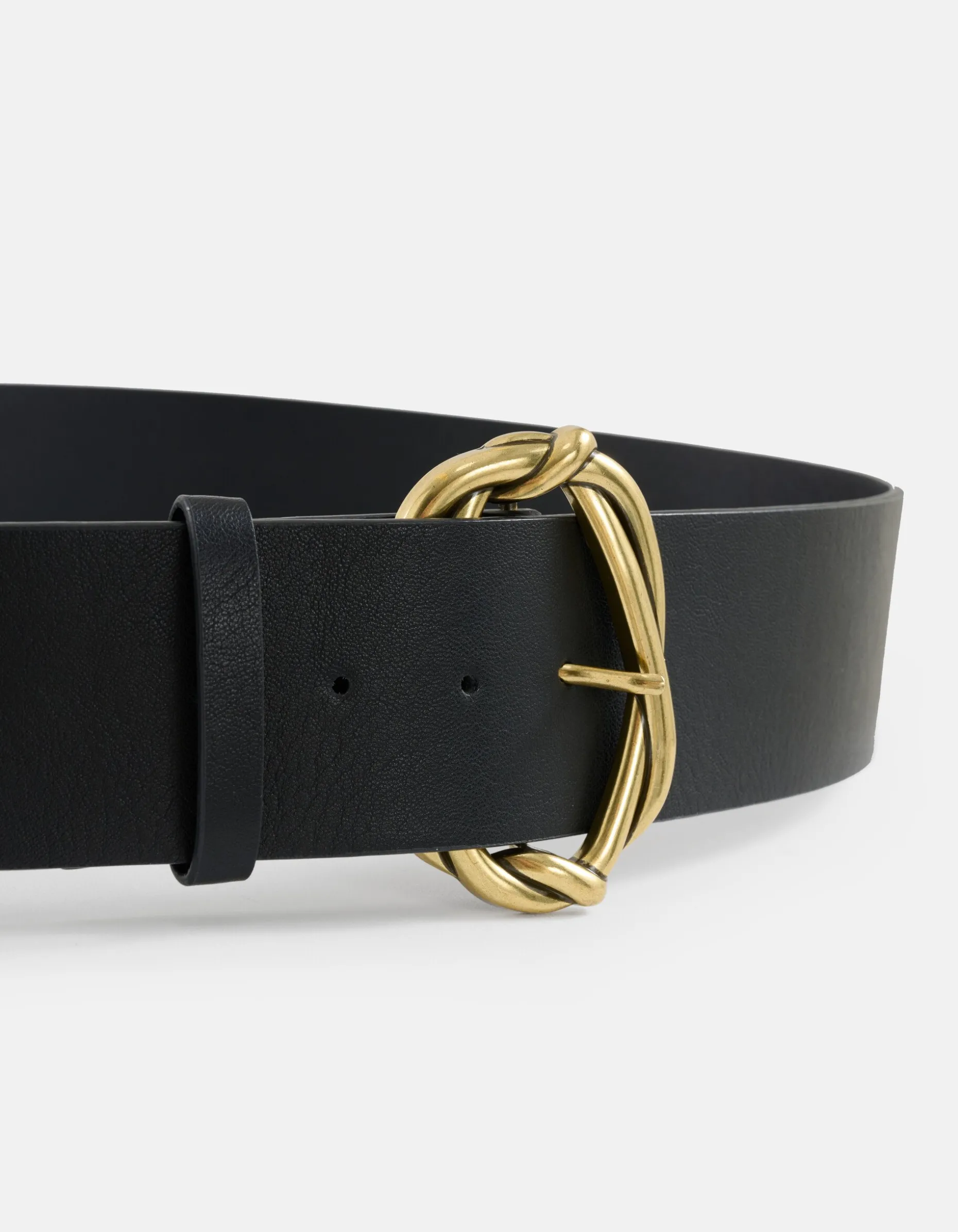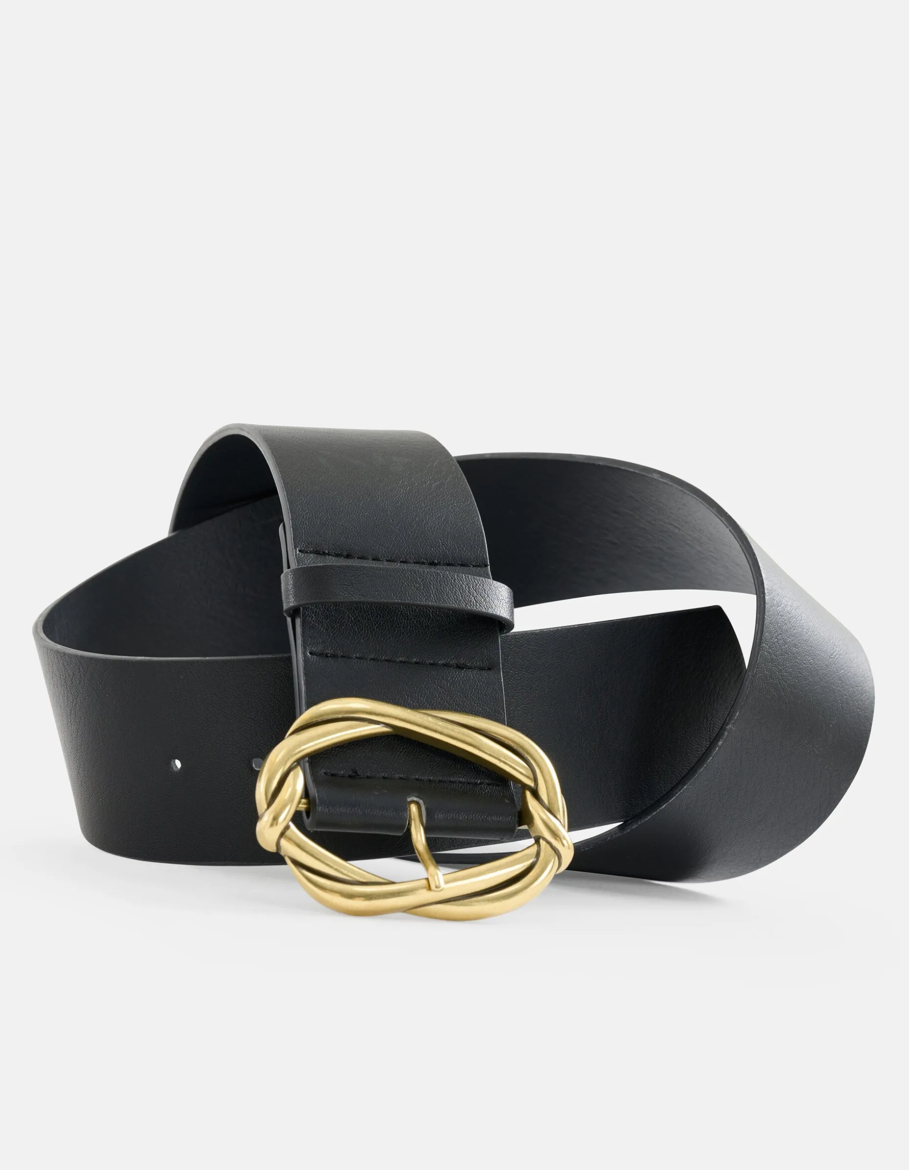 Trending! De Braided Buckle Riem wordt gekenmerkt door de zwarte kleur en een gouden gesp met gedraaide details. Verder is de riem breed, waardoor deze mooi in de taille valt. De riem is gemaakt van vegan leer en heeft vijf verstelgaatjes. Het artikel heeft een breedte van 6,5 cm. De standaard lus lengte van een jeans is 3,8 cm.