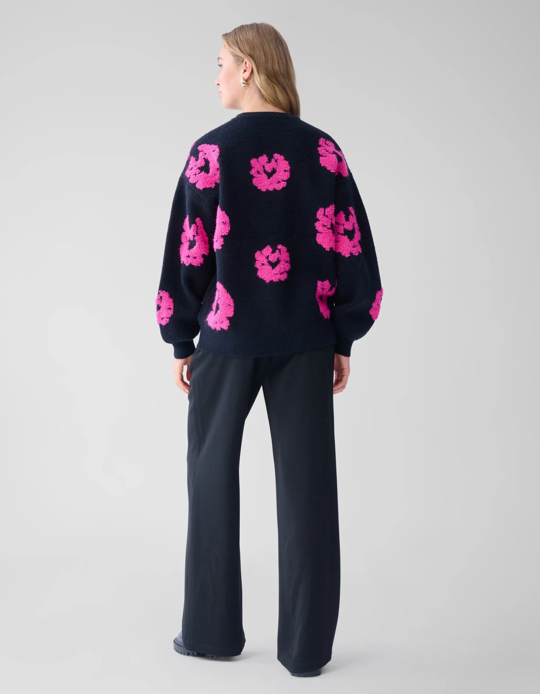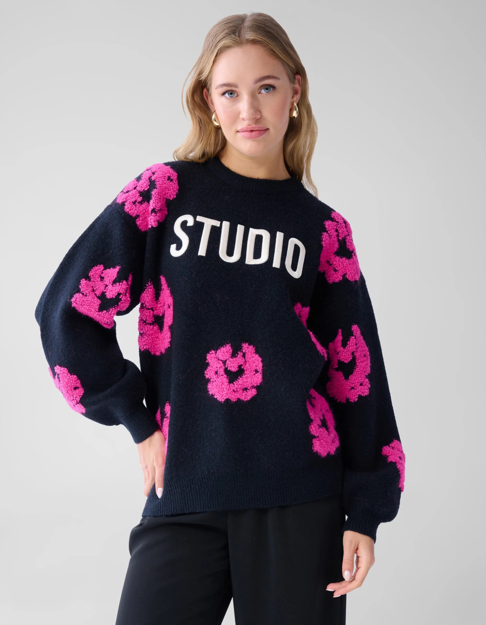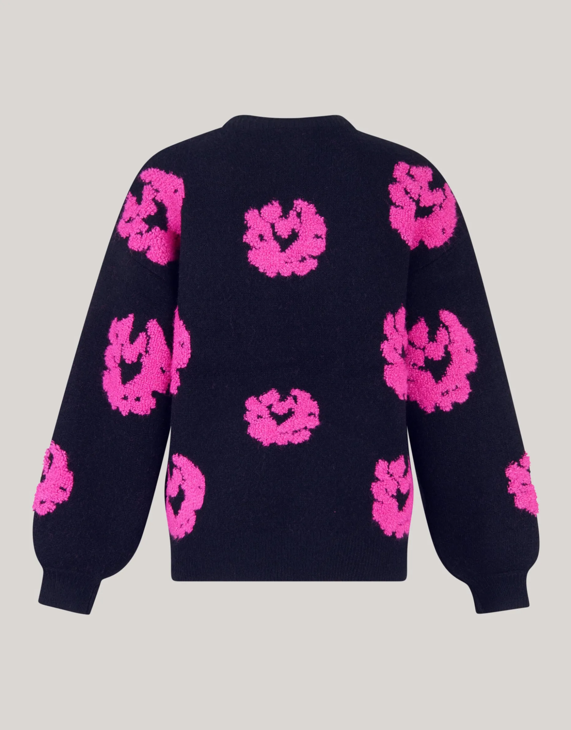 Musthave! De Contrast Trui heeft lange mouwen, een hoge ronde hals, een stretch stof, een grof breisel en een oversized fit. Het item wordt gekenmerkt door de zwarte kleur met een tekstprint en een all over bloemen print in een roze kleur. De trui is met zijn tekstprint en luxe brei een echte musthave voor dit seizoen. Het is gemaakt van polyester, polyamide en acryl. Door deze samenstelling is het sterk van kwaliteit, comfortabel en voelt het even warm als wol aan. Maak de outfit compleet met een rok en een paar killer heels voor een edgy look. Het item heeft een totale lengte van 65,5 cm bij maat XS/S. Het model heeft een totale lengte van 176 cm en draagt maat XS/S. Er wordt geadviseerd om de trui liggend de laten drogen en op het programma wolwas te wassen.