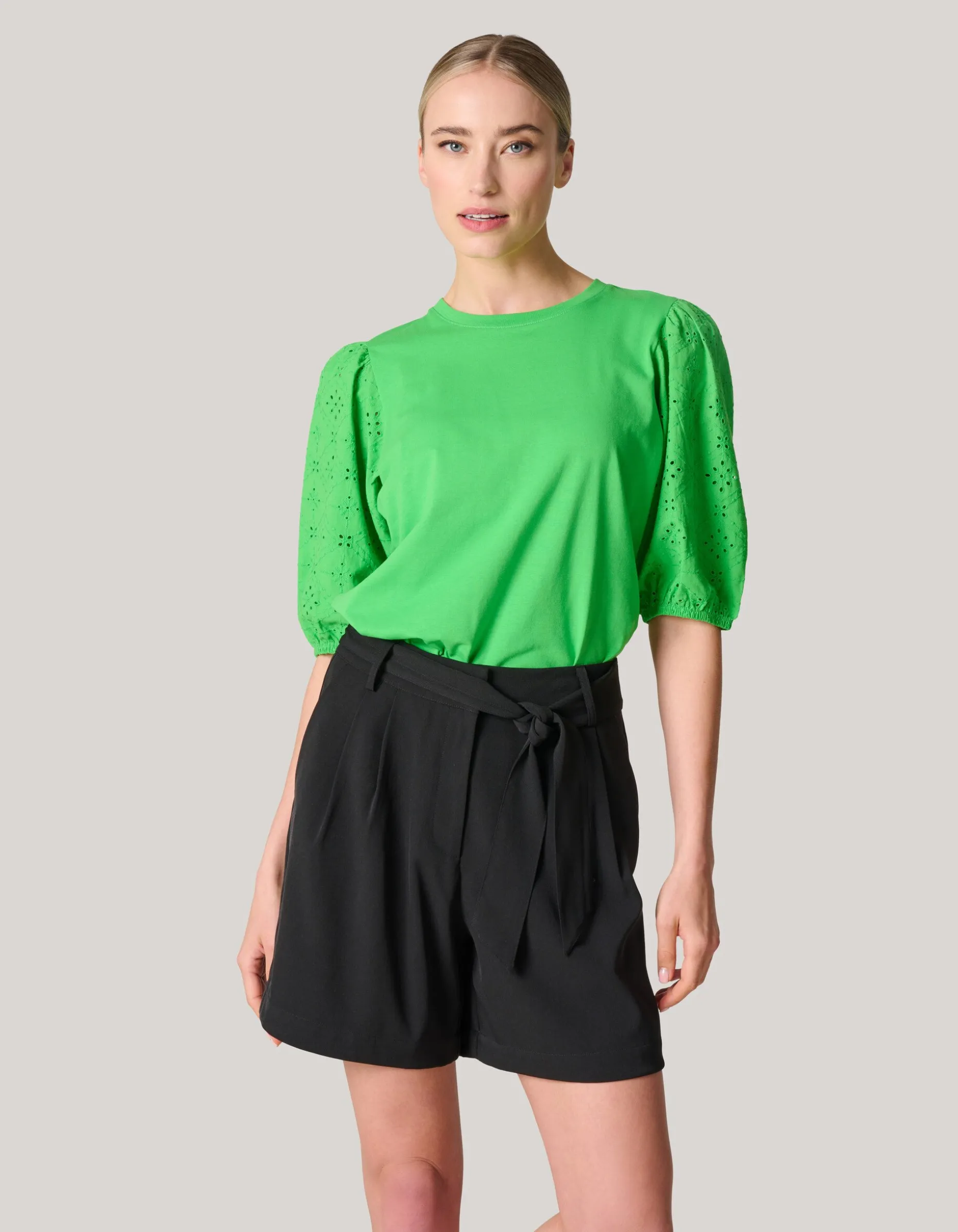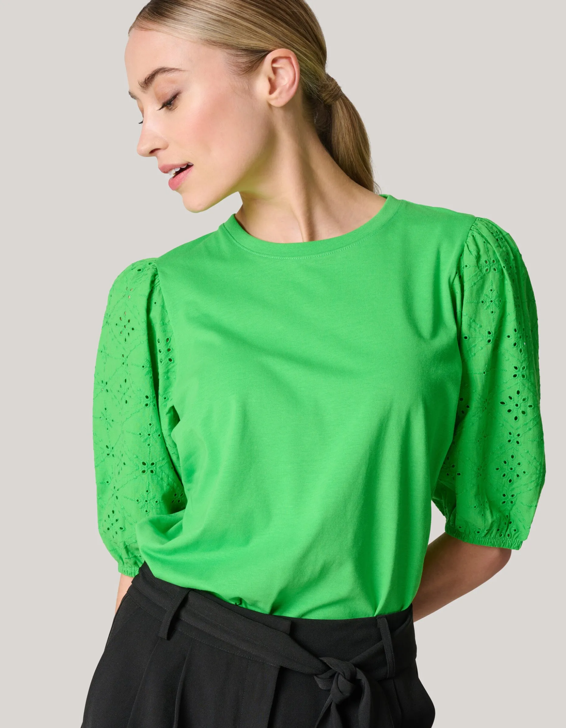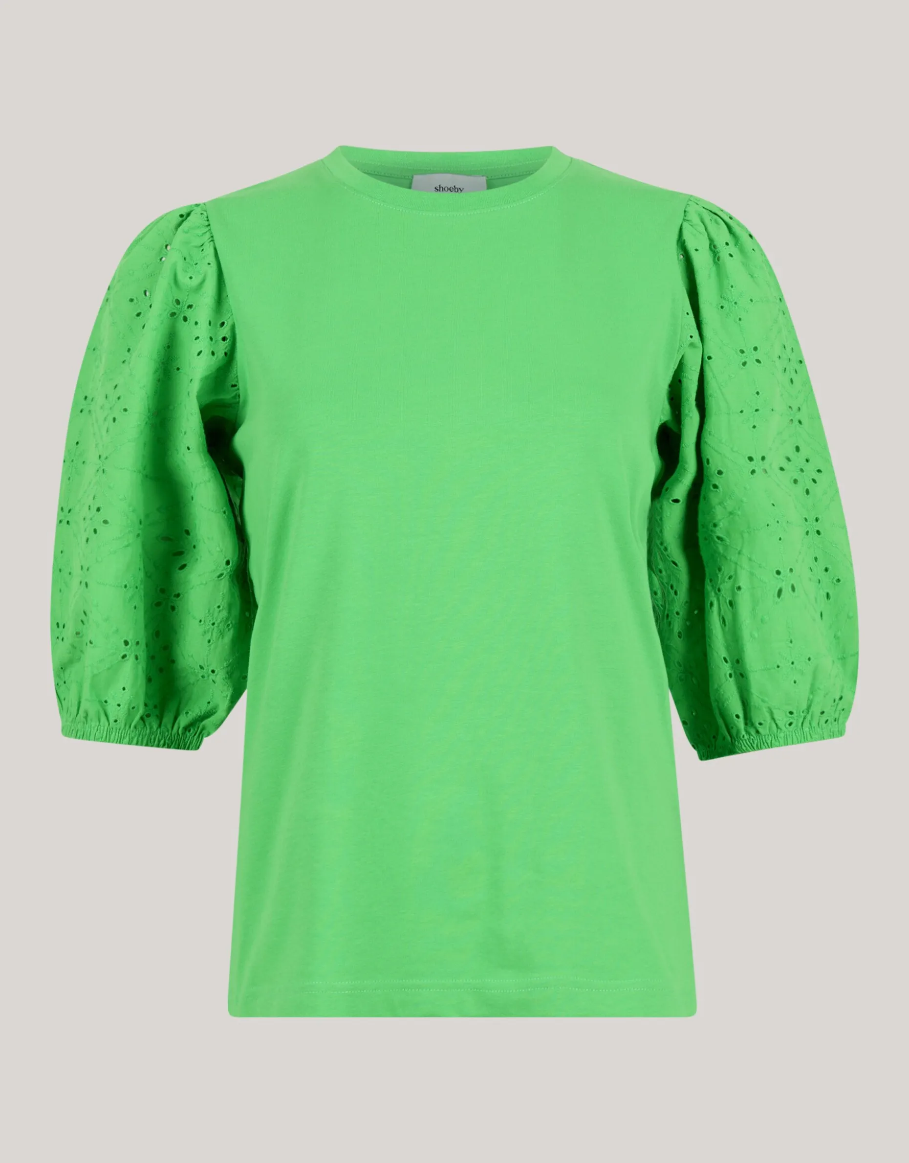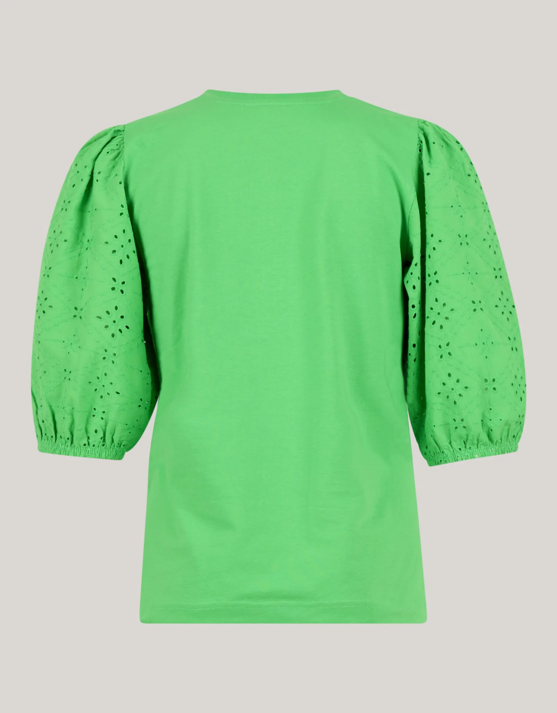Het Embroidery Pofmouw T-shirt wordt gekenmerkt door de groene kleur, de korte mouwen, een ronde hals, een stretch stof en een regular fit. Een leuk detail zijn pofmouwtjes met embroidery details. Verder is het t-shirt gemaakt van katoen en elastaan. Hierdoor is het comfortabel en zit er stretch in.