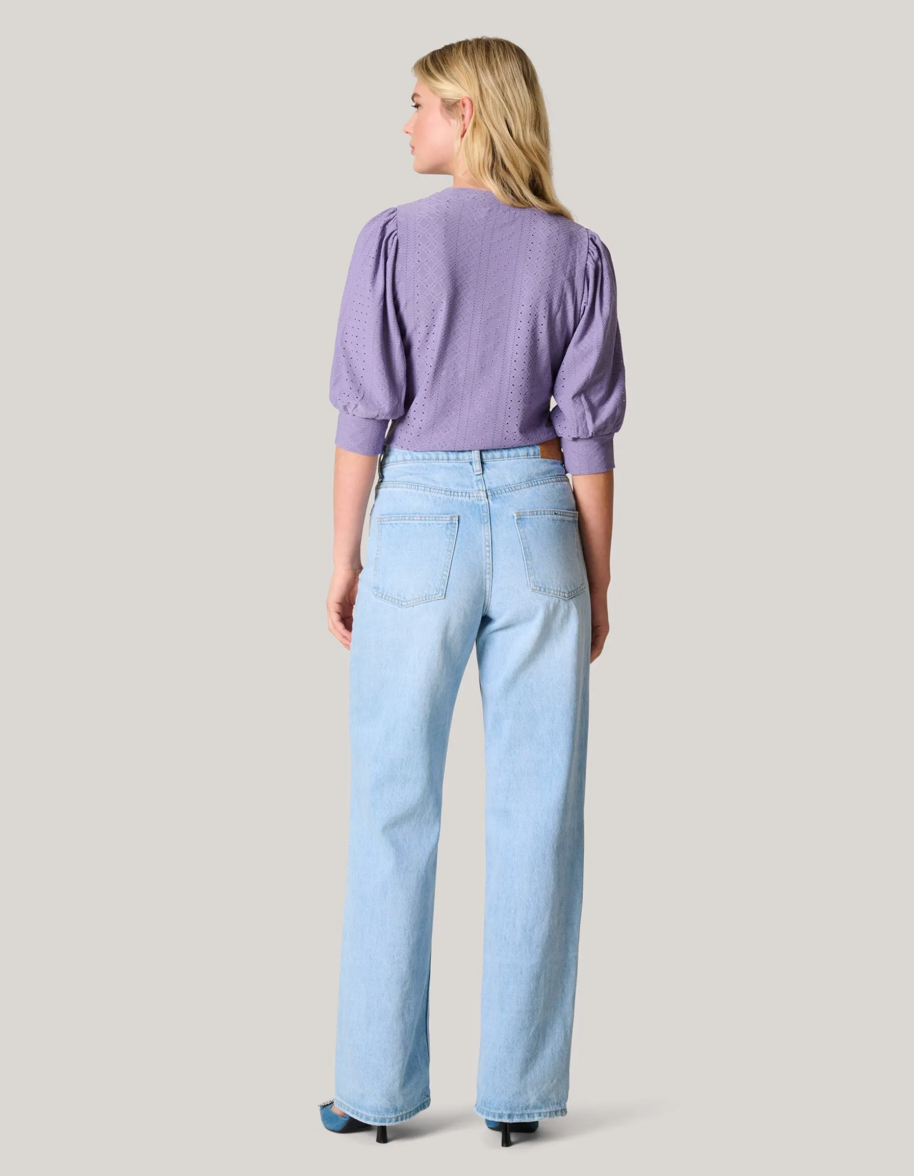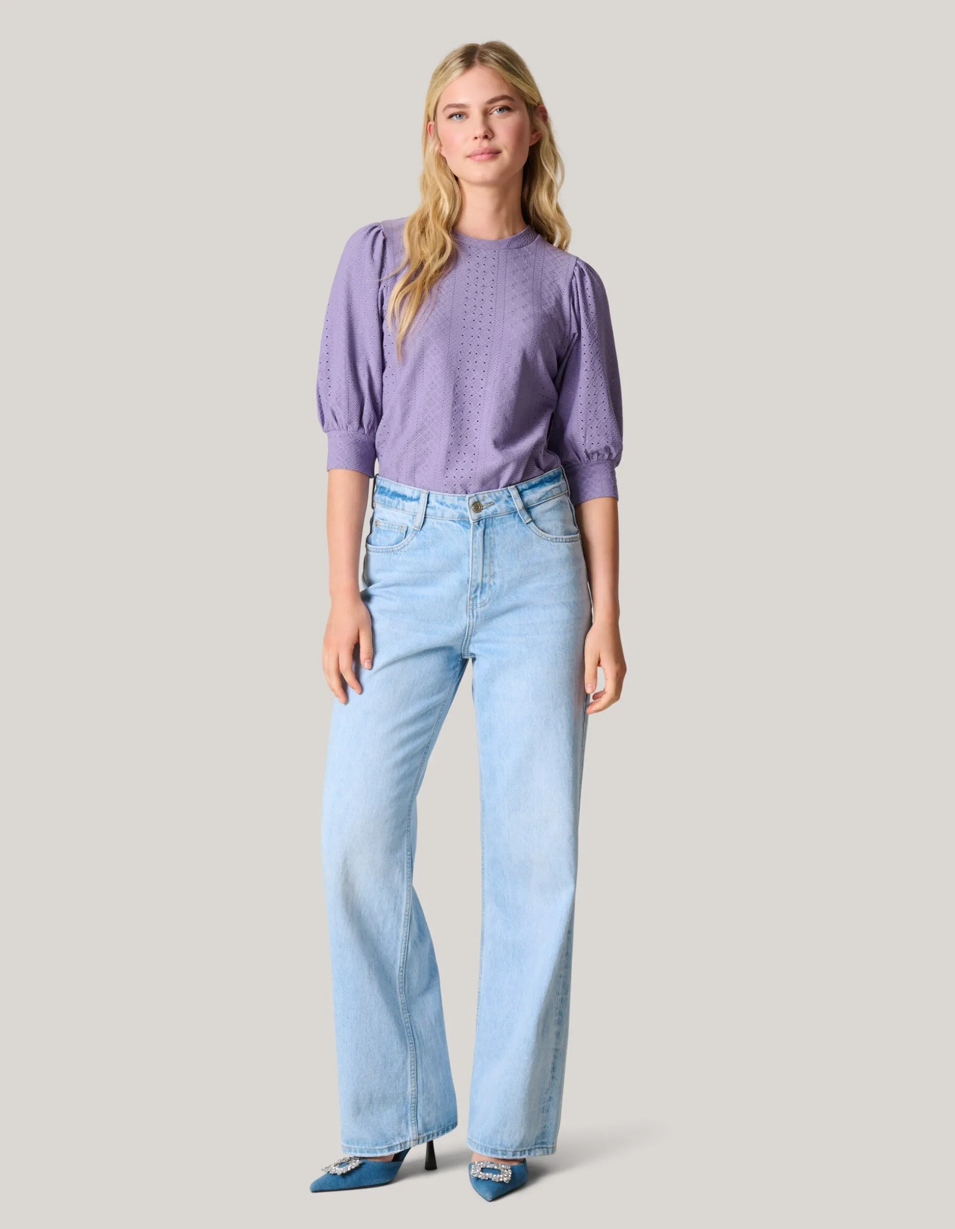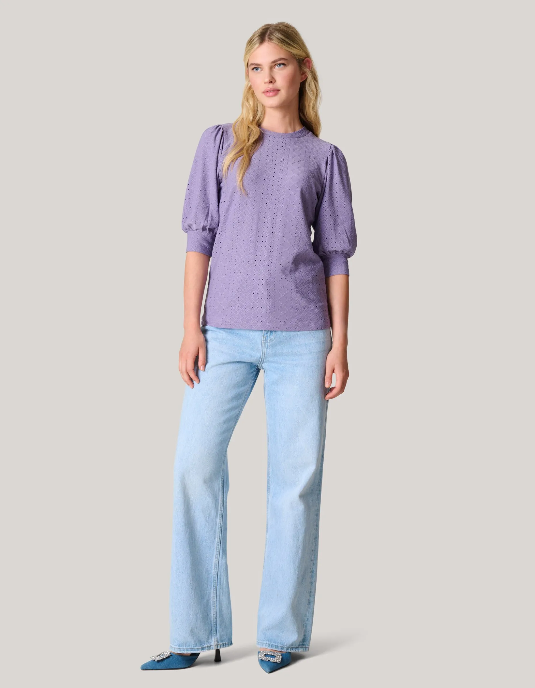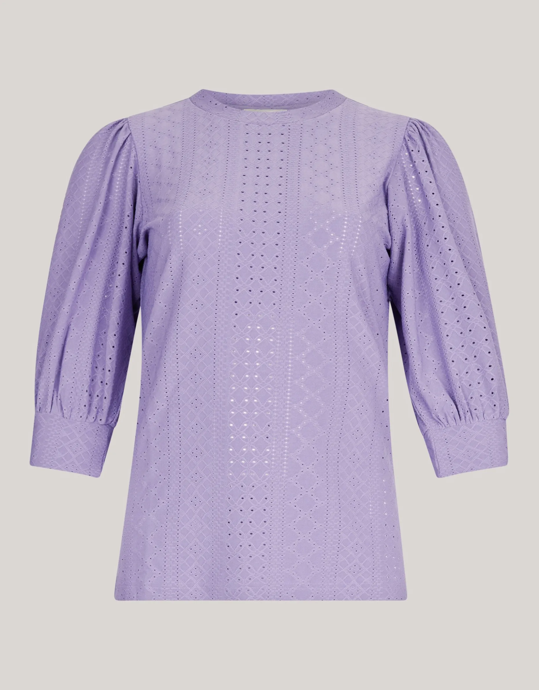 Perfect in purple! De Embroidery Top heeft driekwartsmouwen, een ronde hals en een regular fit. Het item wordt gekenmerkt door de paarse kleur met een all-over opengewerkt patroon. Door dit patroon is de longsleeve licht transparant van stof. Heb je dit liever niet? Combineer dan een Shoeby basis top voor eronder. Het is gemaakt van katoen en elastaan. Door deze samenstelling is het sterk van kwaliteit, vormvast en comfortabel. Draag het samen met jouw favoriete broek en je bent ready to go! Het artikel heeft bij maat S een totale lengte van 61 cm.