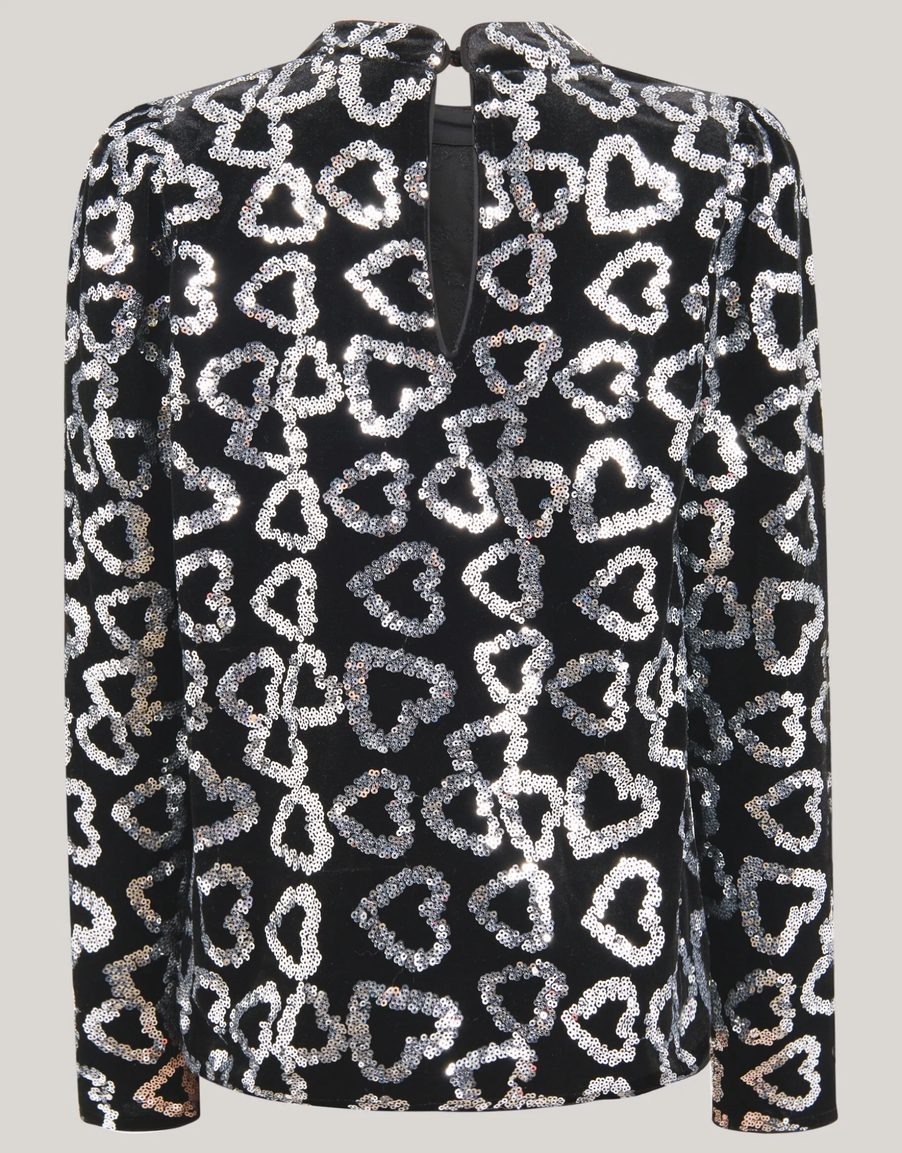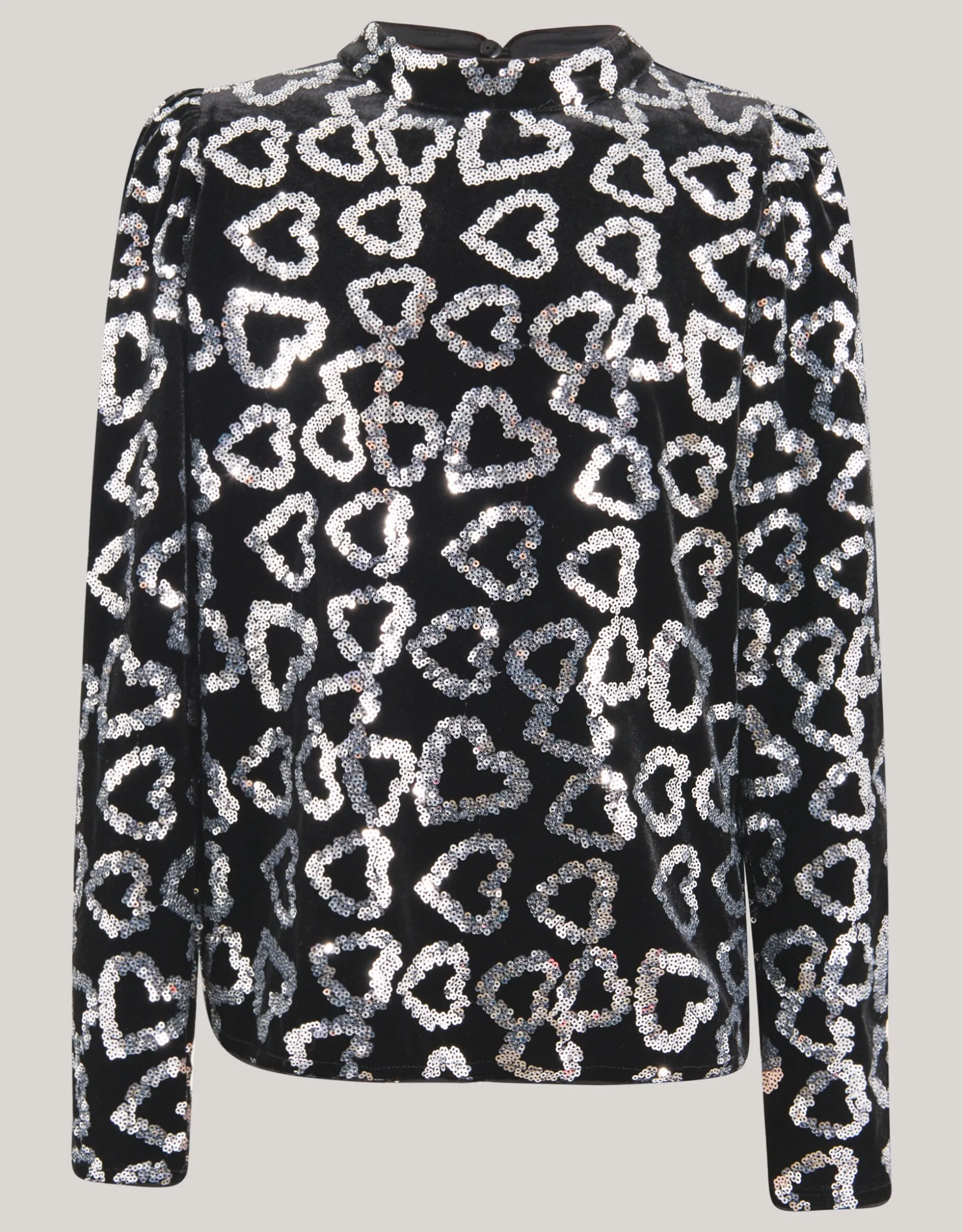Laat je stralen met deze sprankelende top vol zilveren hartjes! De top heeft een knoopsluiting, hoge ronde hals, regular fit en een zwarte kleur. Verder wordt de top gekenmerkt door de zilveren glitter hartjes all-over de top. Het item is gemaakt van polyester en elastaan. Deze samenstelling zorgt ervoor dat de top sterk van kwaliteit, vormvast en subtiel rekbaar is. Combineer met je favoriete rok en schitter de hele dag door!