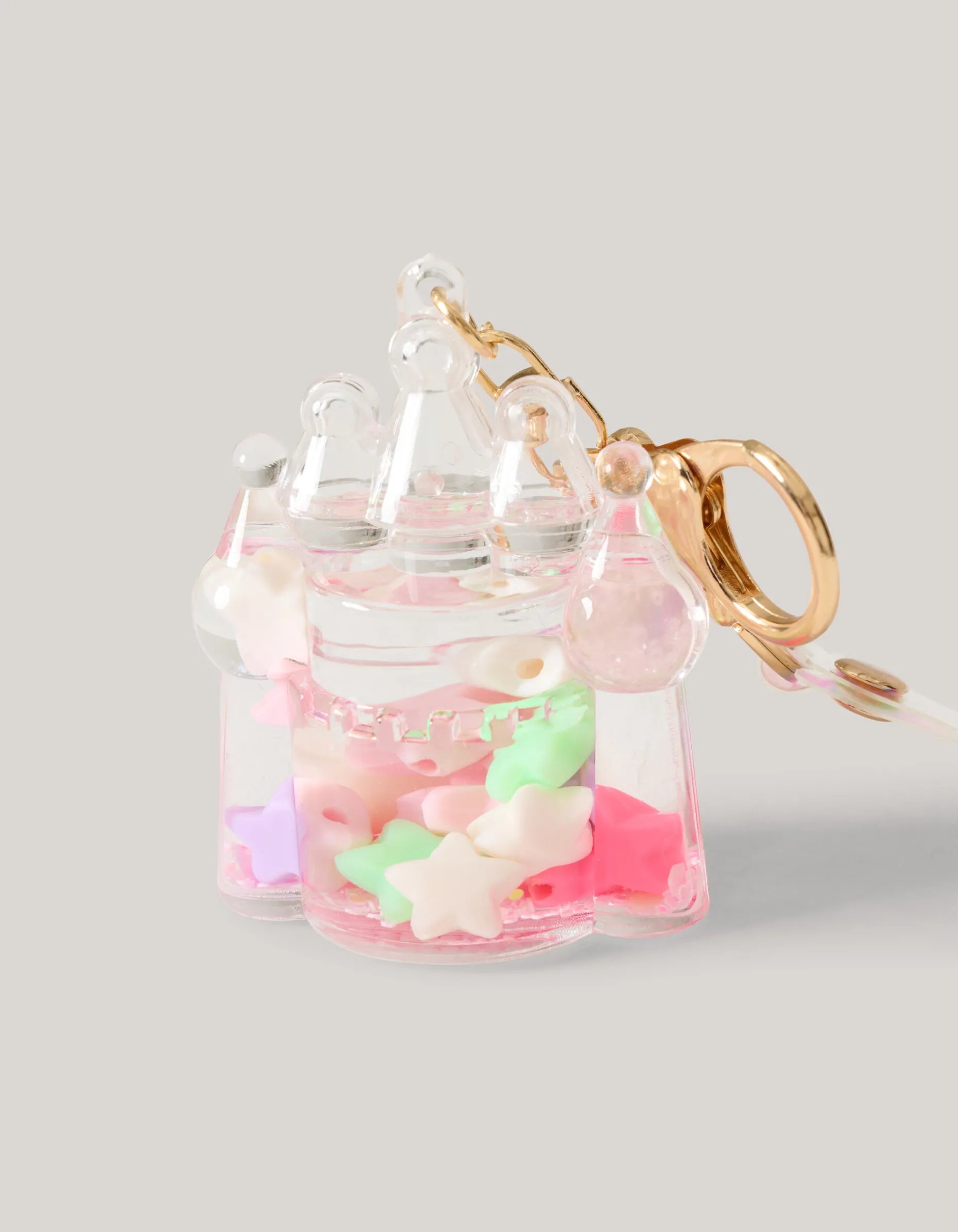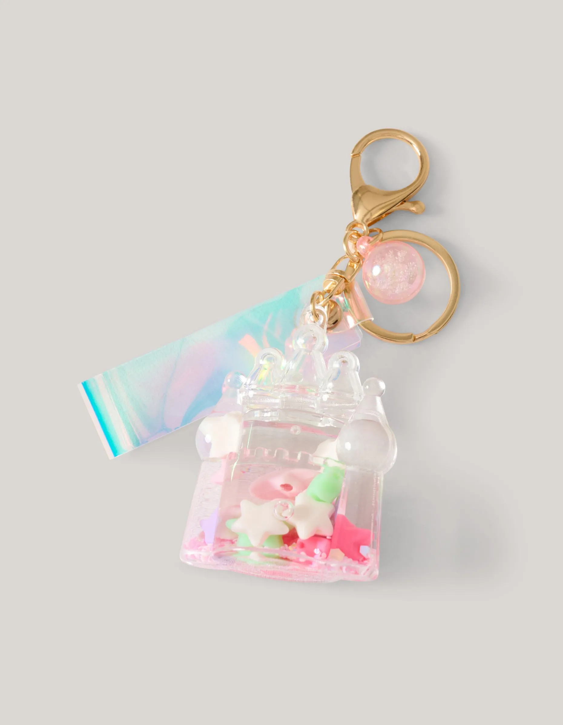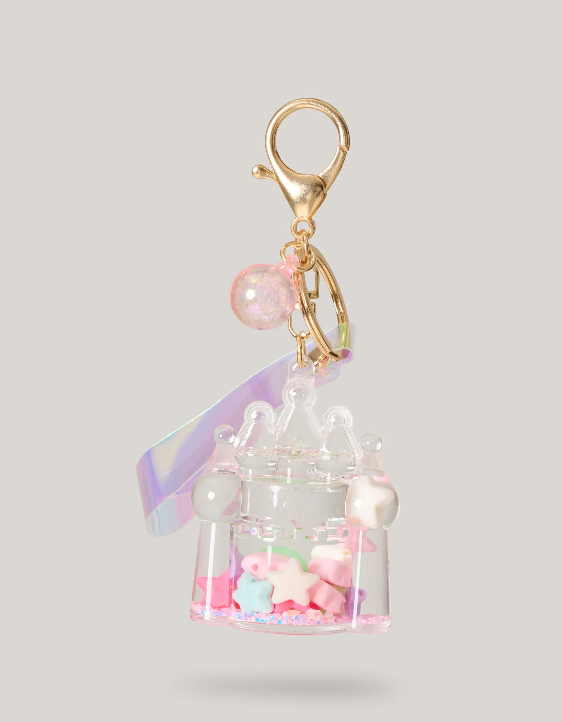 Iconic! Herken je sleutelbos uit duizenden met de Kasteel Sleutelhanger. Het item wordt gekenmerkt door de gouden ring en een holografisch bandje. Daarnaast hangt er aan de ring een grote transparante kasteel. Een leuk detail is de binnenkant van het kasteel. Hierin zit een vloeistof met gekleurde sterretjes. Perfect om je sleutelbos mee bij te houden.