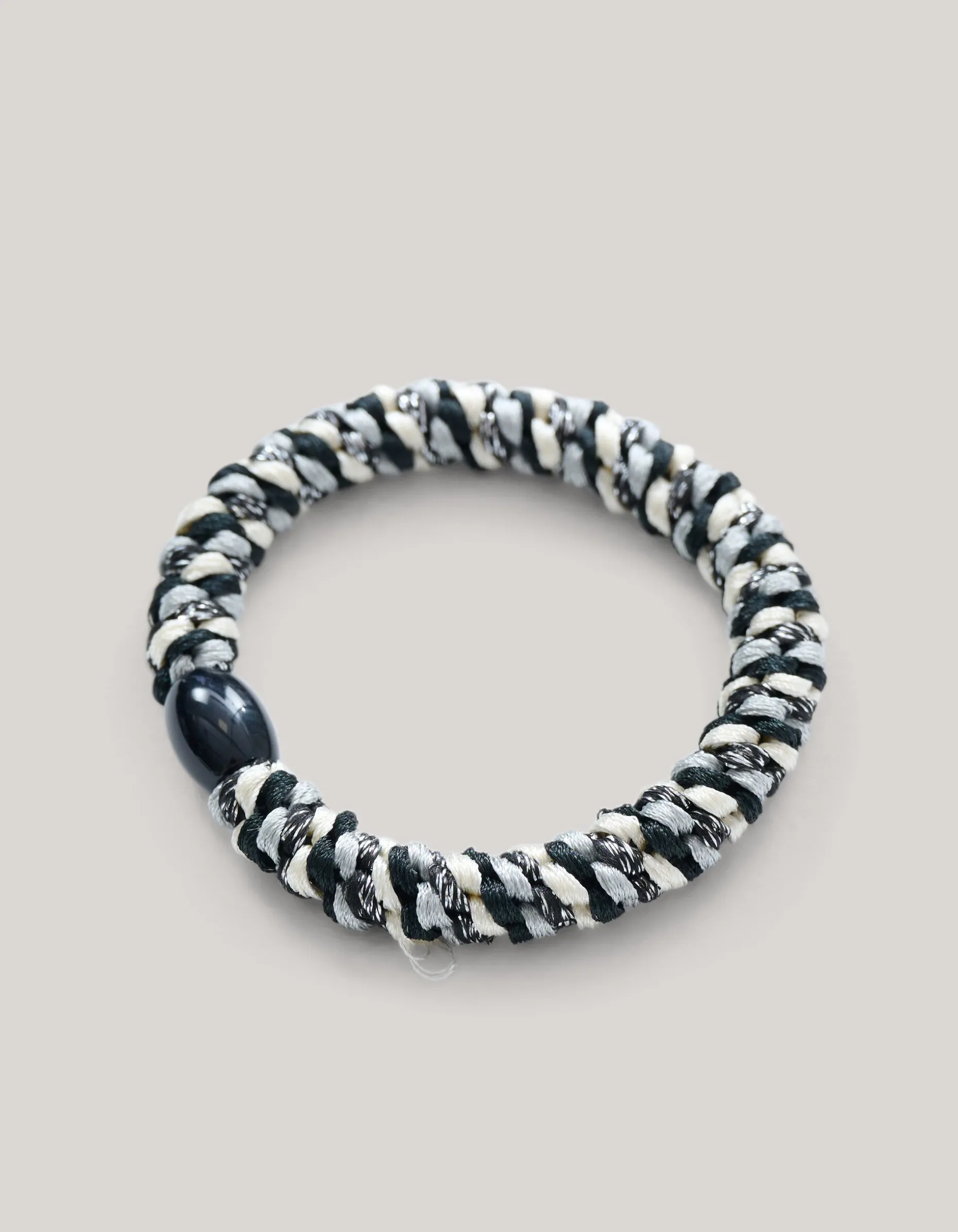 Stay on trend met deze te leuke haarelastiek. Het item wordt gekenmerkt door de grijze kleur met offwhite en zwarte details. Verder heeft het elastiek een metallic lurexdraad er doorheen verwerkt. Door het lurexdraad gaat het elastiek subtiel glitteren. Leuk om je arm als armband of in je haren!