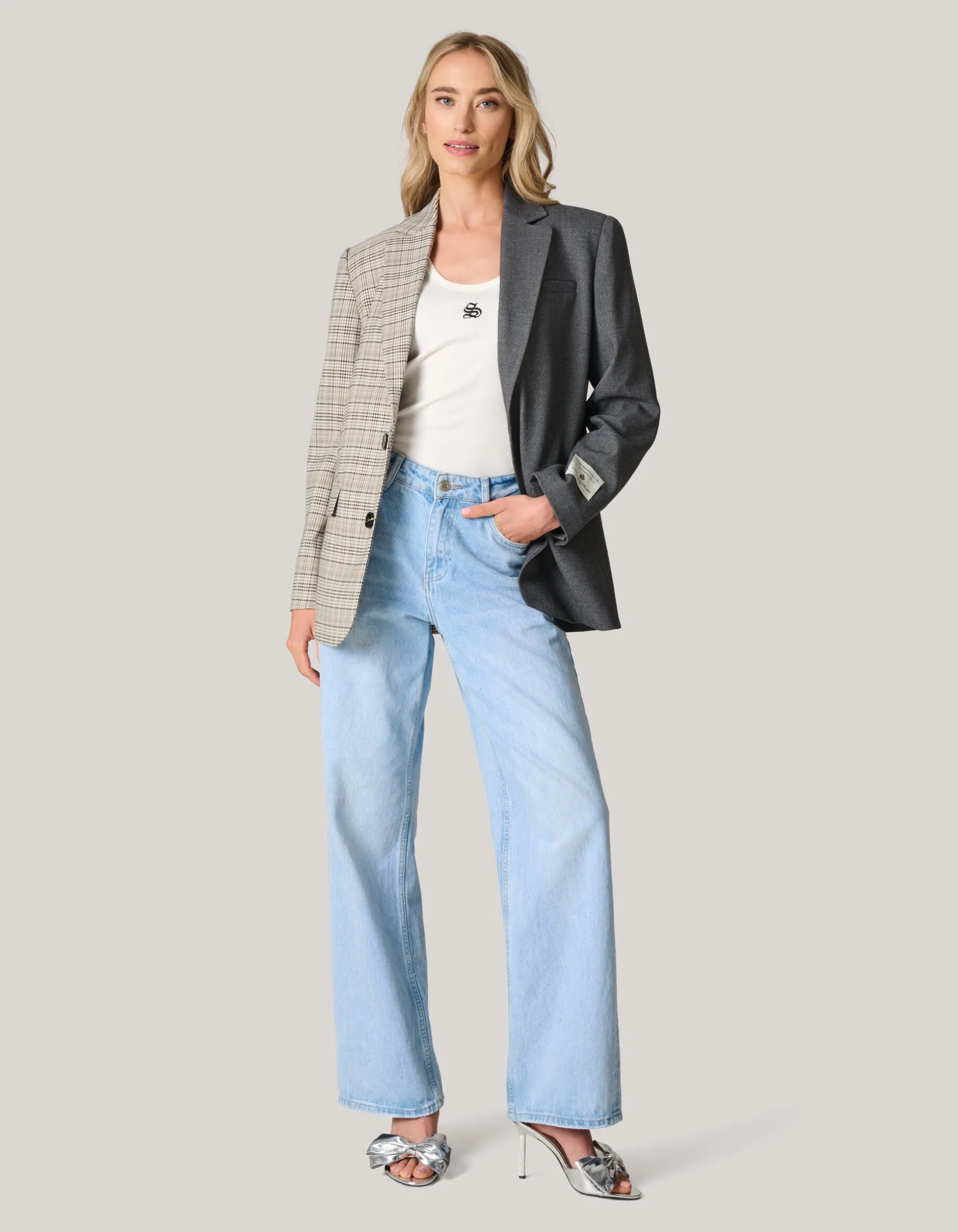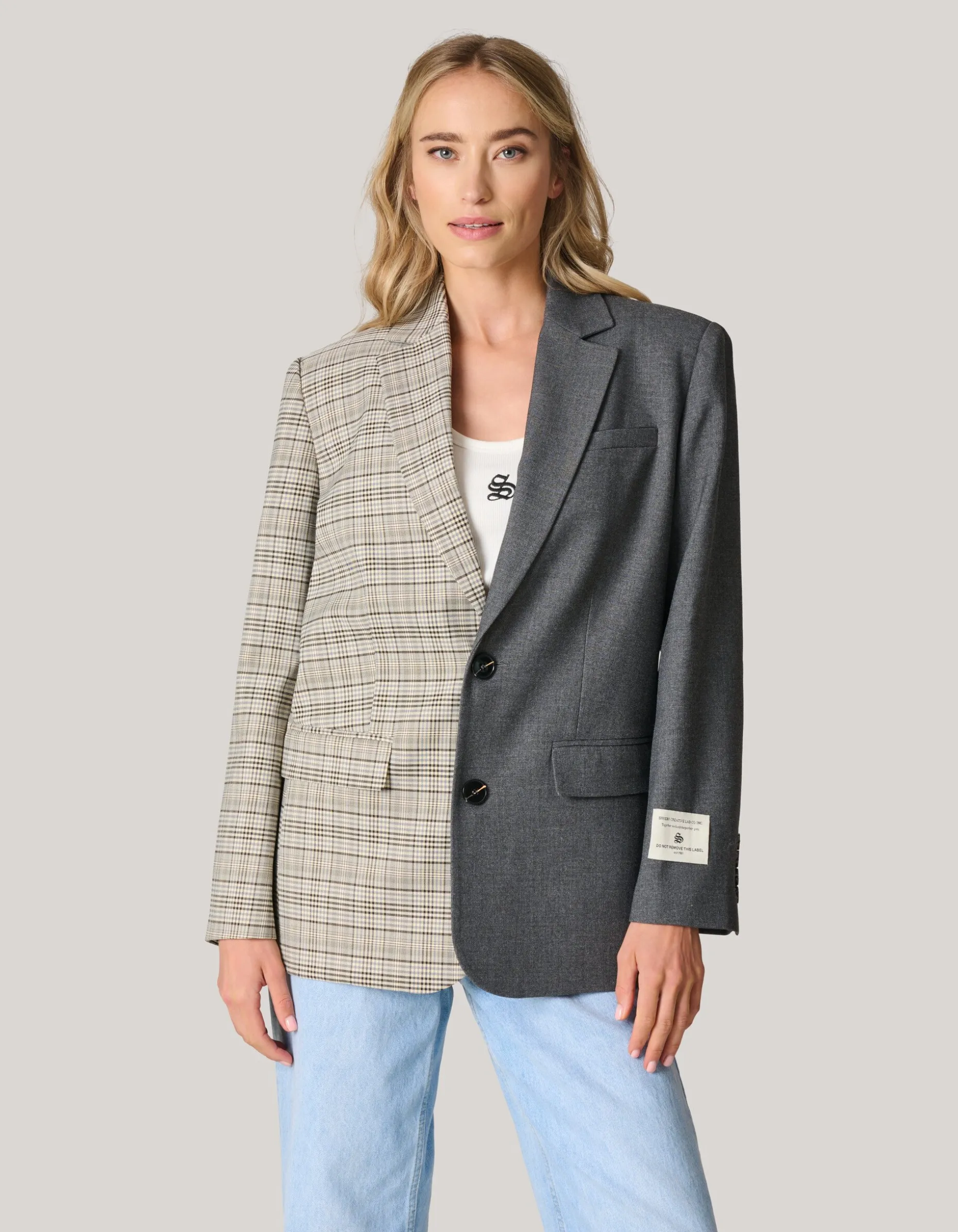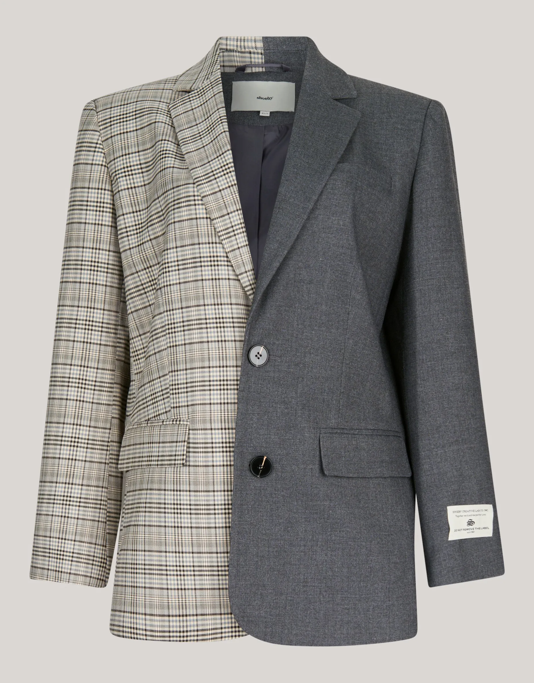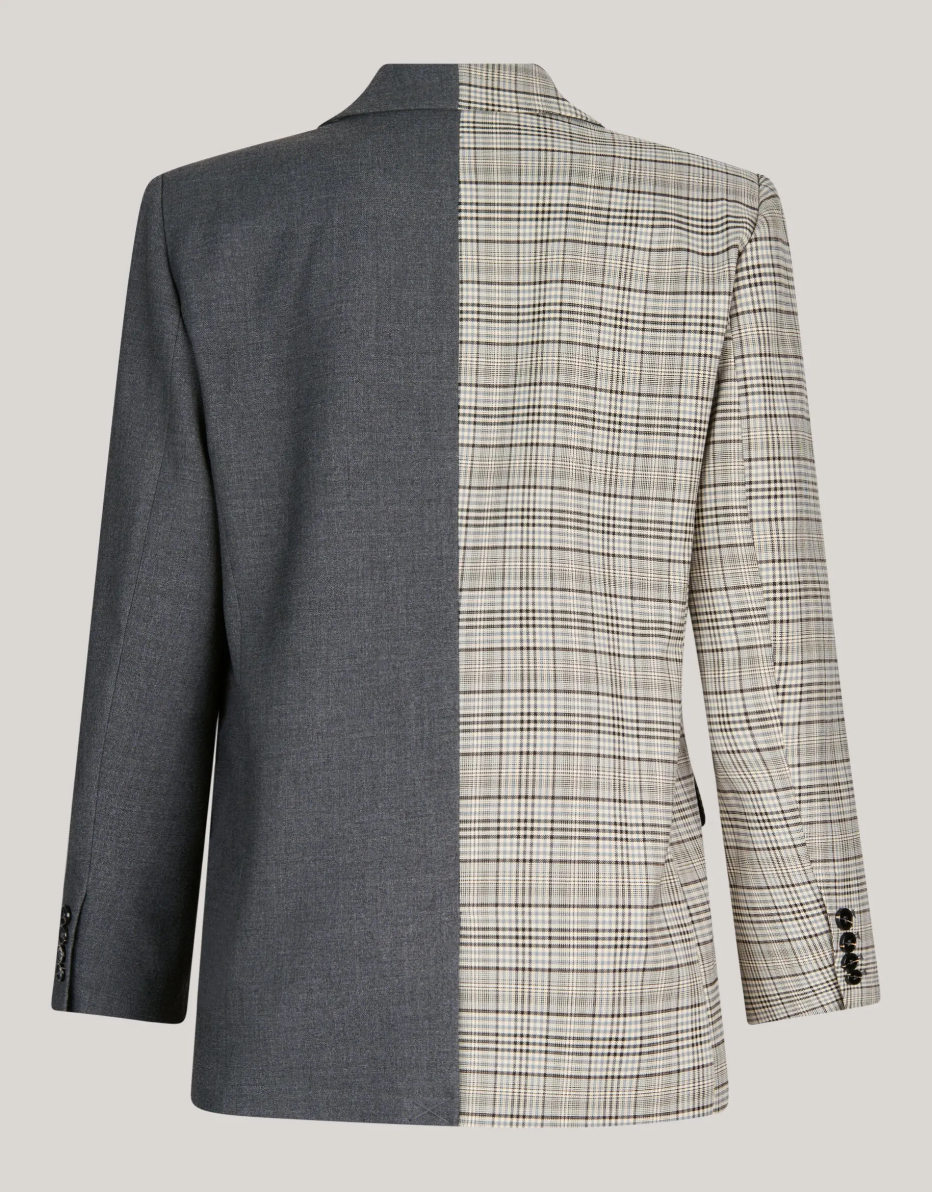 Een oversized blazer is een musthave voor in je kledingkast! De Mixed Blazer heeft lange mouwen, een oversized fit en een reverse kraag. Het item wordt gekenmerkt door de donkergrijze kleur en de andere helft van de blazer een geblokte lichtgrijze kleur. Een leuk detail het label aan de onderkant van de mouw voor een speels effect. Daarnaast heeft de blazer subtiele schoudervullingen en twee klepzakken aan de voorzijde. Stroop de mouwen op voor een stoerder effect. Het item is gemaakt van polyester, viscose en elastaan, hierdoor is het vormvast, sterk van kwaliteit en draagt het comfortabel. Combineer het samen met de bijpassende Cargo broek voor een complete look! De totale lengte van het item is 72 cm bij maat XS/S.