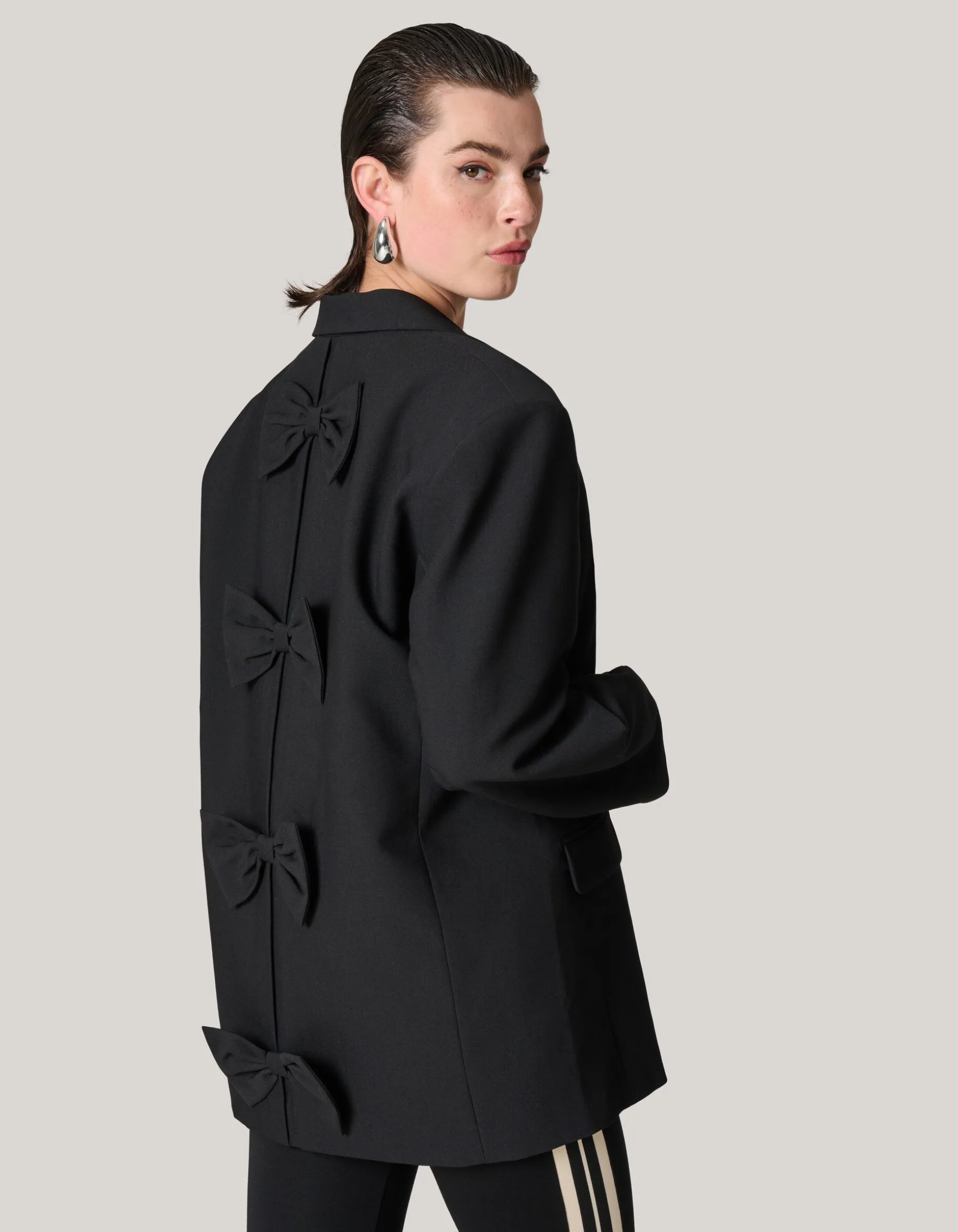 Iconic! De Oversized Strik Blazer heeft lange mouwen, een reverse kraag, een oversized fit, een gevoerde binnenkant en een knoopsluiting. Het item wordt gekenmerkt door de zwarte kleur, de subtiele schoudervullingen en twee klepzakken op de voorzijde. Een leuk detail zijn de strikjes op de achterzijde van de blazer. Dit unieke detail geeft een luxueus effect! Het is gemaakt van polyester, viscose en elastaan. Door deze samenstelling is het sterk van kwaliteit, vormvast, kleurvast en comfortabel. Draag het samen met een wide leg jeans en top voor een stijlvolle look! De totale lengte van de blazer is 74 cm bij maat XS/S. Het model is 177 cm en draagt maat XS/S.