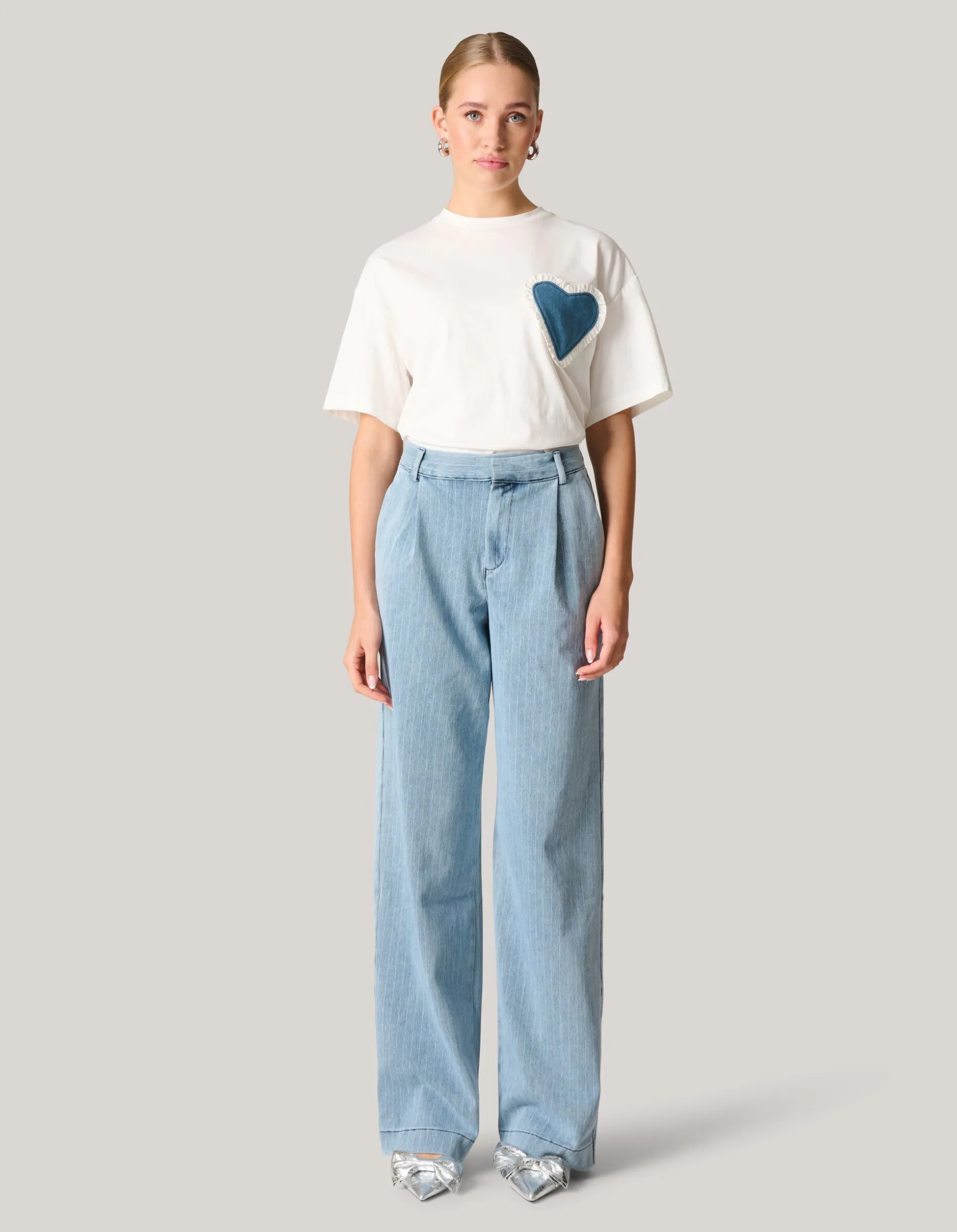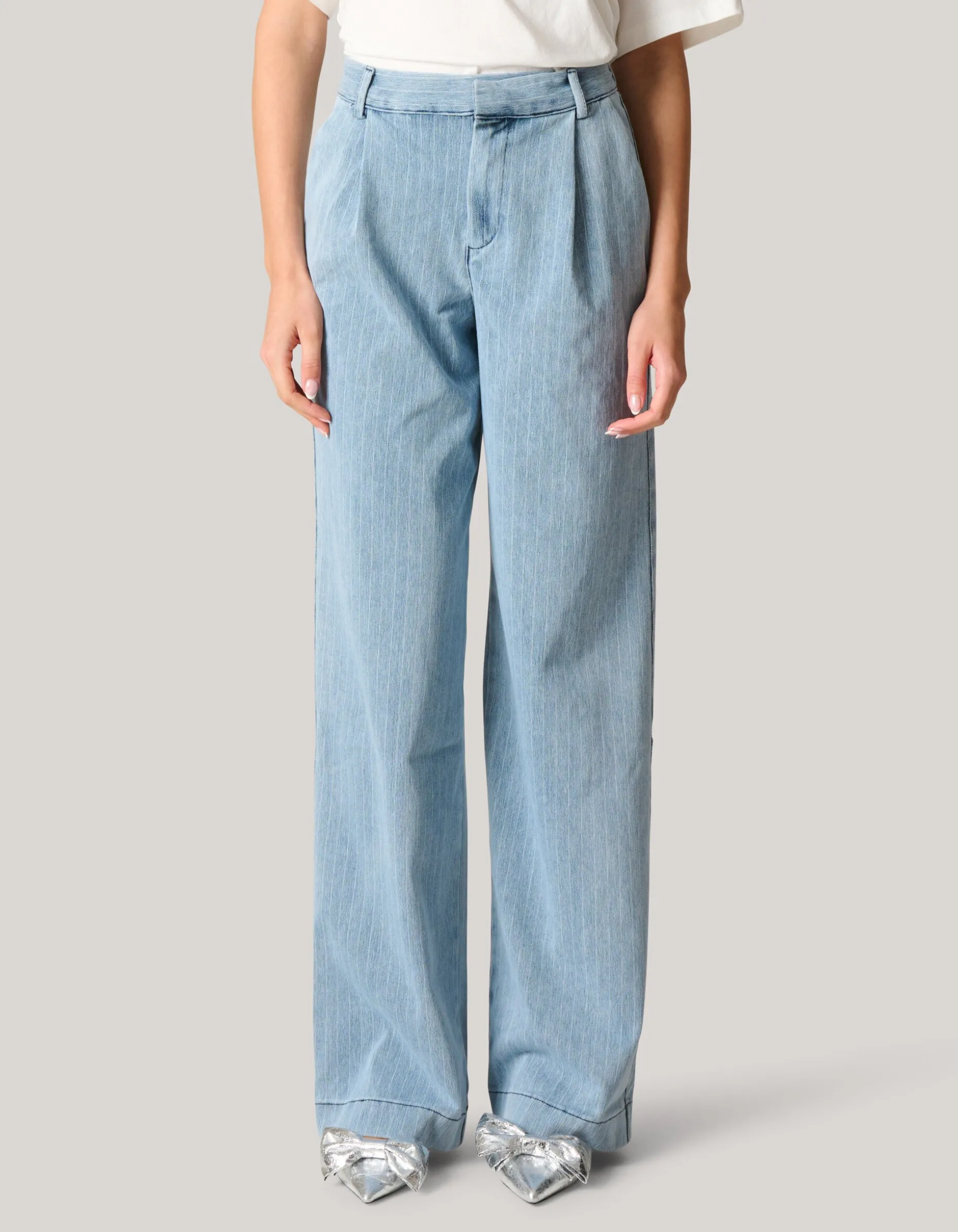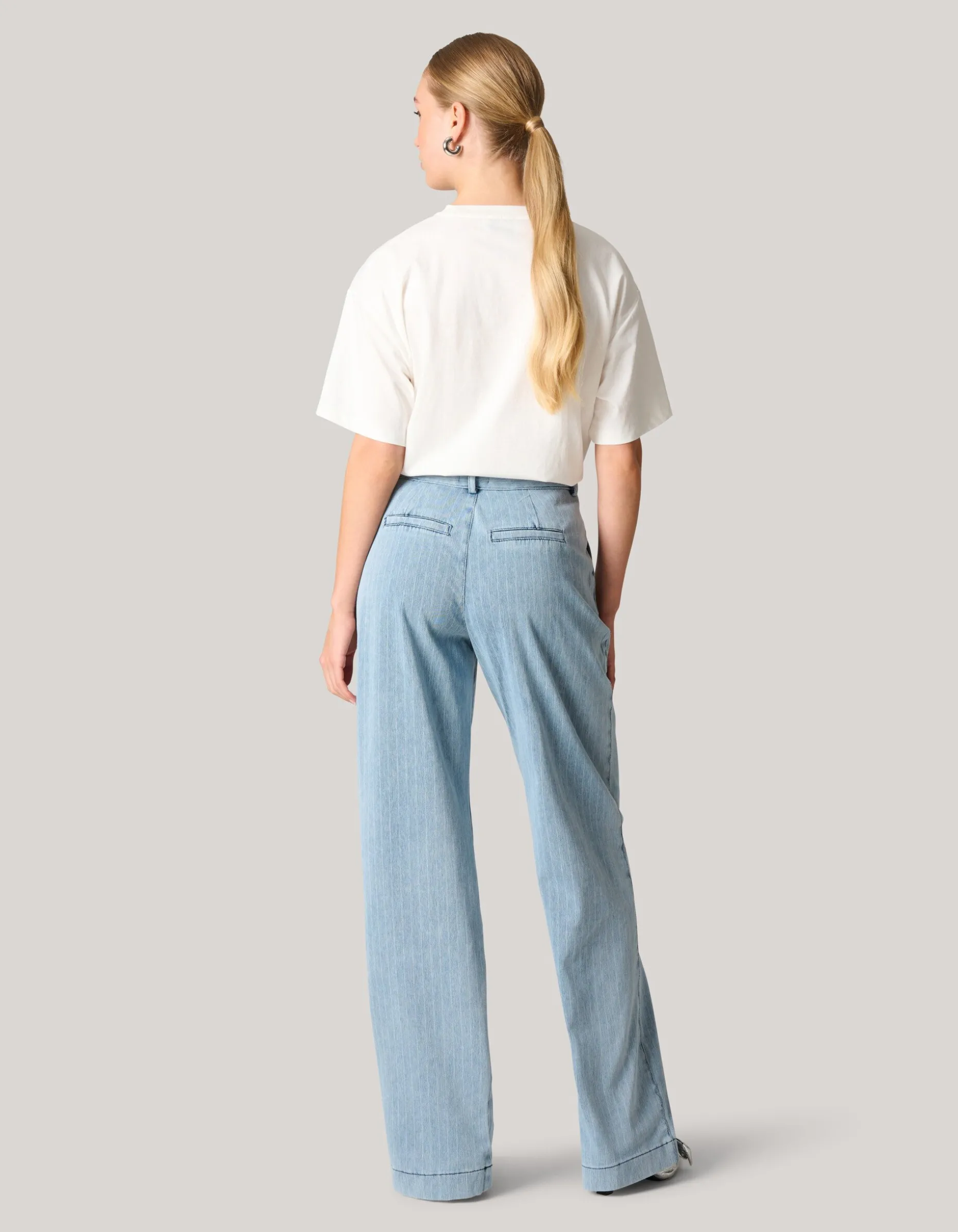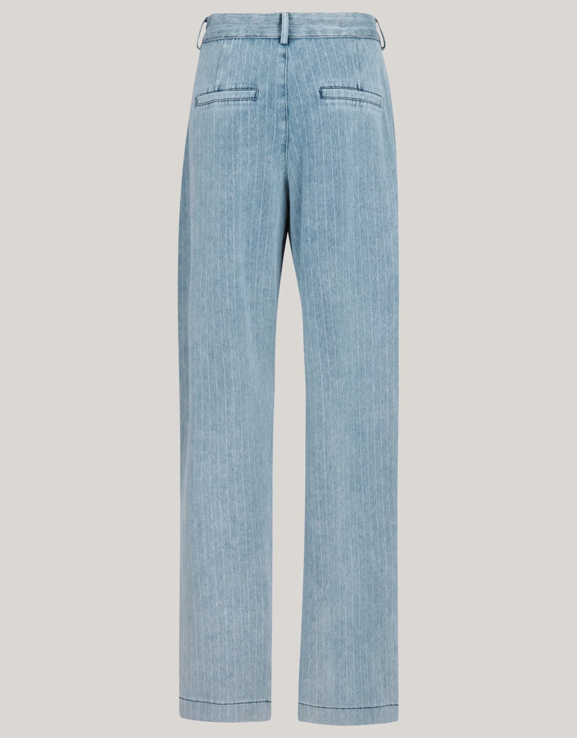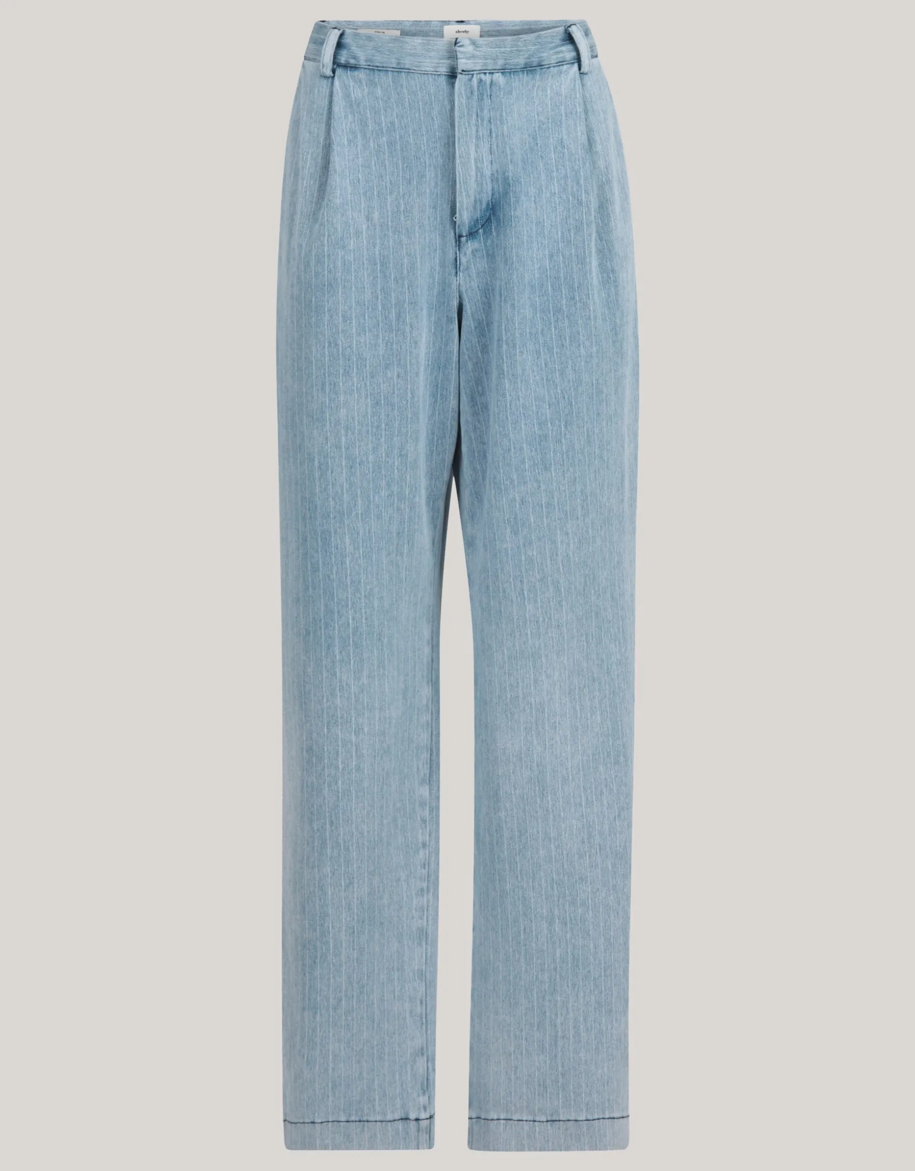 Print it! De Pinstripe Denim Jeans heeft een hoge taille, een 4-pocket model, een high-stretch stof, een loose fit model met een wide leg, lengtemaat 34 en een knoop-en ritssluiting. Het item wordt gekenmerkt door de lichtblauwe denim kleur met een all-over bleached pinstripe design in de stof verwerkt. Door dit detail krijgt de jeans een edgy twist! Verder heeft het plooitjes aan de voorzijde en witte stiksels voor de perfecte finishing touch. Draag het samen met een Shoeby tanktop en een cropped blazer voor een trending look! Het model heeft een lengte van 176 cm en draagt maat 27. Het artikel heeft een binnenbeenlengte van 87,5 cm bij maat 27.