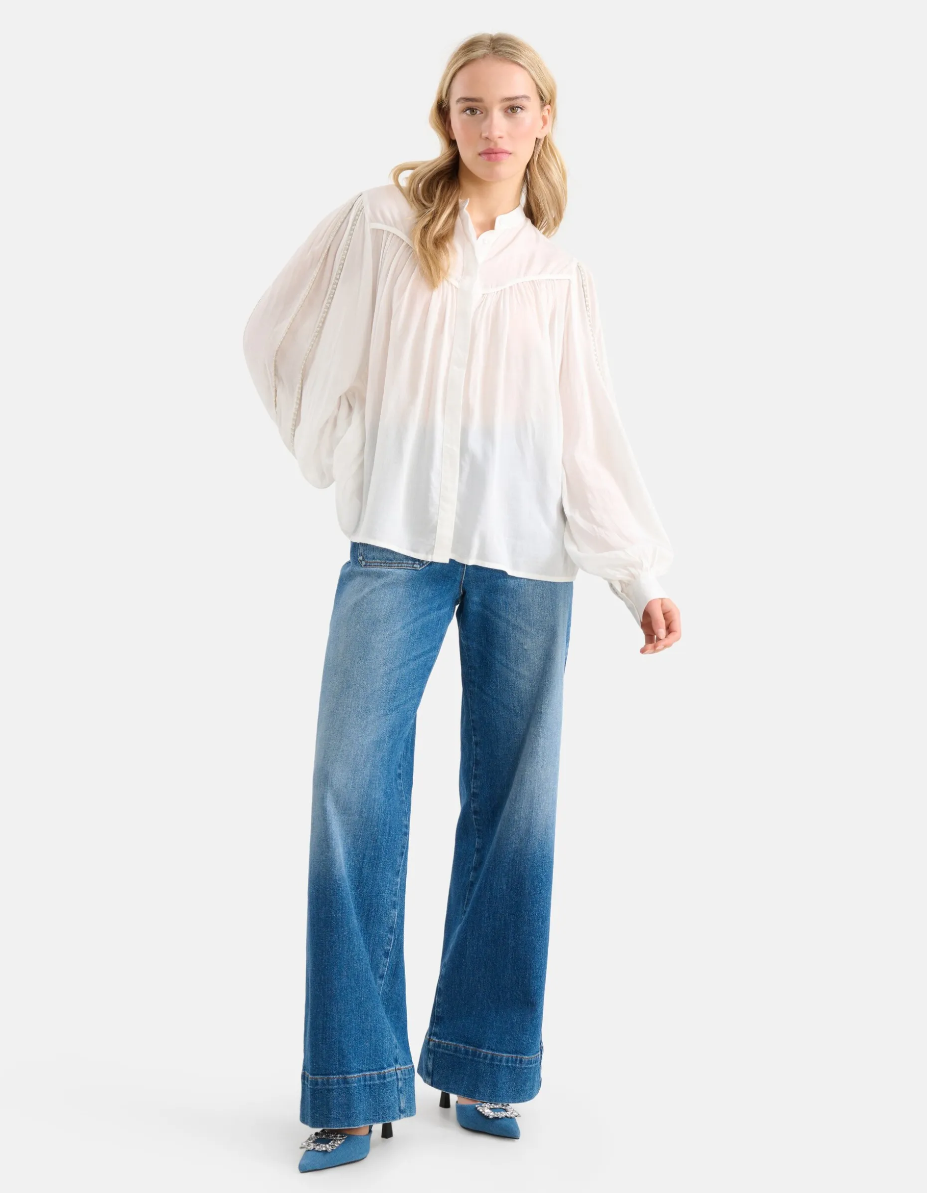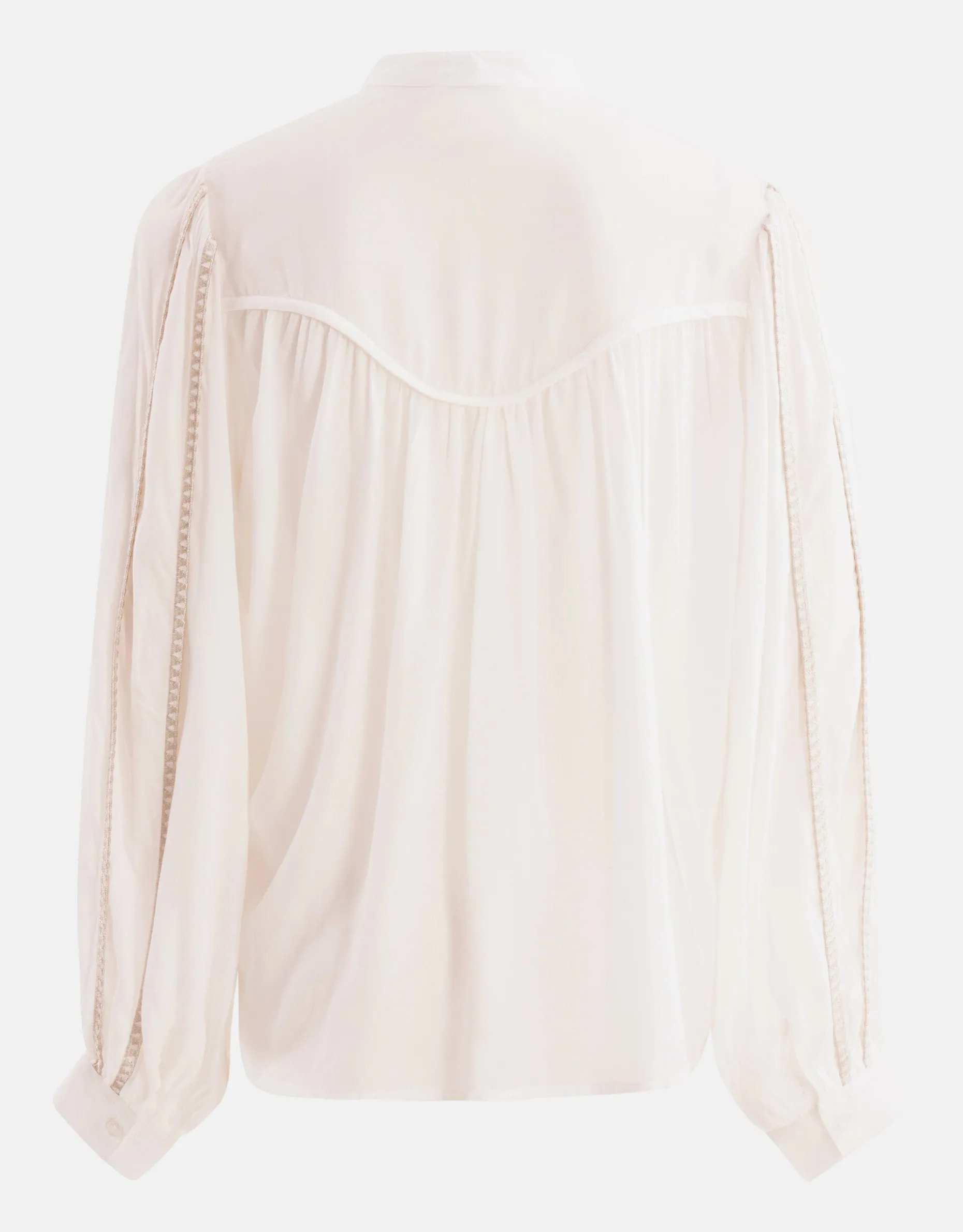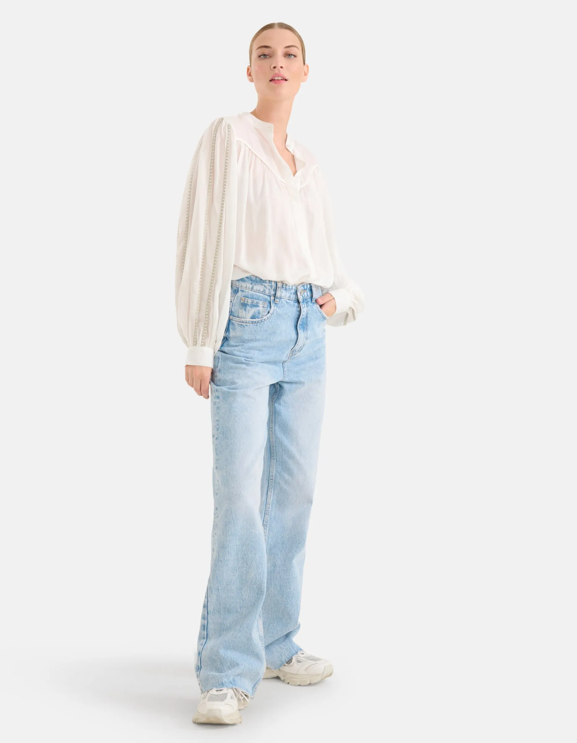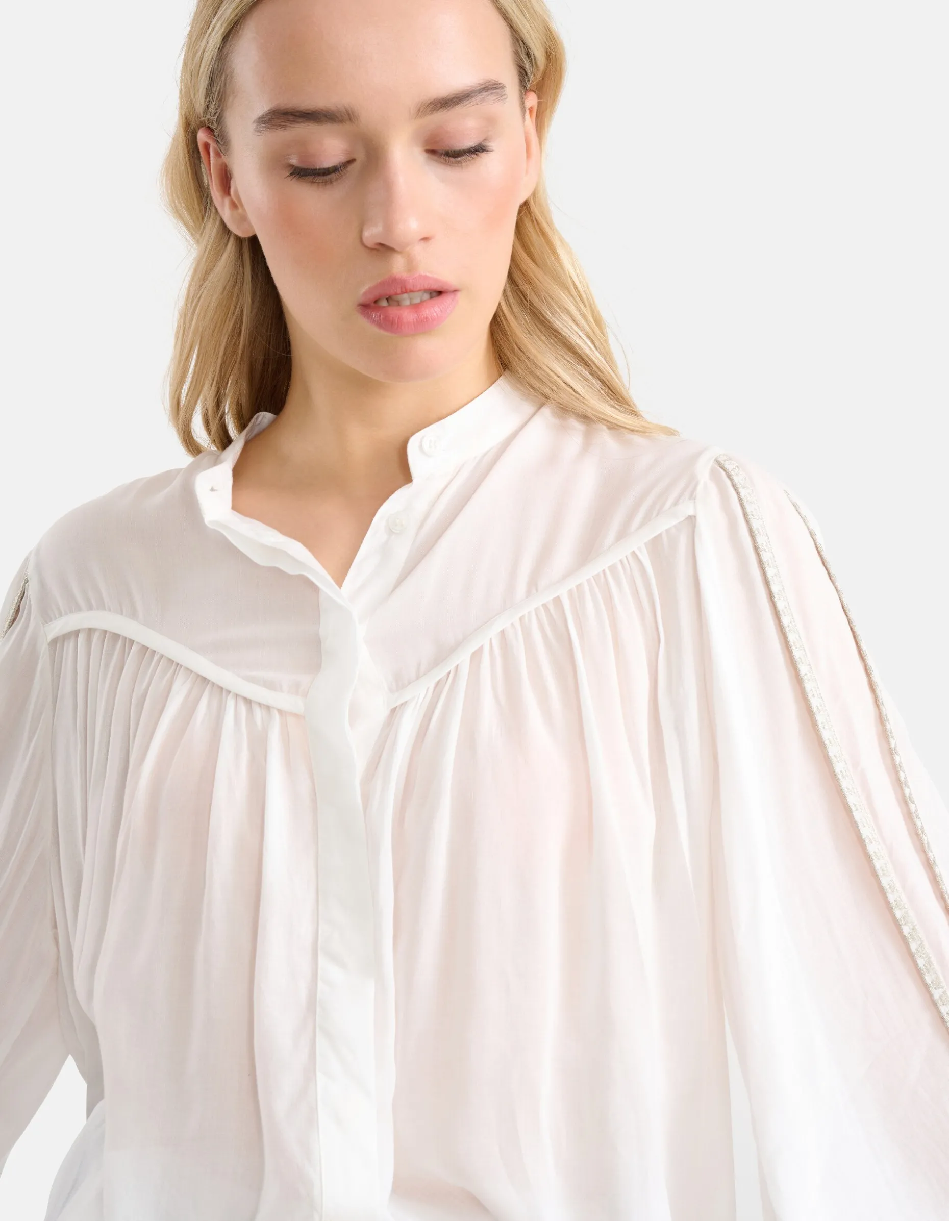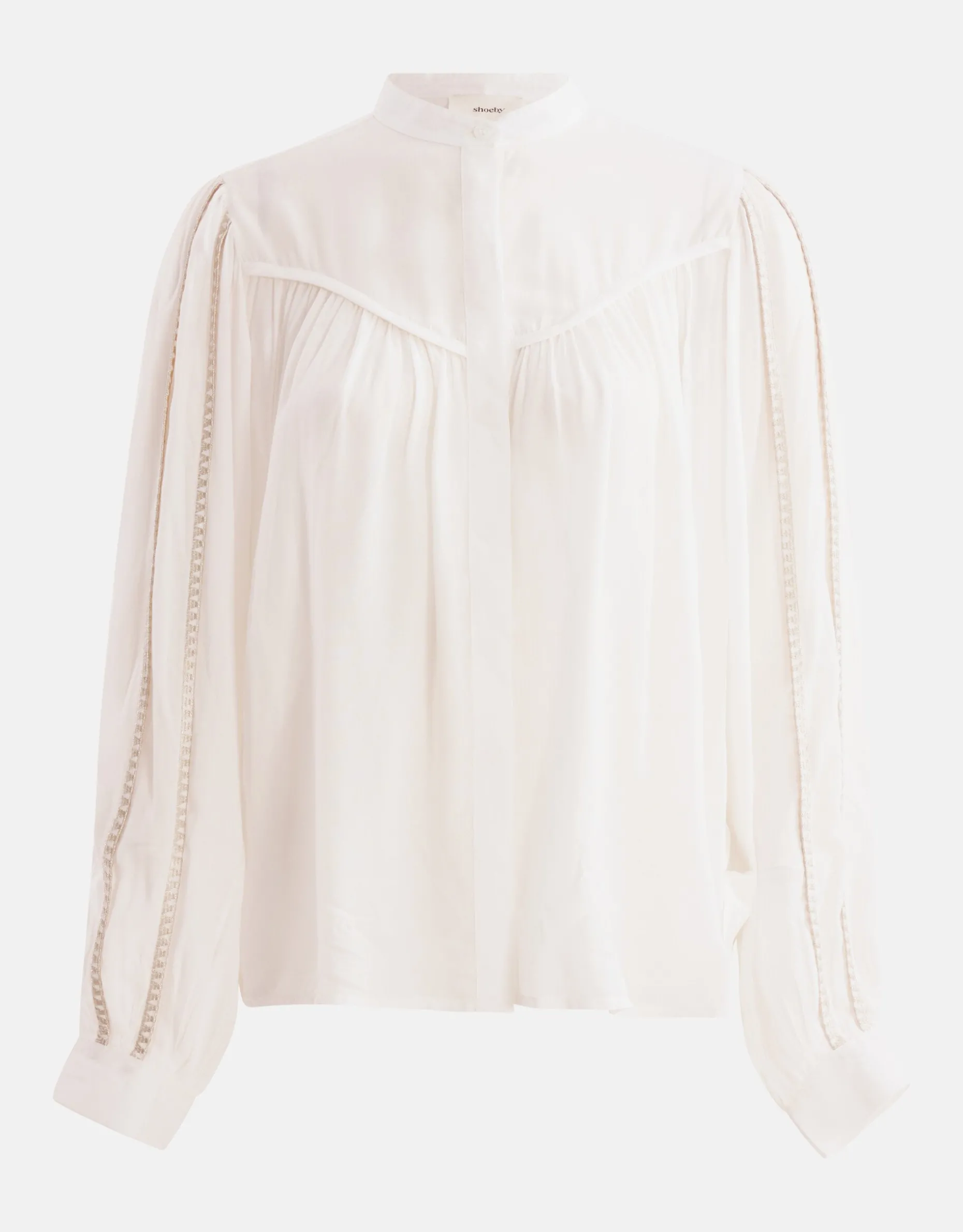 Een nieuw seizoen betekent nieuwe trends met de Shoeby X By Mieke collectie! Van vrouwelijke silhouetten, grafische patronen en subtiele glitters. De Mieke collectie bestaat uit kledingstukken voor elke vrouw en iedere gelegenheid. Ga je voor feestelijk, casual, classy of sporty? Creëer een look die bij jouw persoonlijke stijl past! De Pleated Blouse heeft lange mouwen, een hoge hals, een knoopsluiting, een non-stretch stof en een regular fit. Het item wordt gekenmerkt door de gebroken witte kleur met gouden lurex details bij de mouwen voor een luxeus effect. De blouse heeft een licht transparante stof. Wil je dit liever niet? Kies dan voor een Shoeby basis top voor eronder. Het is gemaakt van 100% viscose, hierdoor is het sterk van kwaliteit en kleurvast. Draag het samen met een donkere denim jeans en een paar chunky sneakers voor een sophisticated look! Het model heeft een lengte van 177 cm en draagt maat S. Het artikel heeft een totale lengte van 67 cm bij maat S.