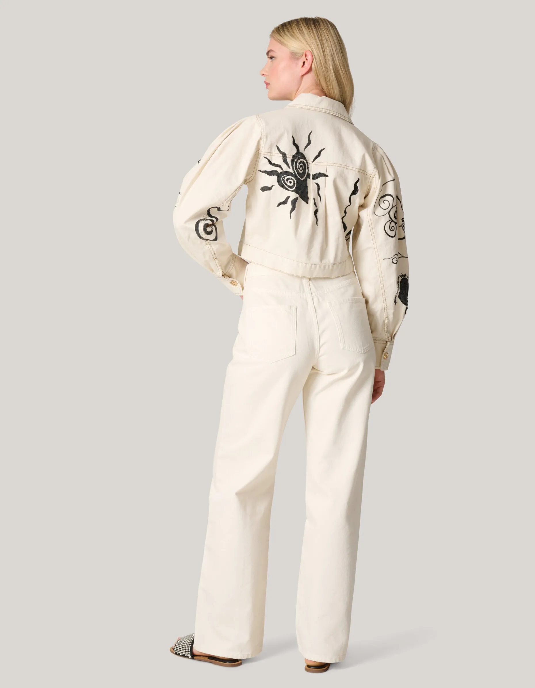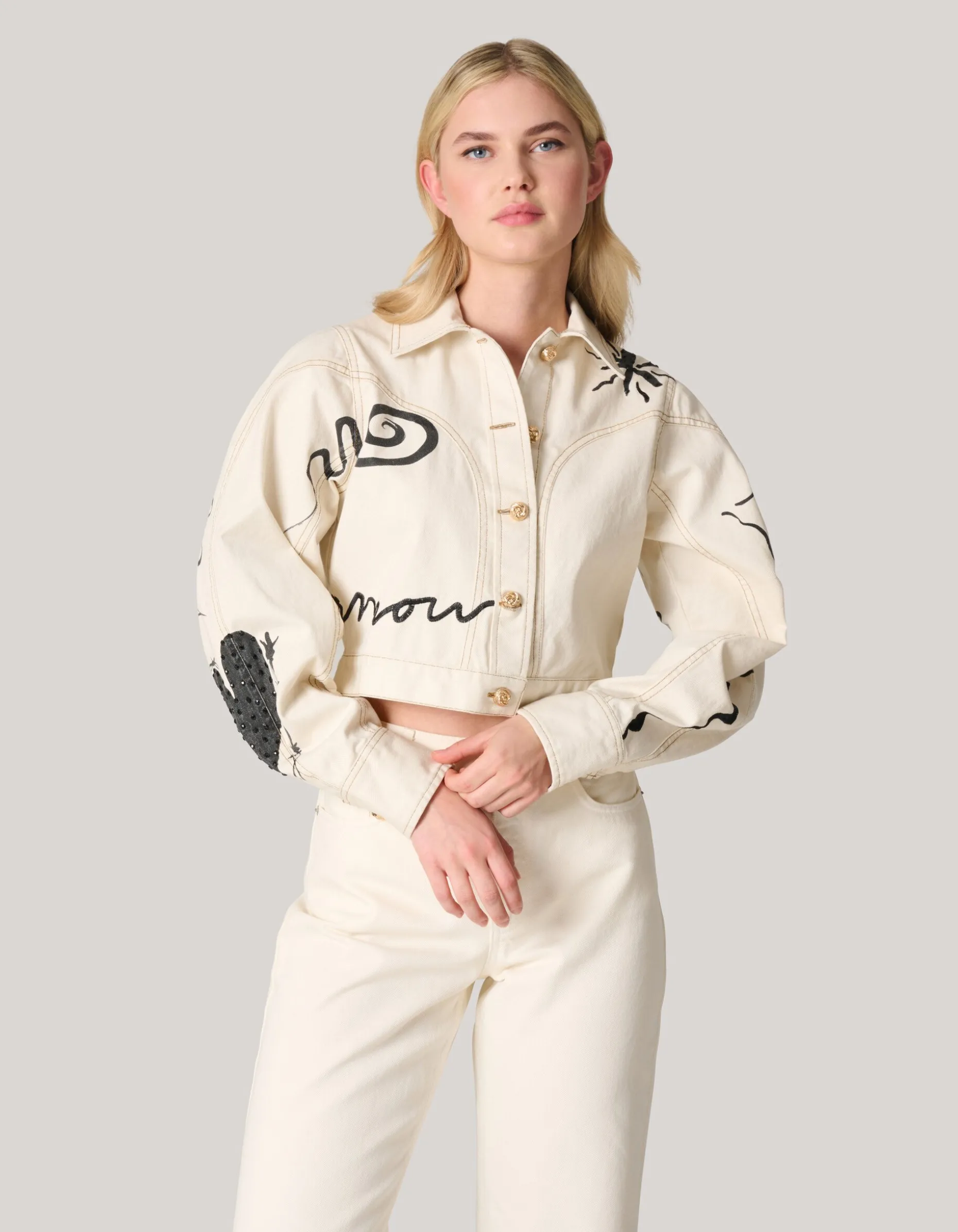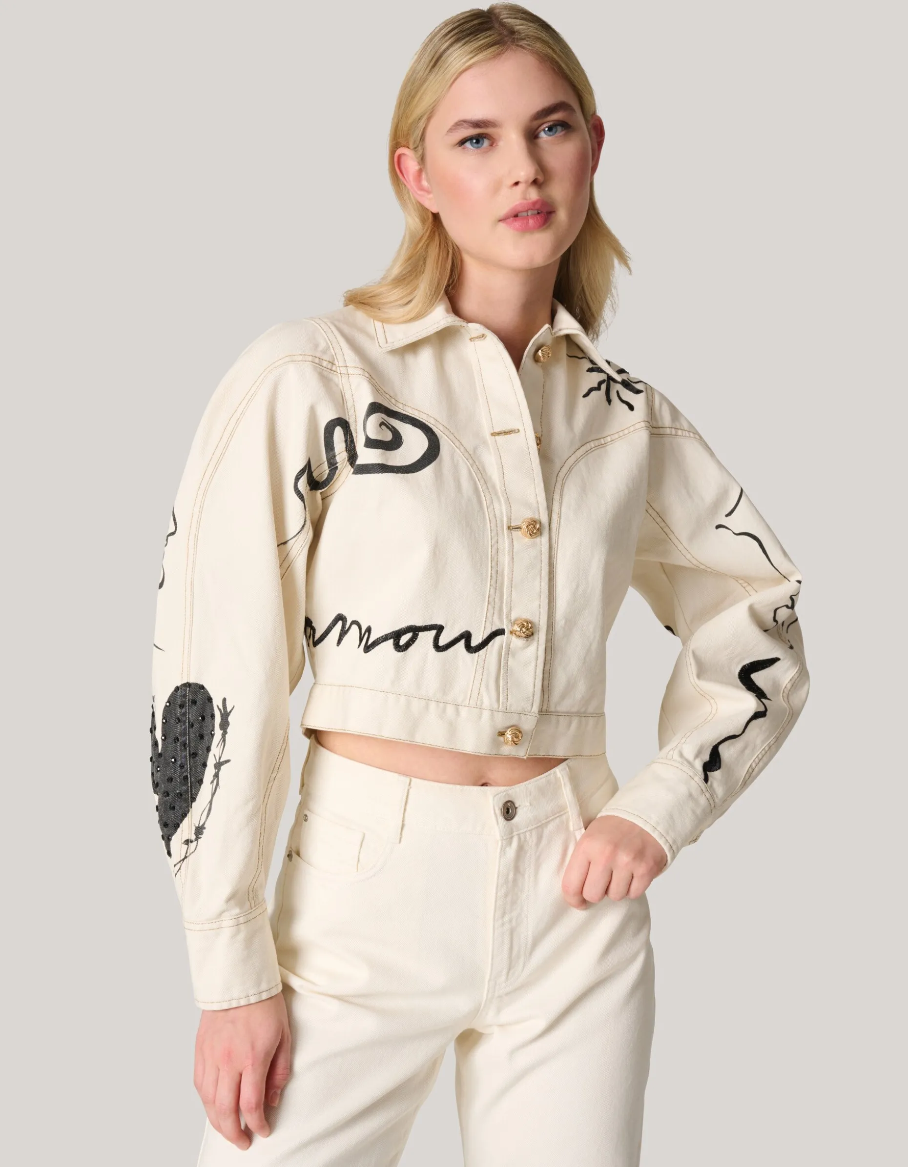 Iconic! Het Printed Denim Jack heeft lange pofmouwen, een kraag, een knoopsluiting en een cropped fit. Het item wordt gekenmerkt door de gebroken witte kleur met een all-over print met embroidery en strass details. Verder heeft het jack gouden knopen. Het jasje is gemaakt van 100% katoen. Hierdoor draagt het comfortabel.
