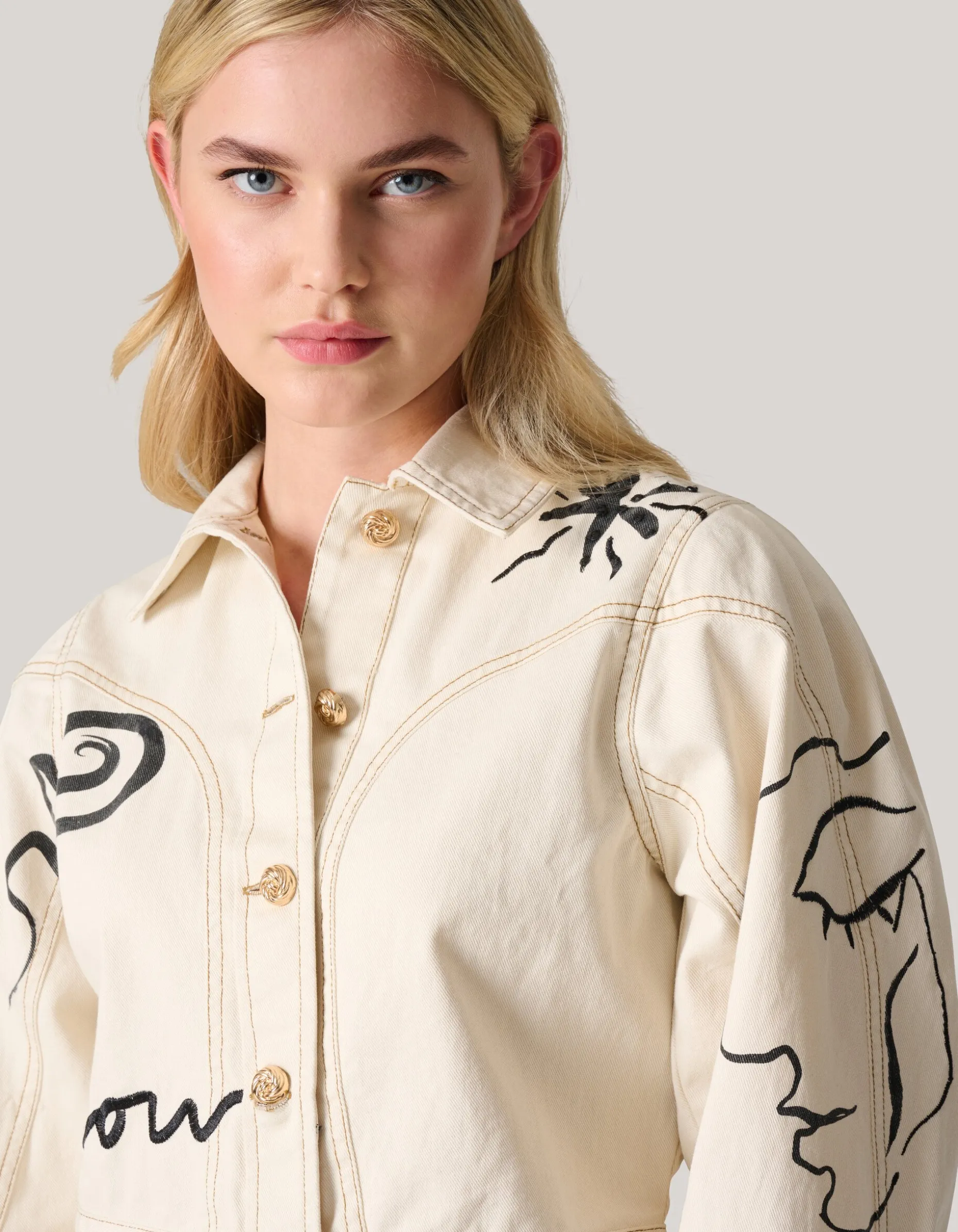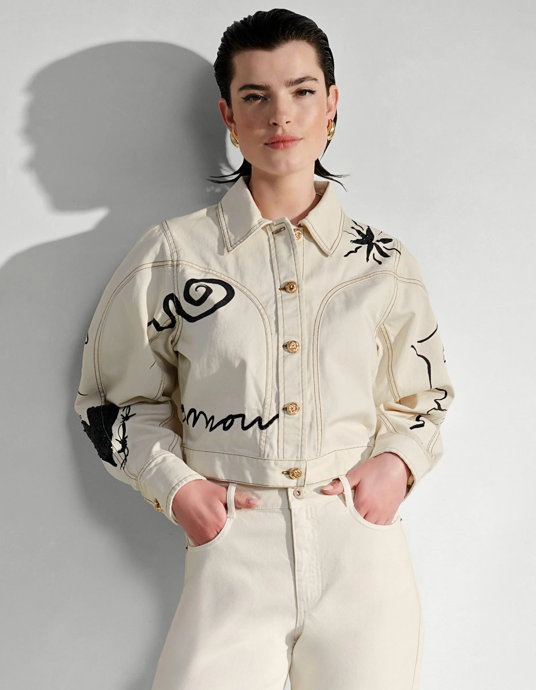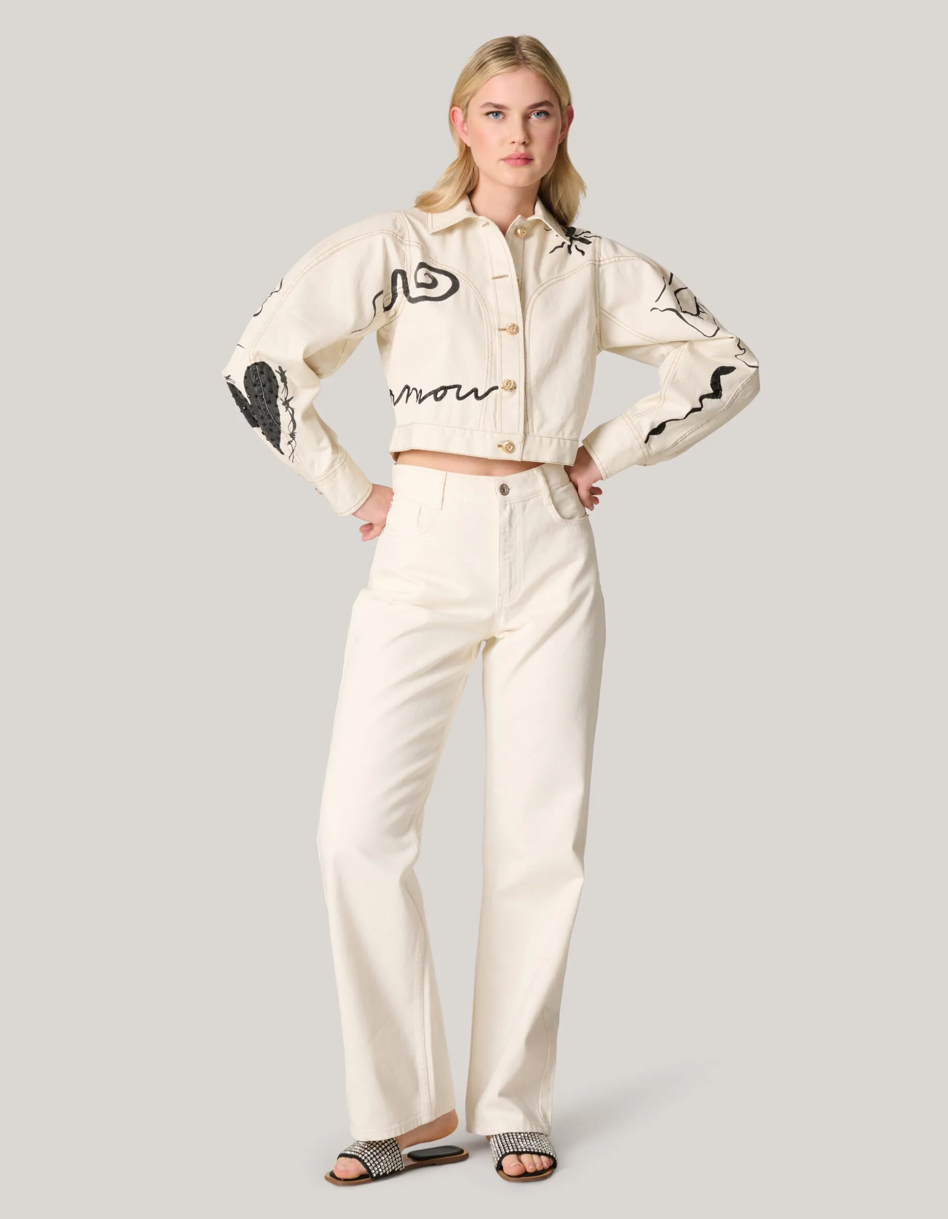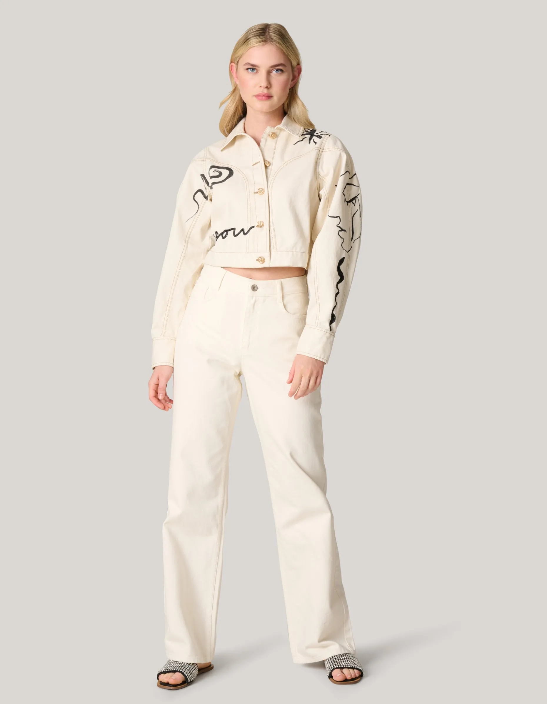 Iconic! Het Printed Denim Jack heeft lange pofmouwen, een kraag, een knoopsluiting en een cropped fit. Het item wordt gekenmerkt door de gebroken witte kleur met een all-over print met embroidery en strass details. Verder heeft het jack gouden knopen. Het jasje is gemaakt van 100% katoen. Hierdoor draagt het comfortabel.
