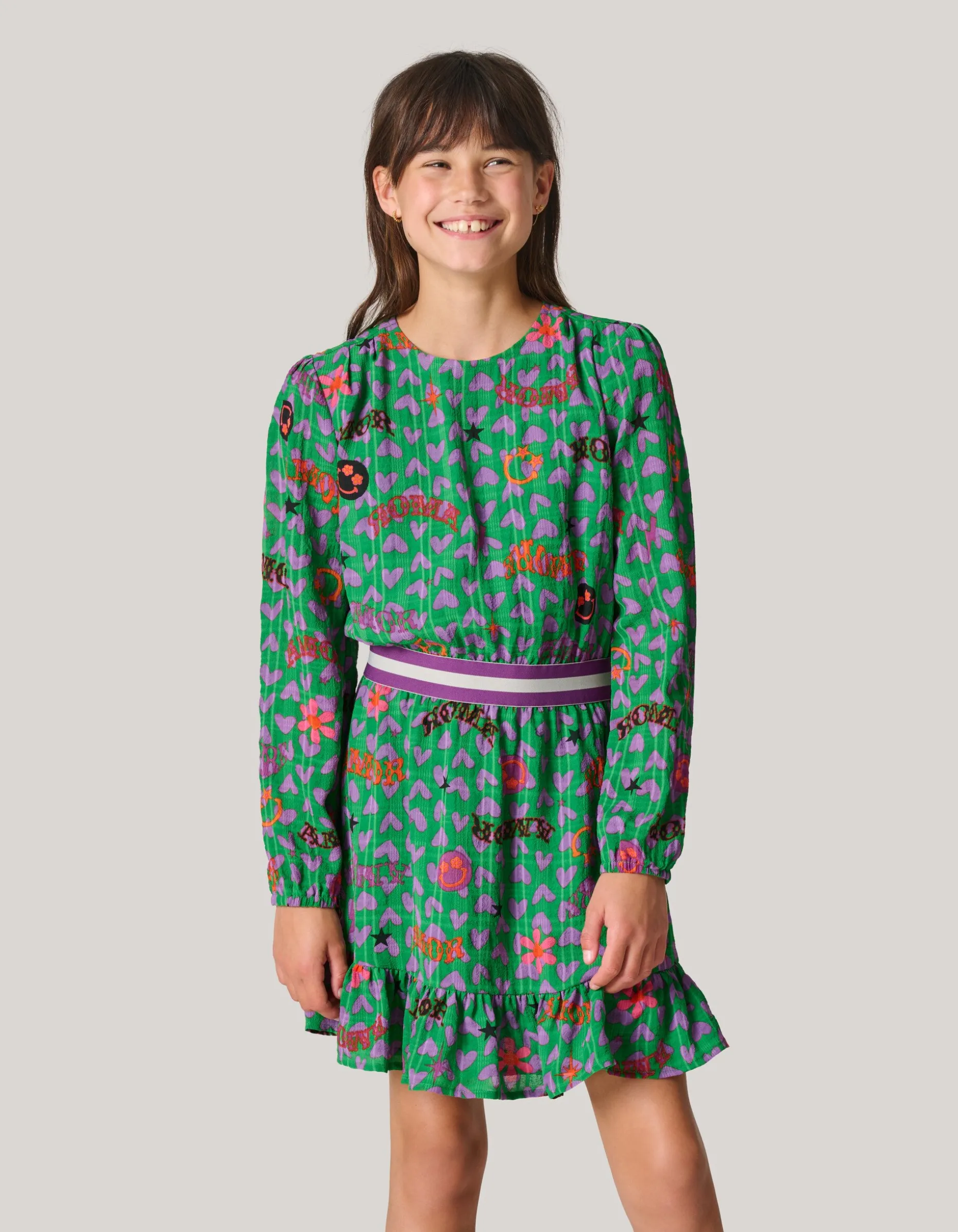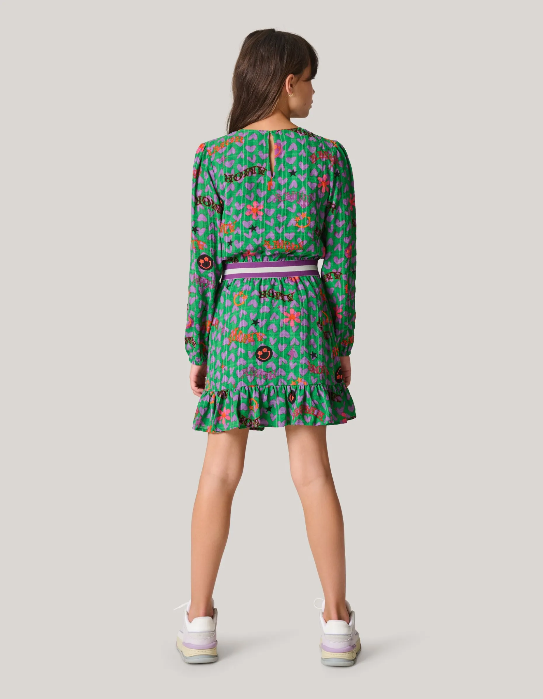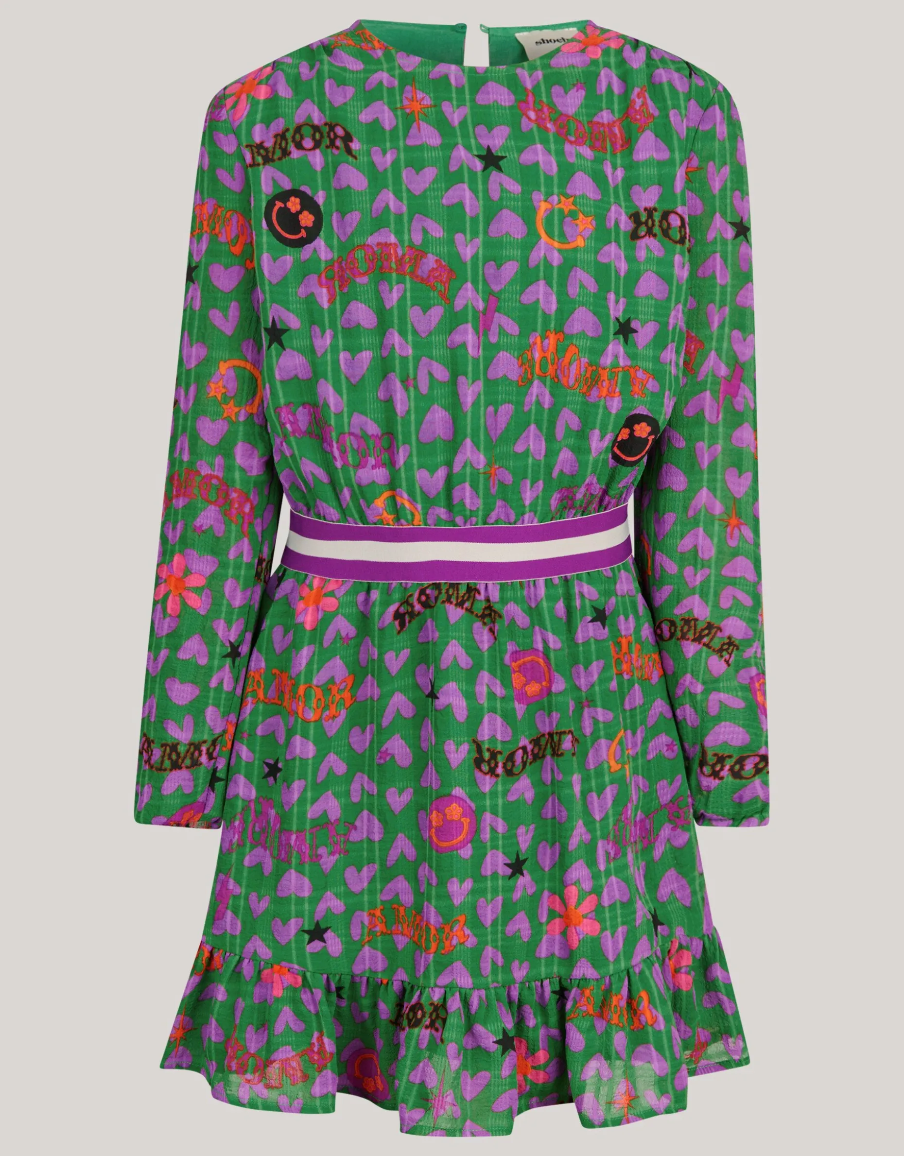 Smile! De Printed Jurk Groen wordt gekenmerkt door de groene kleur, de all-over multicolor print en de paarsgekleurde elastieken tailleband. De jurk heeft een uitlopende pasvorm, een mini-lengte en lange mouwen met een elastiek aan de onderkant. De Printed Jurk is gemaakt van polyamide en elastaan waardoor het kleur- en vormvast is en licht mee rekt. Perfect for summer!