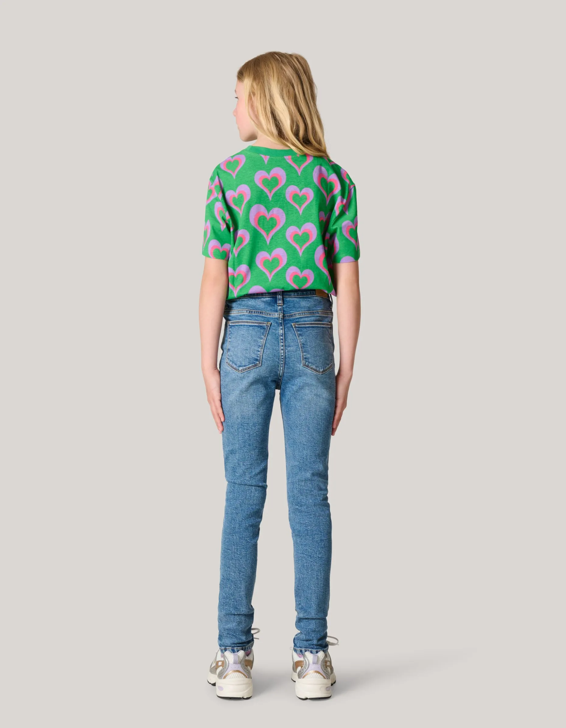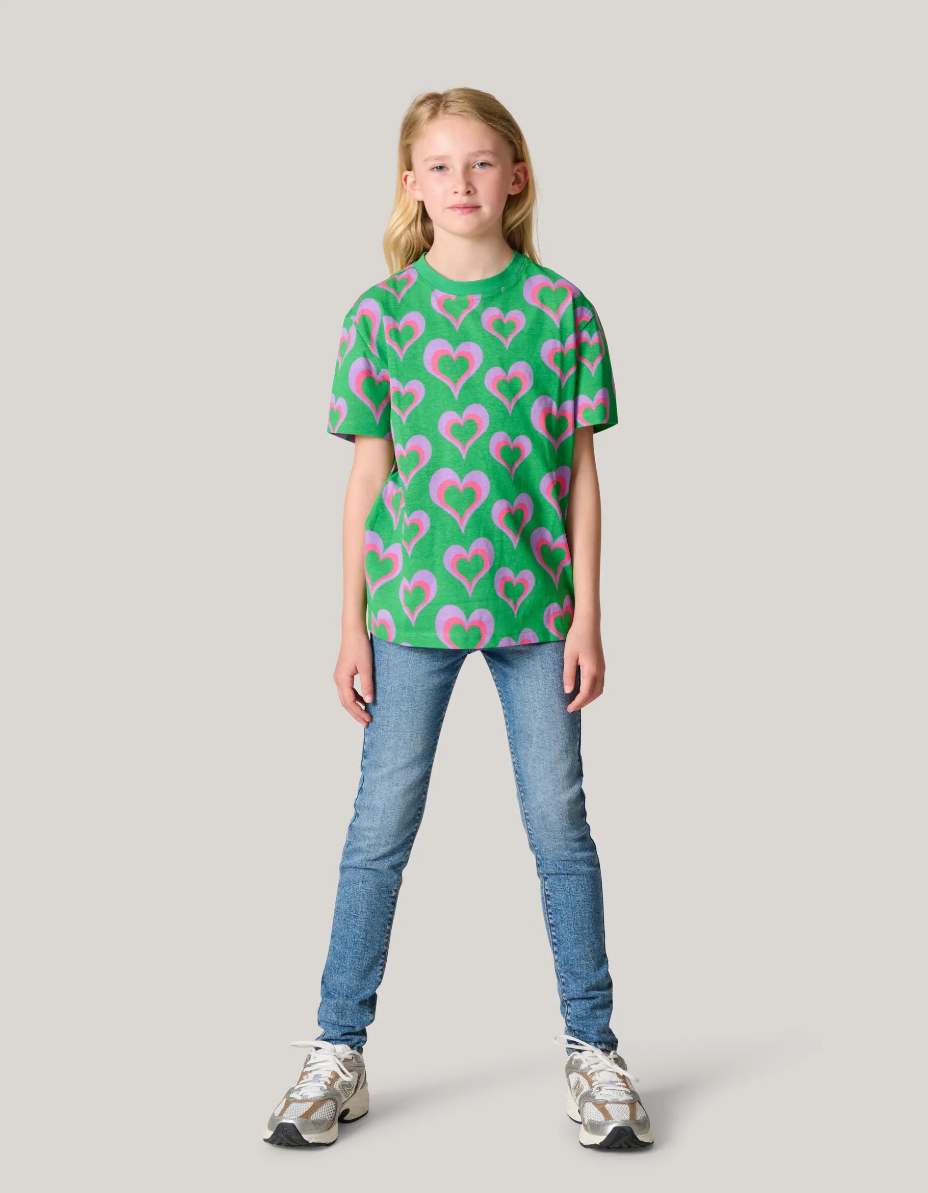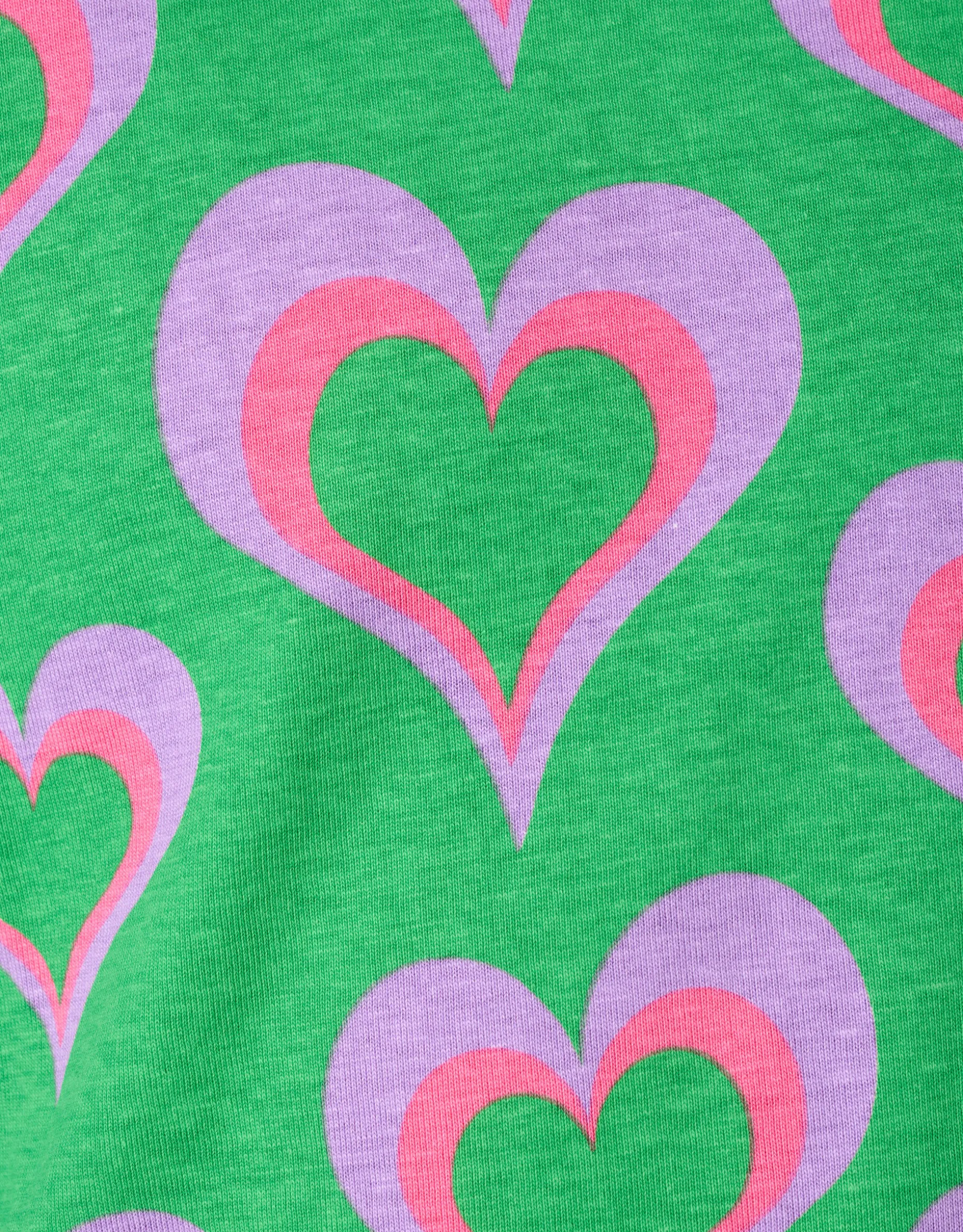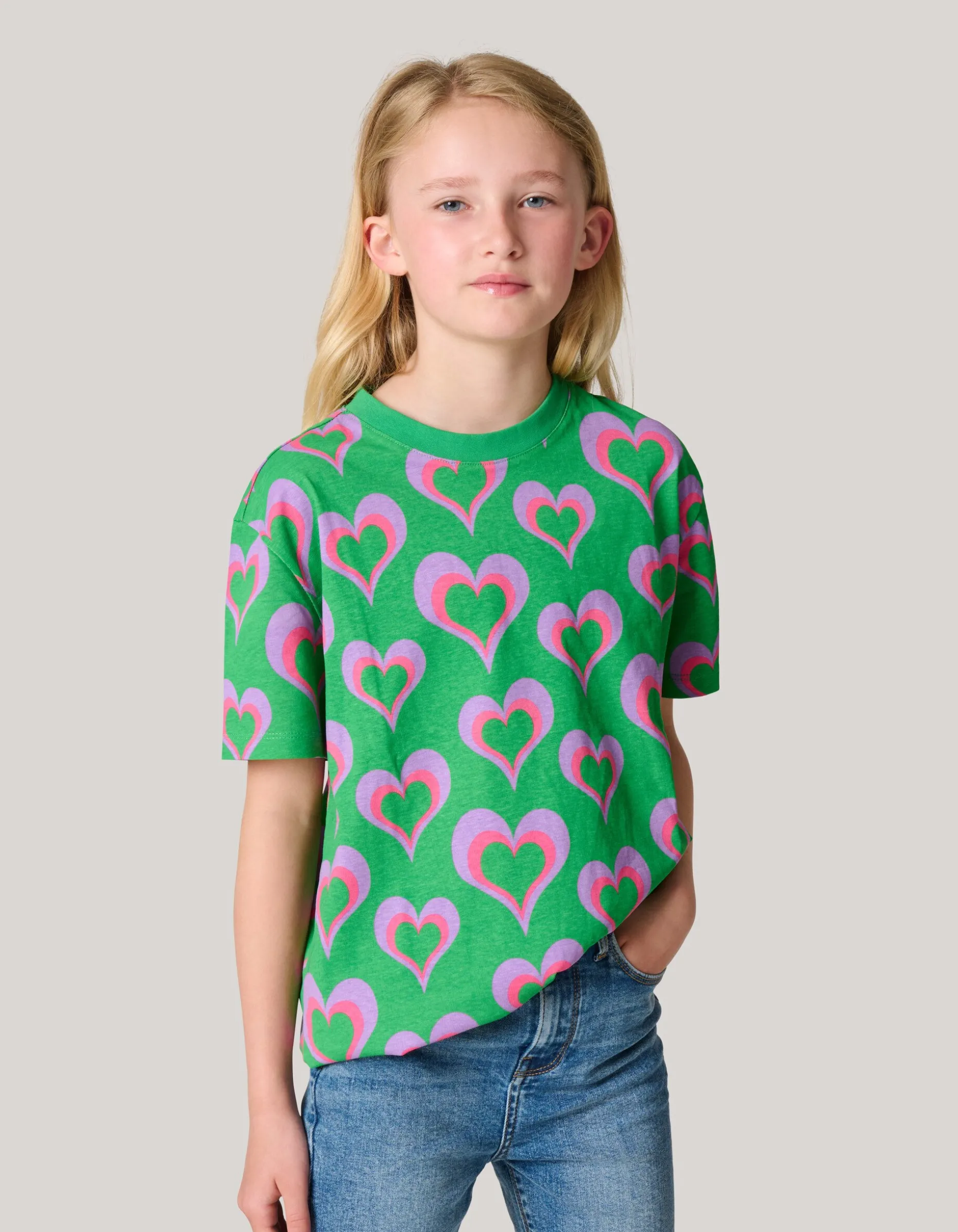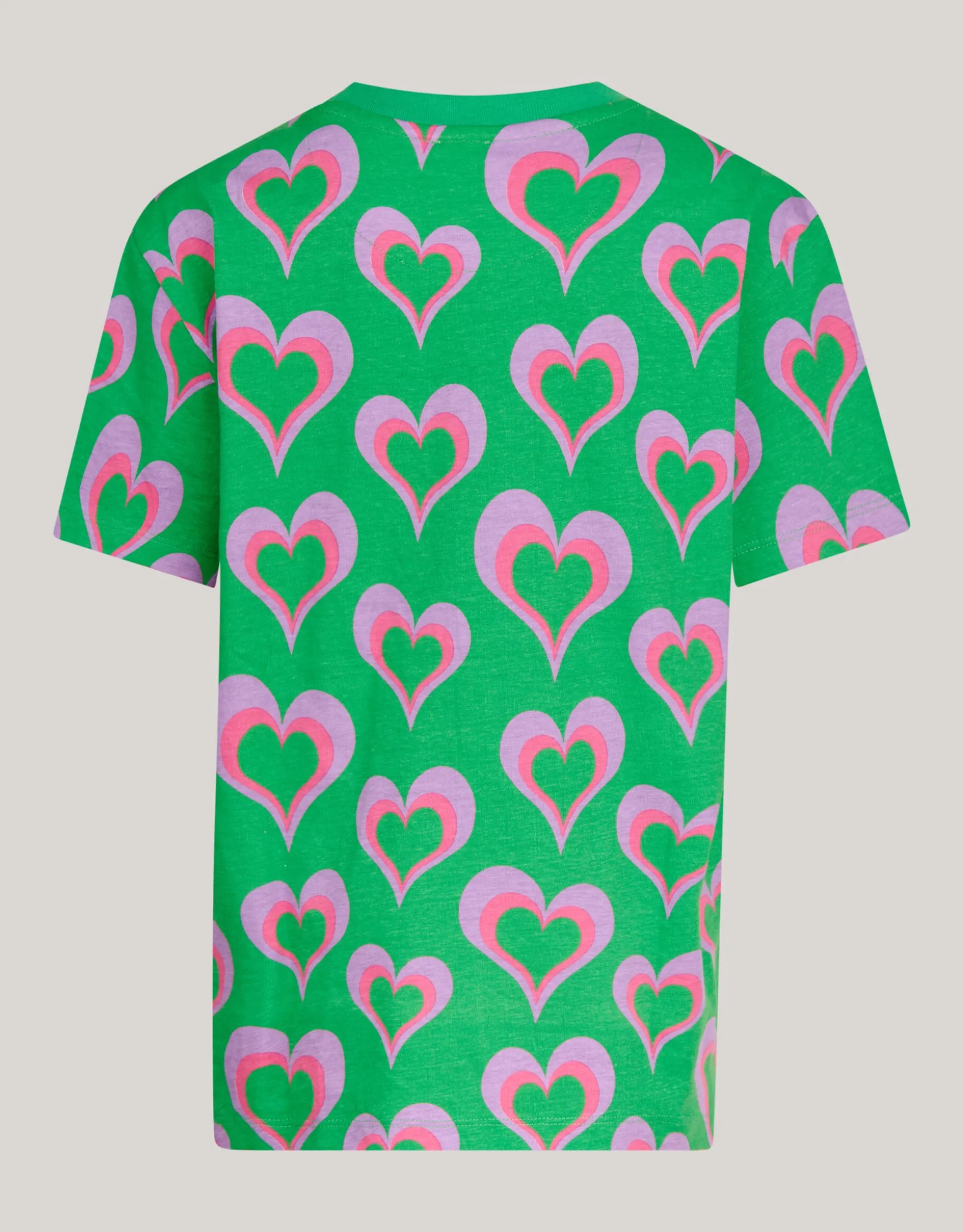The greener the better! Dit Printed T-shirt is perfect voor dagelijkse gelegenheden. Het T-shirt heeft een groene kleur met roze details in de vorm van hartjes voor een speels effect. Verder heeft het t-shirt een relaxed fit en een comfortabele ronde hals. Het item is gemaakt van 100% katoen, hierdoor draagt het comfortabel. Combineer het item samen met je favoriete jeans en een paar sneakers voor een complete look!