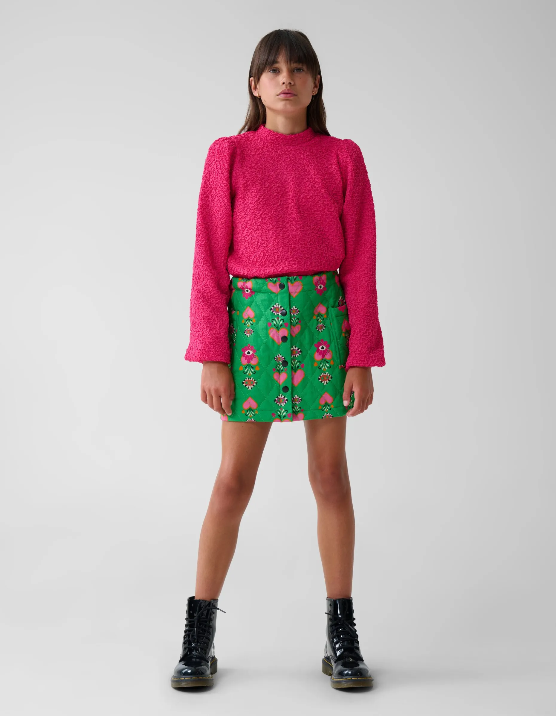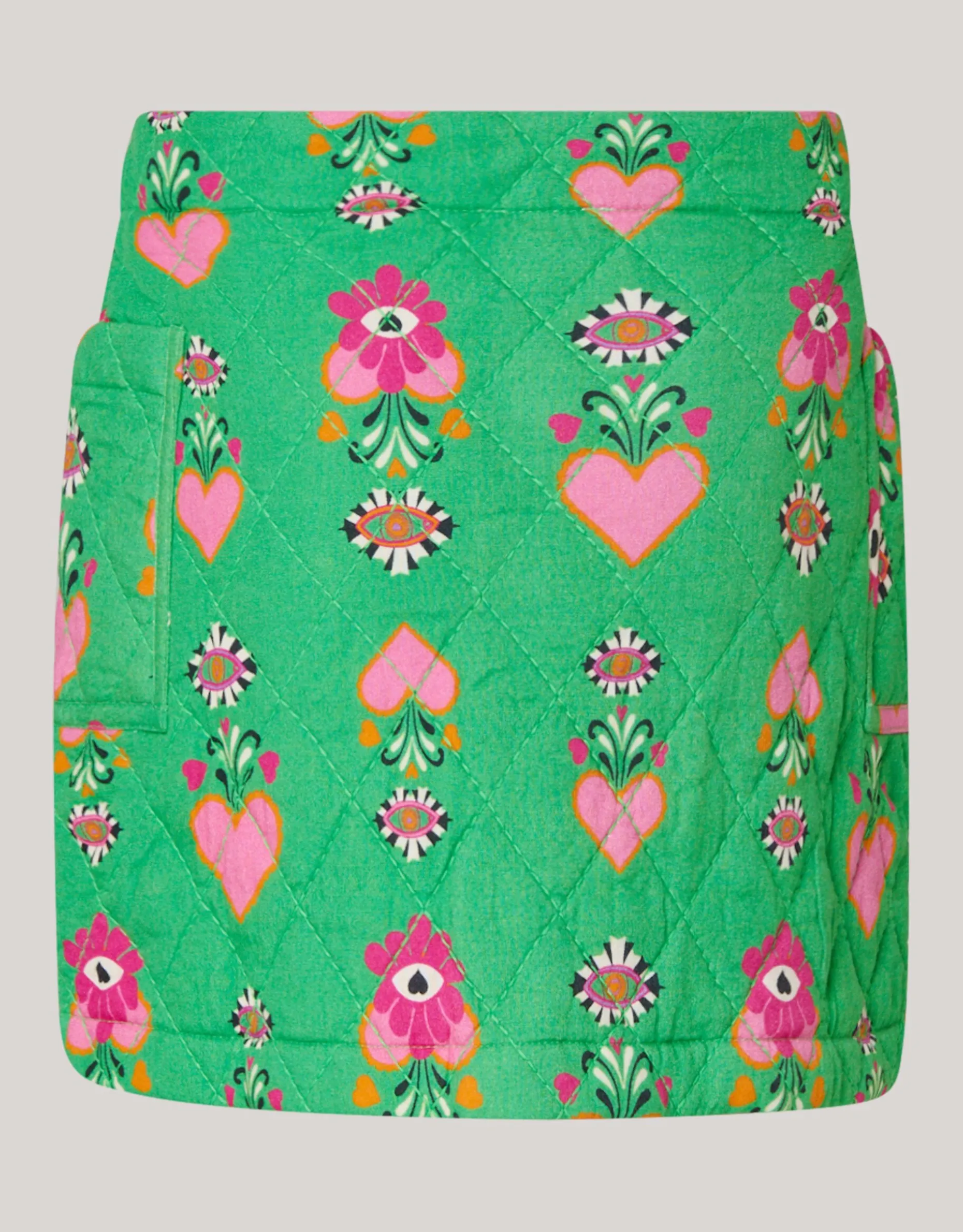 Print it! De Quilted Rok By Lizzy heefteen mini-lengte, regular fit en een elastieke band in de taille die verstelbaar is. Het item wordt gekenmerkt door de groene kleur met een all-over hartjes en bloemetjes print in de kleuren roze, oranje, zwart en wit. Verder heeft de rok zwarte drukknoopjes waardoor het item gemakkelijk aan en uit te doen is. Het item is gemaakt van 100% viscose, hierdoor draagt het comfortabel en is het kleurvast. Draag het samen met andere items van de By Lizzy collectie voor een stylish look!