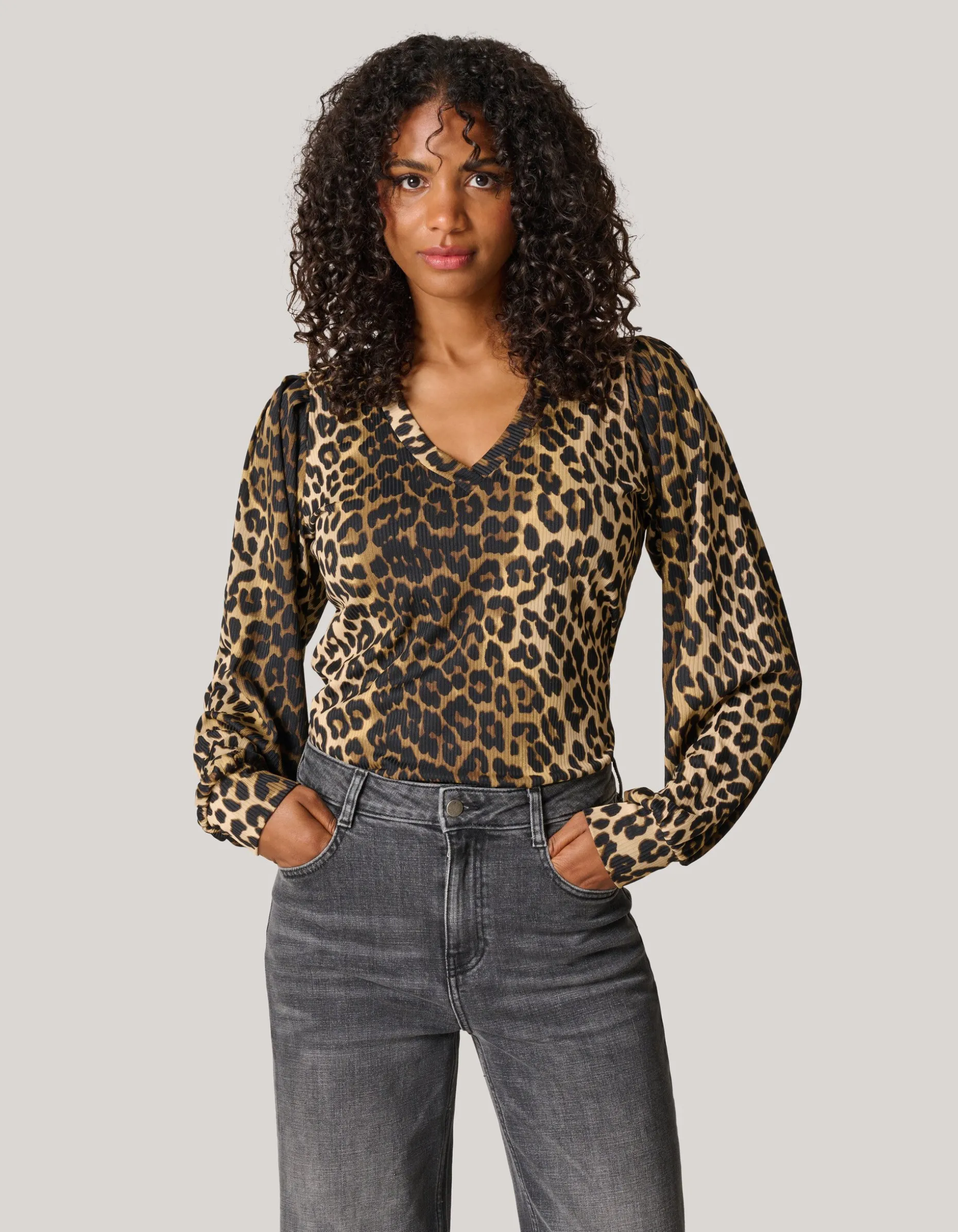 Print it! De Leopard Rib Jersey Ruffle Top heeft lange mouwen, een v-hals, een stretch stof en een regular fit. Het item wordt gekenmerkt door de all over leopard print en de jersey stof met een subtiel ribje in de stof verwerkt. Jersey zorgt ervoor dat de top extra lekker zit en fijn meerekt.Het item is gemaakt van polyester en elastaan. Door deze samenstelling is het sterk van kwaliteit, vormvast en rekbaar. Maak de look compleet met een jeans en je bent ready to go! Het model heeft een lengte van 176 cm en draagt maat S. Het artikel heeft een totale lengte van 61 cm bij maat S.