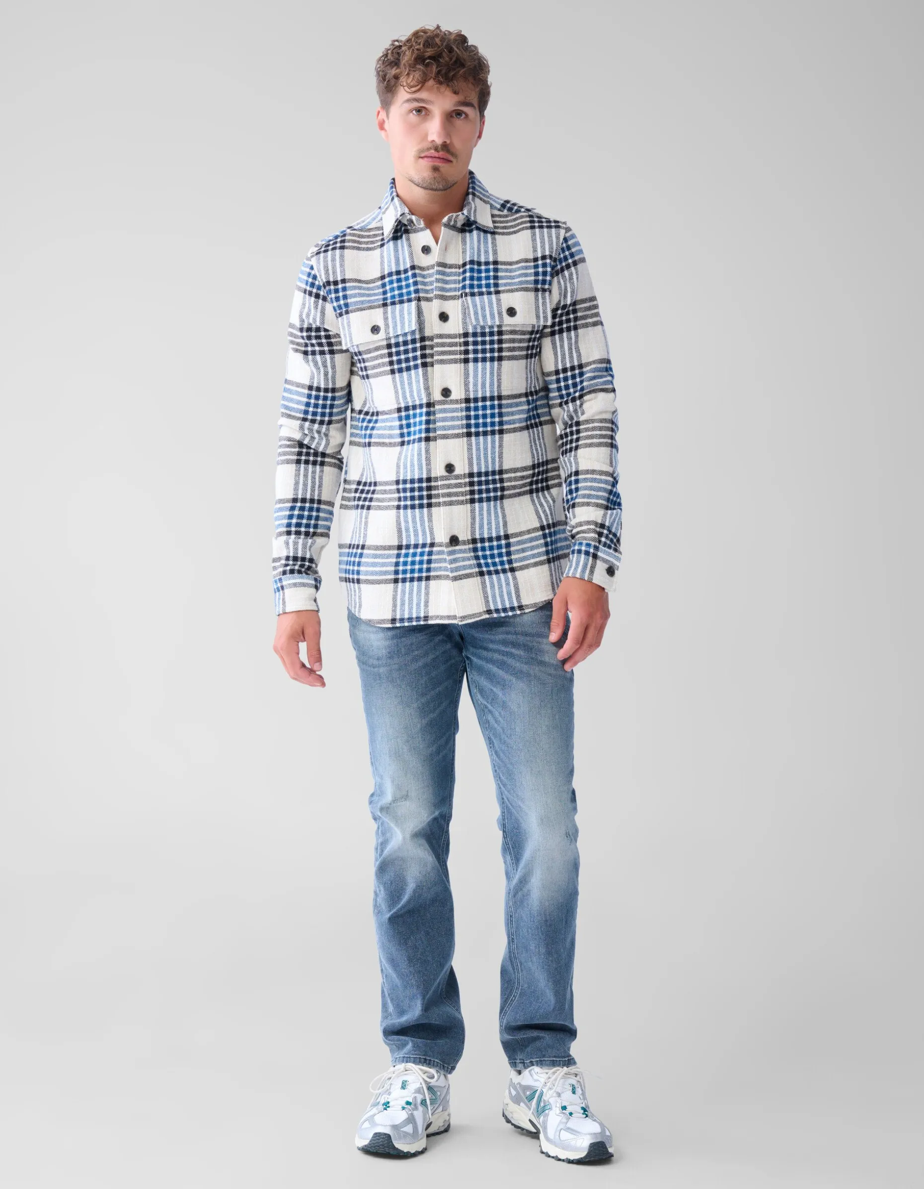 A touch of blue! De Ruiten Overshirt is een musthave voor het najaar. Het overhemd heeft lange mouwen, een kraag, een knoopsluiting, een non-stretch stof, één zakje op de voorzijde, een geweven stof en een regular fit. Het item wordt gekenmerkt door de gebroken witte kleur met een all-over ruiten print. De ruiten hebben de kleuren blauw en zwart. De ruit heeft grote blokken, waardoor je overhemd de show steelt! Het is gemaakt van katoen, polyester en viscose. Door deze samenstelling is het sterk van kwaliteit, vormvast, kleurvast en comfortabel. Maak de look compleet met een zwarte tapered jeans en een hoodie voor een gelaagde look! De totale lengte van dit item is 76 cm bij maat M.