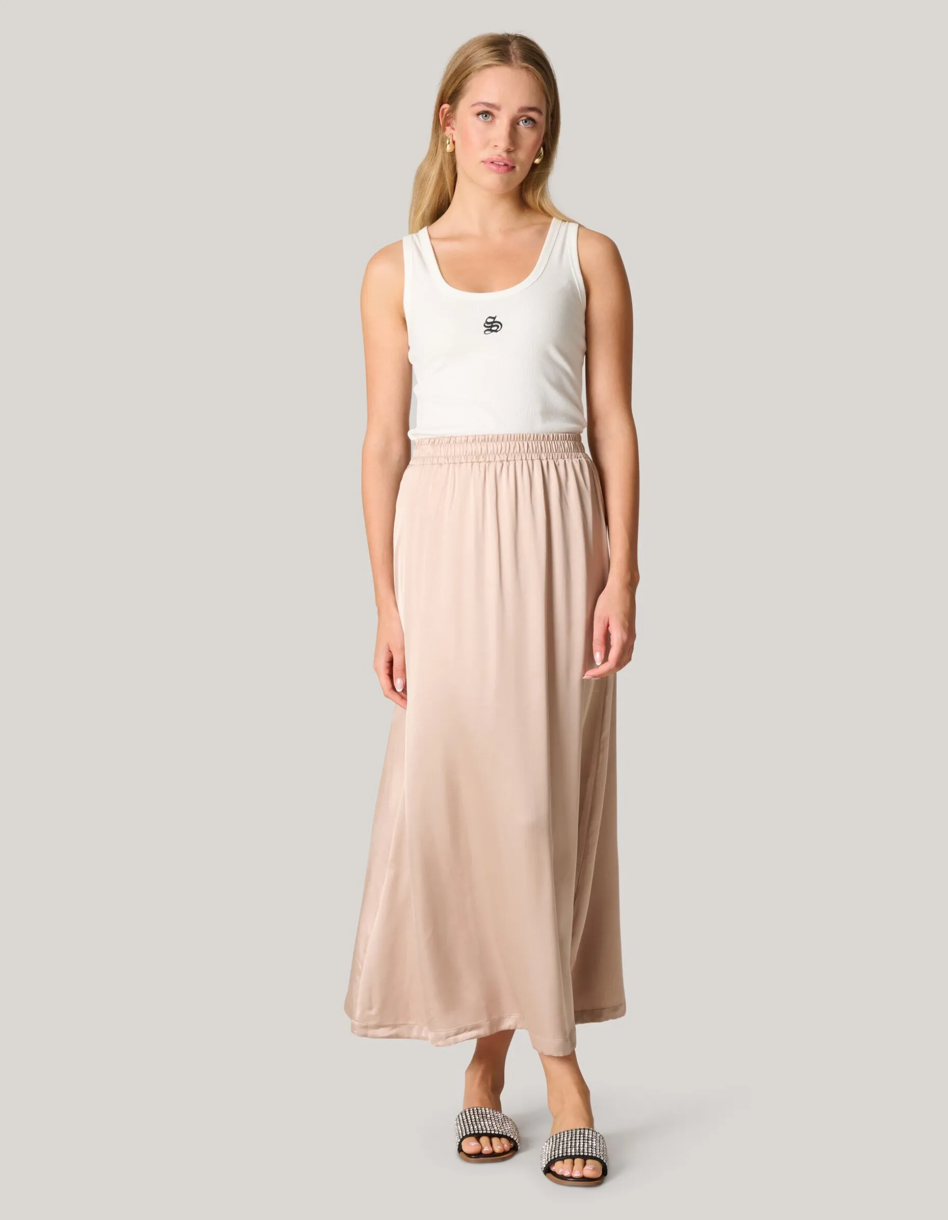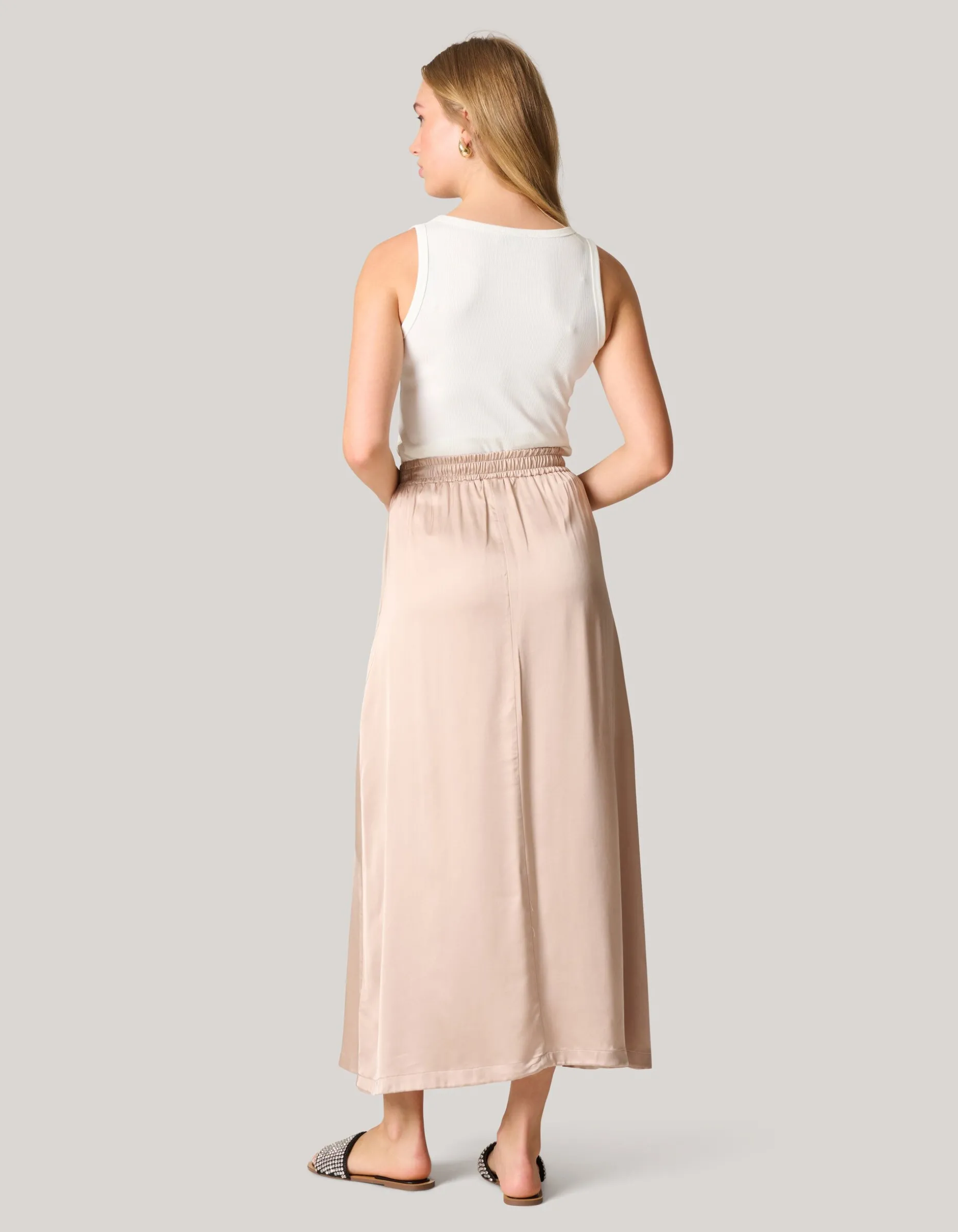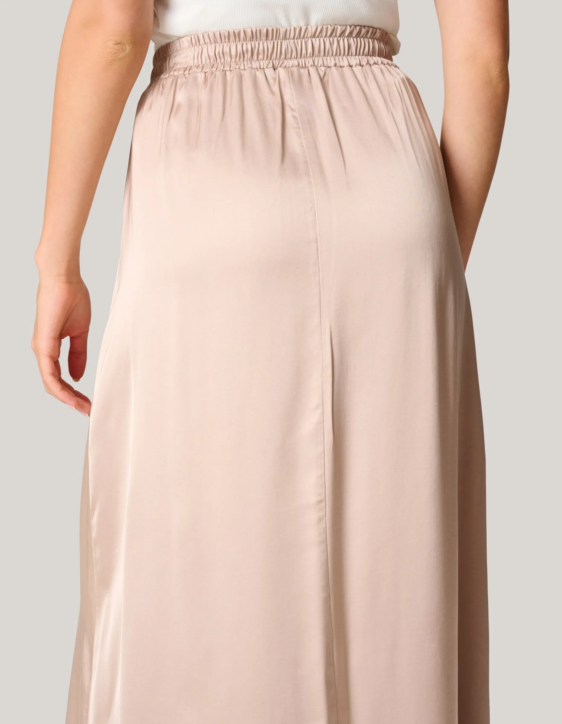 Musthave! De Satijnen Maxi Rok heeft een uitlopende fit, een maxi-lengte, een elastische tailleband en een hoge taille. Het item wordt gekenmerkt door de zand kleur en de satijn-look.