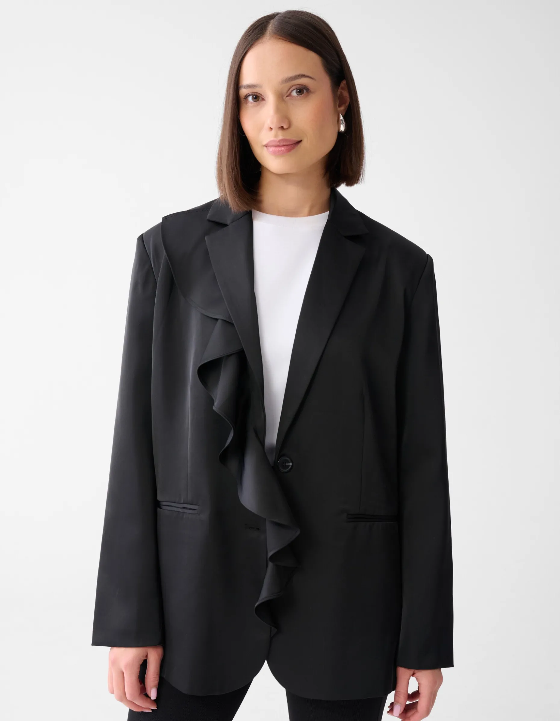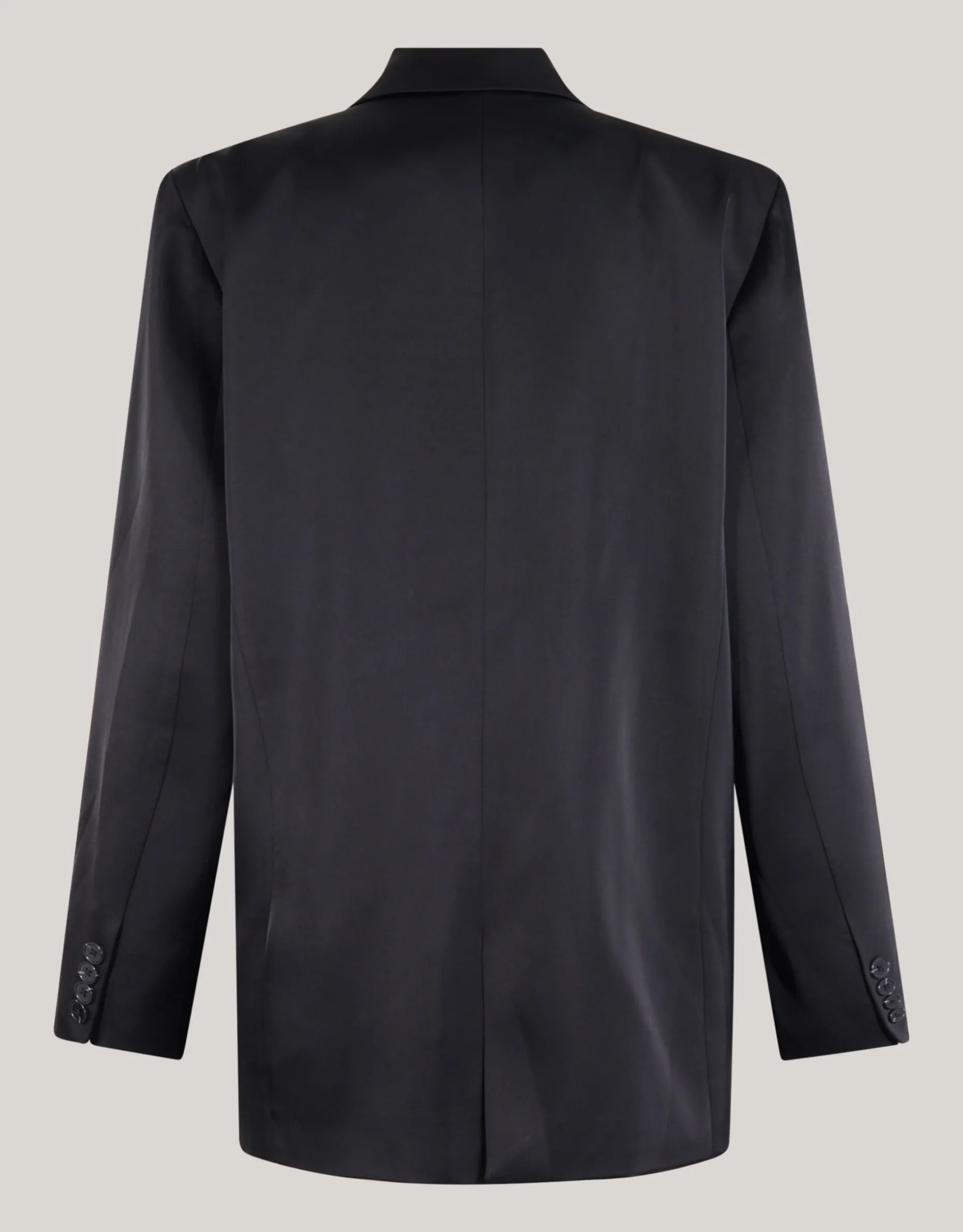 Ontdek de perfecte balans tussen elegantie en comfort met deze verfijnde zwarte blazer. De Satijnen Ruffle Blazer Zwart heeft een oversized fit, lange mouwen en een knoopsluiting, en wordt gekenmerkt door de zwarte satijnlook en de ruffle aan de voorzijde van de blazer. De blazer is gemaakt van 100% polyester, waardoor hij kleur- en vormvast is en geen stretch heeft. Het model heeft een lengte van 176 cm en draagt de blazer in maat XS/S. De totale lengte van de blazer is 72 cm bij maat XS/S.