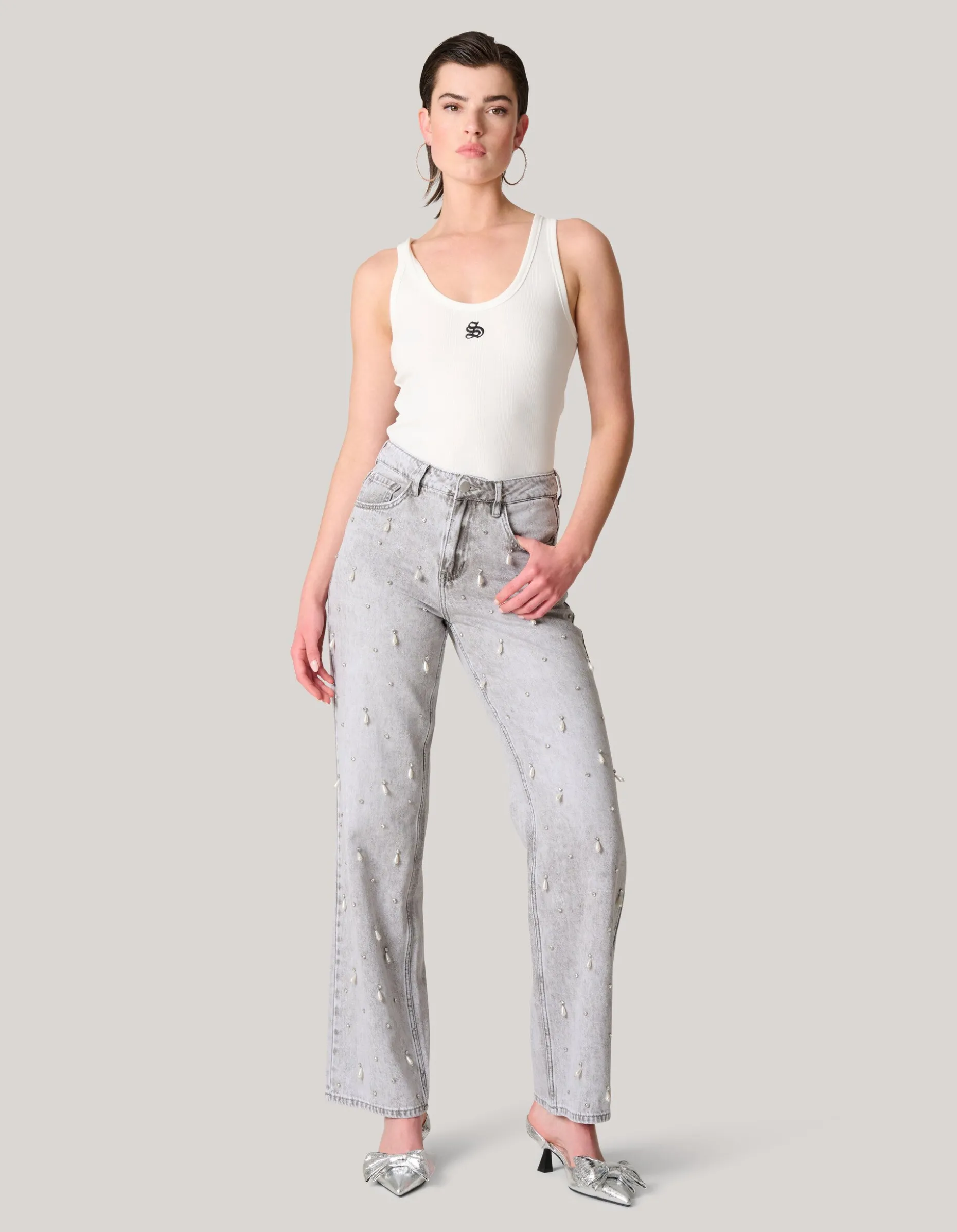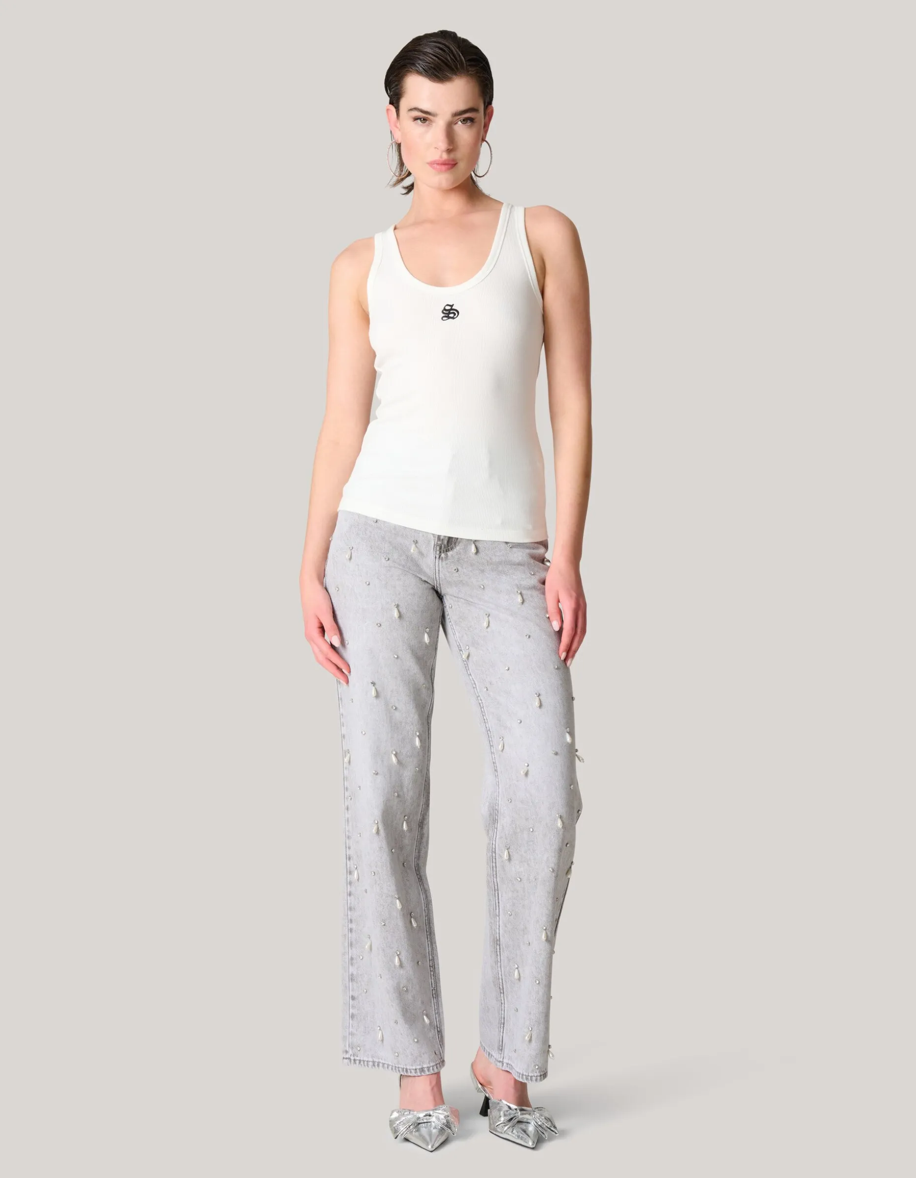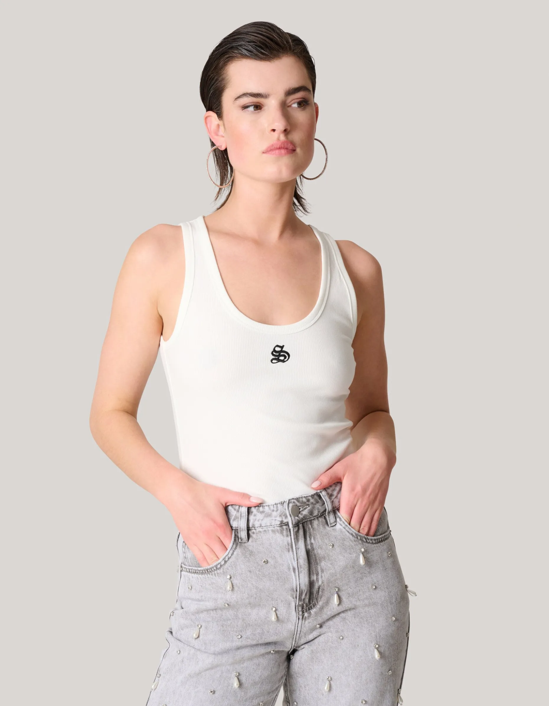 Dedicated to all sophisticated style icons! De Shoeby Logo Tanktop heeft een lage ronde hals, een aangesloten fit en is mouwloos. Het item wordt gekenmerkt door de witte kleur met een fashionable Shoeby logo op de voorzijde. Het logo is geborduurd voor een luxueus effect. Verder heeft de stof een subtiel ribje erin verwerkt. De top is gemaakt van polyester, viscose en elastaan. Door deze samenstelling is het sterk van kwaliteit, vormvast, kleurvast en bevat het stretch. Maak de look compleet met een wijde jeans, een oversized blazer en een paar sneakers en je bent ready to go! Het model heeft een lengte van 176 cm en draagt maat S. Het artikel heeft een totale lengte van 55,5 cm bij maat S.