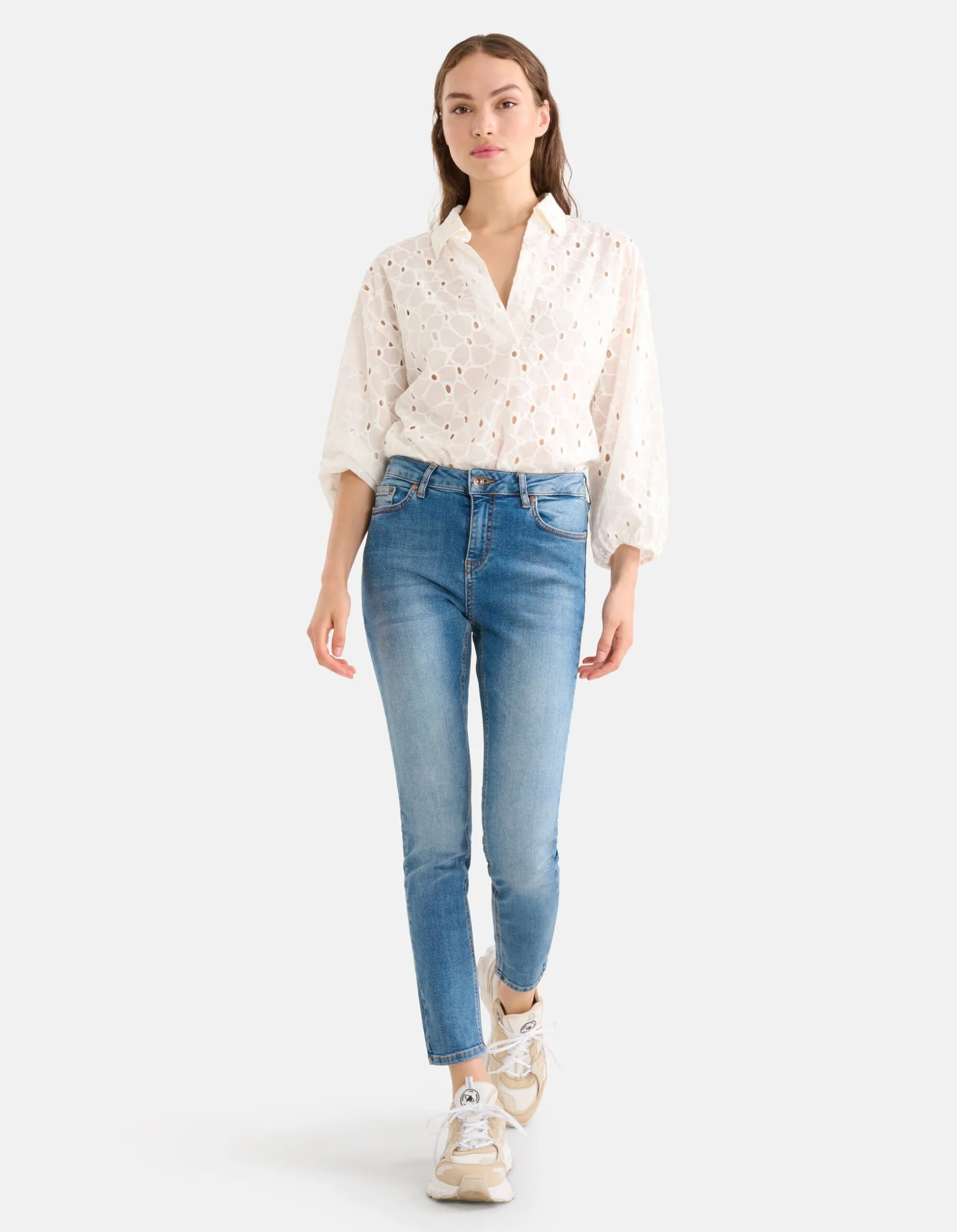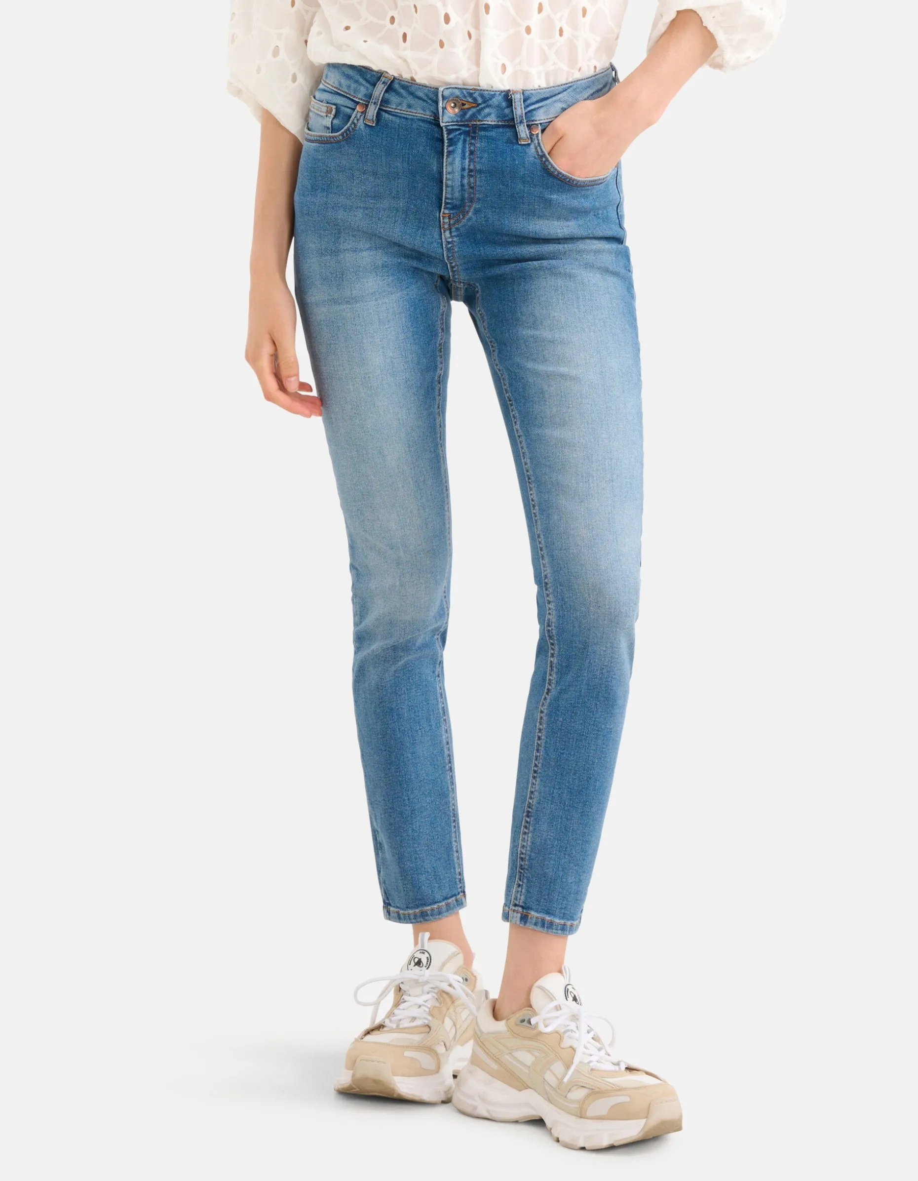 When in doubt wear denim! Een skinny fit is perfect voor vrouwen die houden van een aansluitende fit. De Skinny Jeans valt namelijk op alle plekken mooi en aansluitend aan. De jeans heeft een regular waist, een skinny fit, een 5-pocket model en een knoop-en ritssluiting. De jeans wordt gekenmerkt door de enkellengte en de mediumstone blauwe wassing. De kleur is tijdloos, waardoor je het item oneindig kunt combineren. Verder geven de gele stiksel de perfect finishing touch! Een fijn detail is de high stretch denim stof wat zorgt voor een hoog draagcomfort. Maak je look compleet met een broderie blouse, chunky sneaks en een riem en je bent ready to go. Het model heeft een lengte van 173 cm en draagt maat 27. Het artikel heeft een binnenbeenlengte van 83,5 cm bij maat 27.