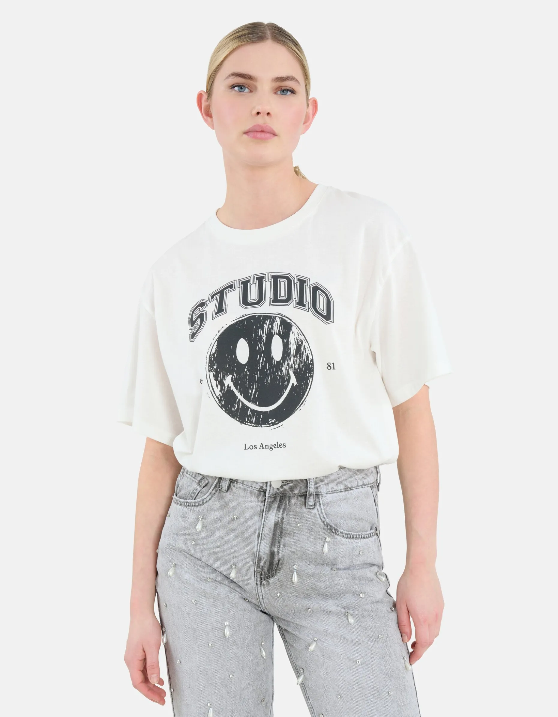 Musthave! Het Artwork Smiley T-shirt heeft een korte mouw, een hoge ronde hals en een relaxed fit. Het item wordt gekenmerkt door de witte kleur met een artwork op de voorzijde. Verder is het shirt gemaakt van 100% katoen, hierdoor draagt het comfortabel.