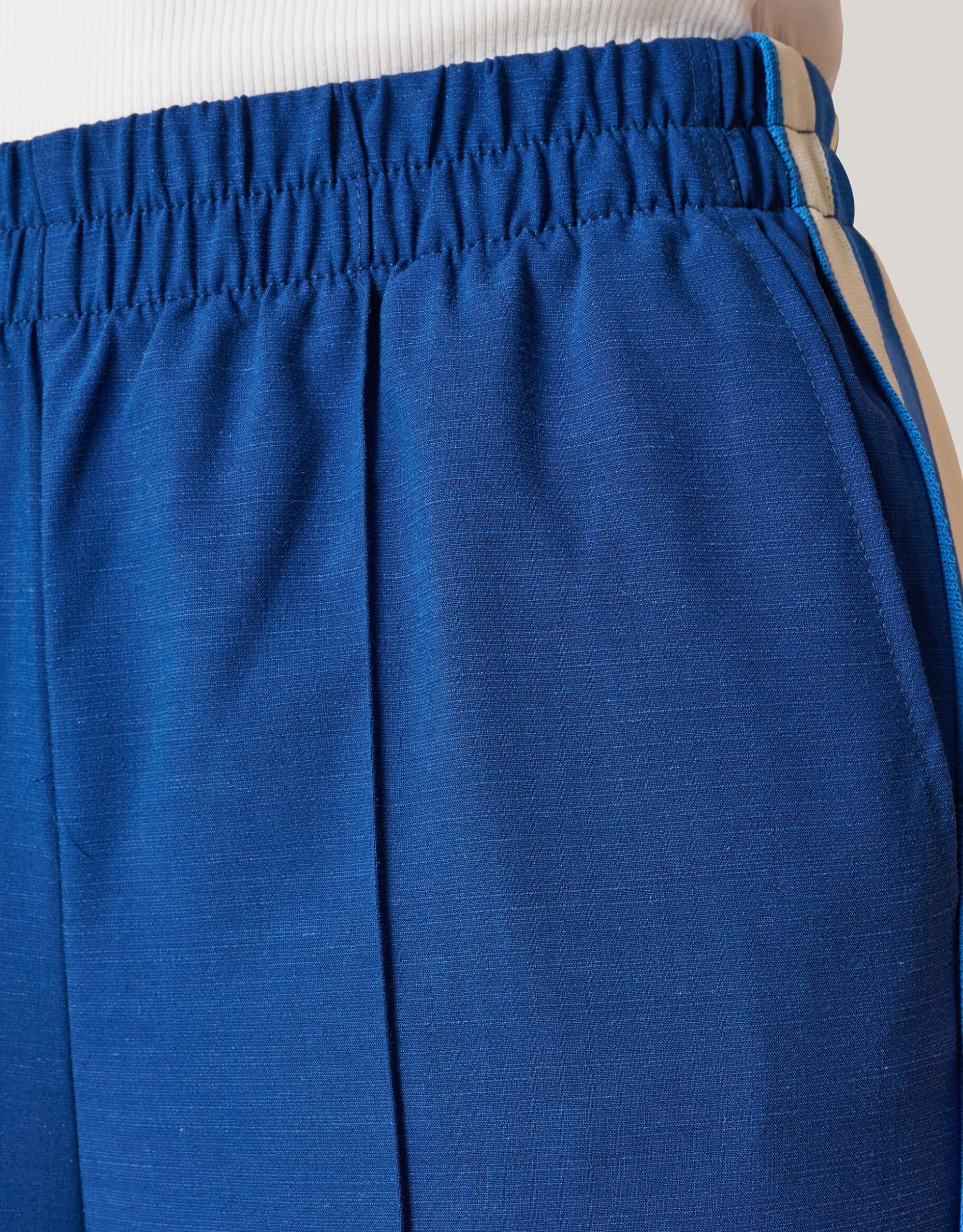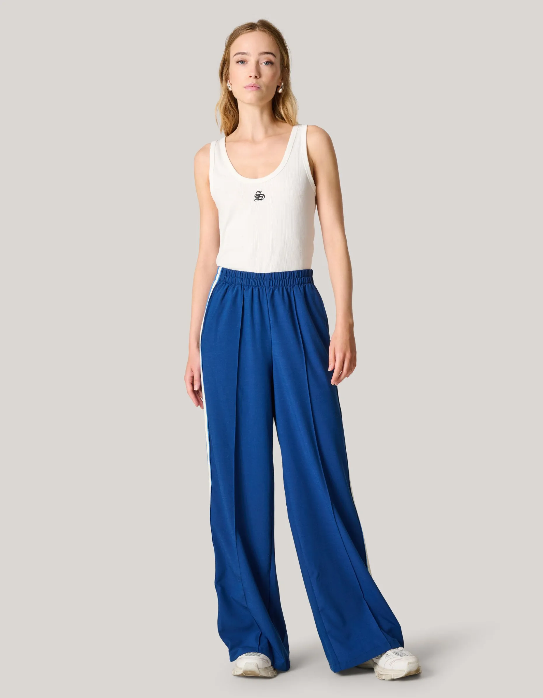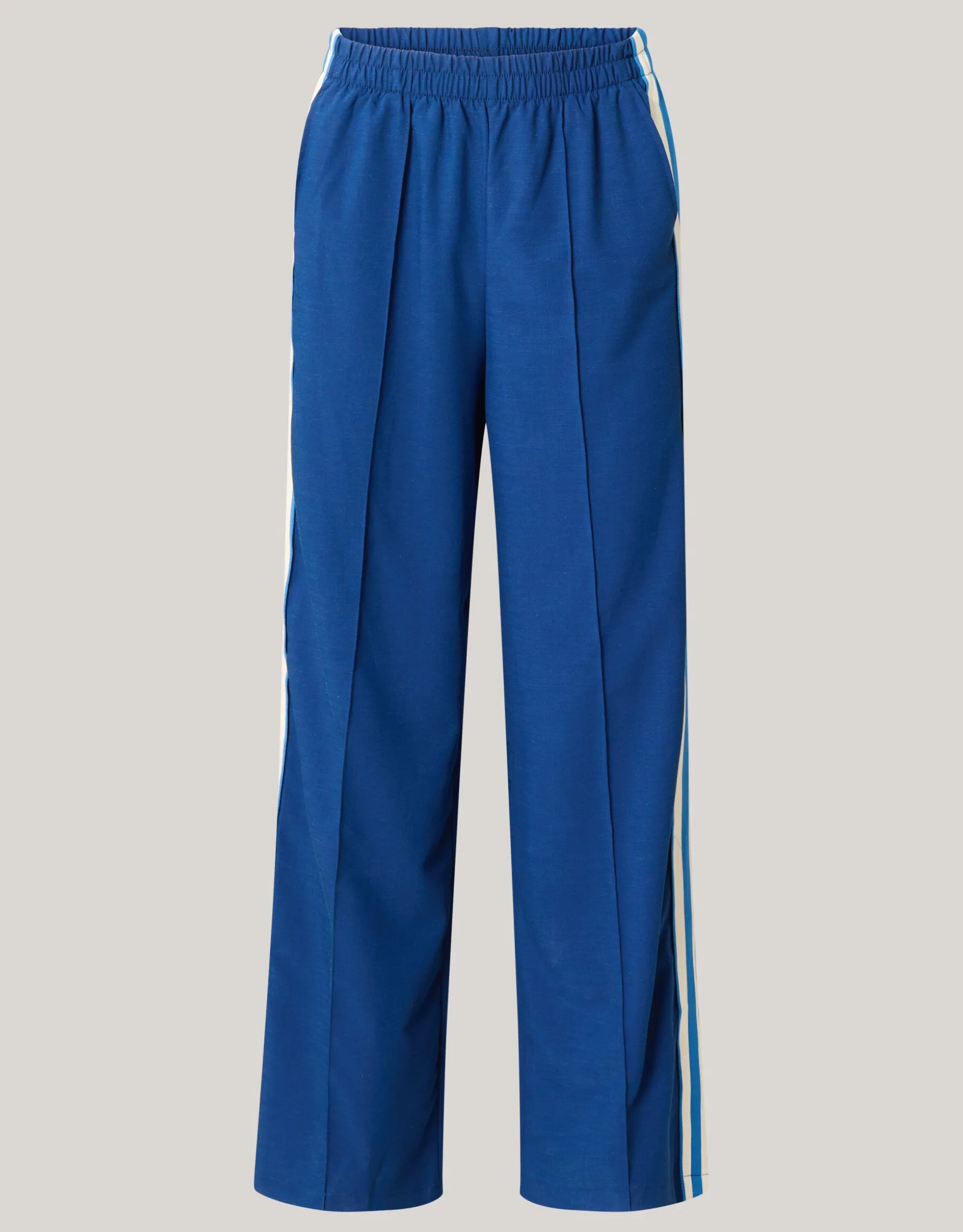 Musthave! De Sporty Broek heeft een hoge taille, een low-stretch stof, een relaxed fit, steekzakken en een elastieken tailleband. Het item wordt gekenmerkt door de blauwe kleur en de witte strepen aan de zijkant van de broek. Dit zorgt voor een sportieve touch. De broek zit aangesloten in de taille en loopt mooi uit bij de broekspijpen. Verder is het gemaakt van polyester, elastaan en linnen. Door deze samenstelling is het sterk van kwaliteit, vormvast en subtiel rekbaar. Combineer het samen met je favoriete top of t-shirt voor een stijlvolle en sportieve look!