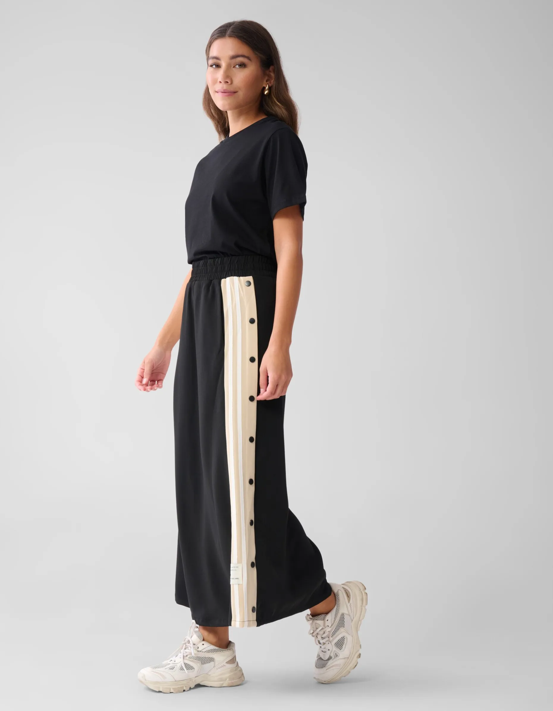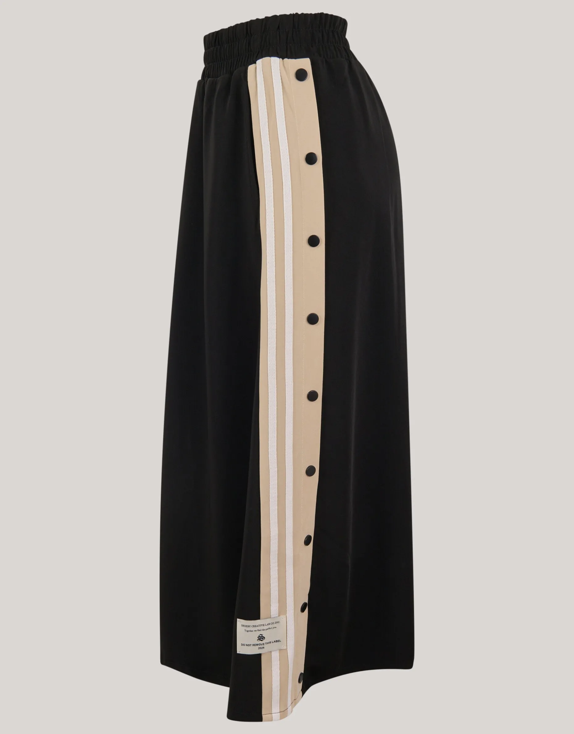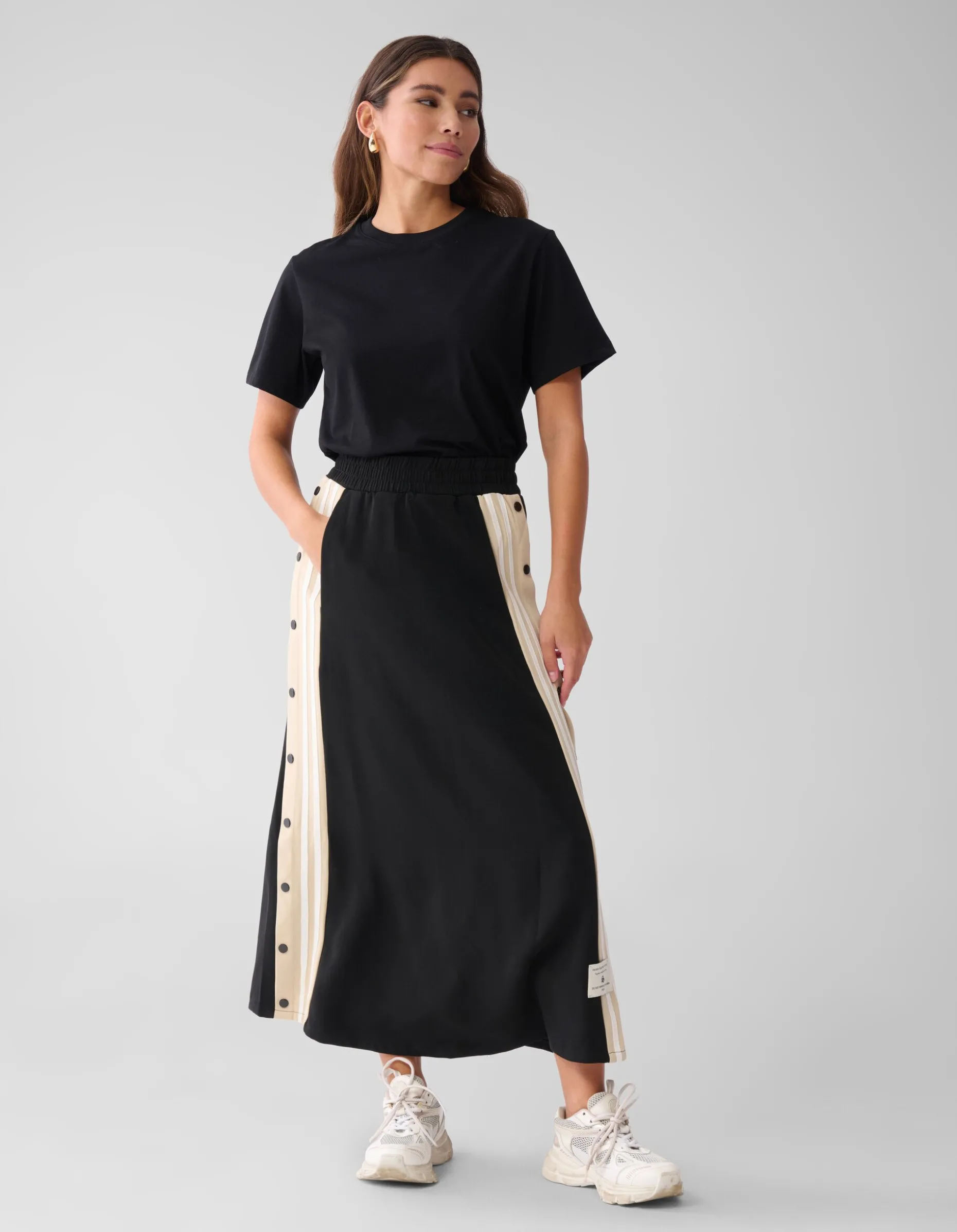 Ontdek de Sporty Button Maxi Rok Zwart! De rok heeft een elastische tailleband, een high-stretch stof, zwarte knoopdetails en een uitlopende fit. Verder wordt de rok gekenmerkt door de zwarte kleur en de beige strepen aan de zijkant. De rok is gemaakt van polyester en elastaan. Deze samenstelling zorgt ervoor dat de rok sterk van kwaliteit is en rekbaar. De rok heeft een binnenbeenlengte van 95,5 cm bij een maat XS/S. Het model heeft een lengte van 171 cm en draagt een maat XS/S. Combineer de rok met een zwarte basic top voor een casual look!
