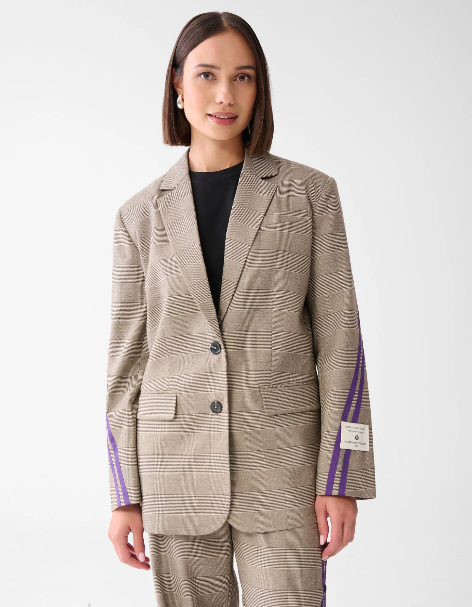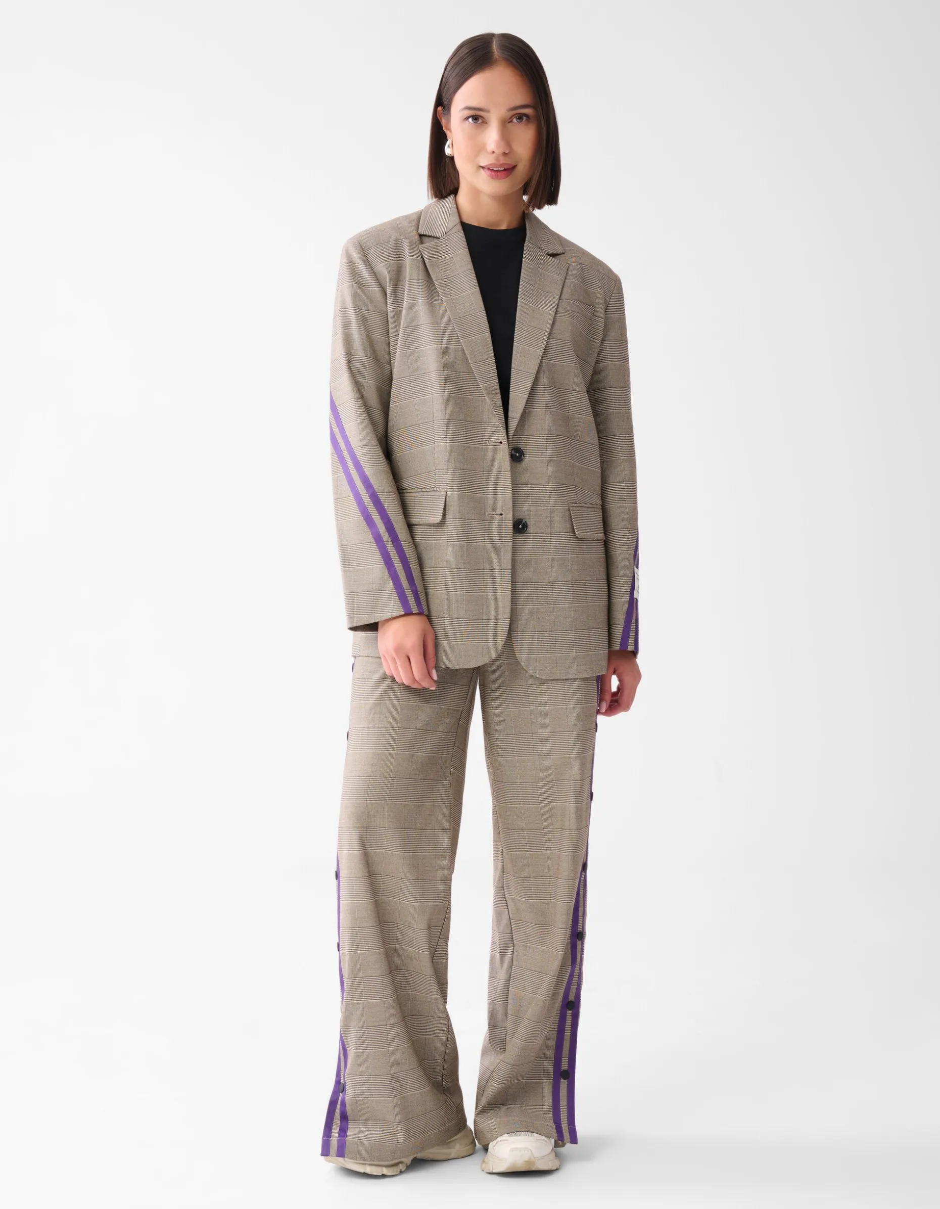 Musthave! De Sporty Ruiten Blazer Bruin heeft een oversized fit, lange mouwen, knoopsluiting en een bruine kleur. Verder heeft de blazer een subtiele ruitpatroon en de opvallende paarse strepen creëren een tijdloze look met een vleugje contrast. De blazer is gemaakt van polyester, viscose en elastaan. Deze samenstelling zorgt ervoor dat de blazer sterk van kwaliteit, vormvast en subtiel rekbaar is. De blazer heeft een totale lengte van 72 cm bij een maat XS/S. Draag de blazer samen met de bijpassende wide leg broek voor een stylish look!