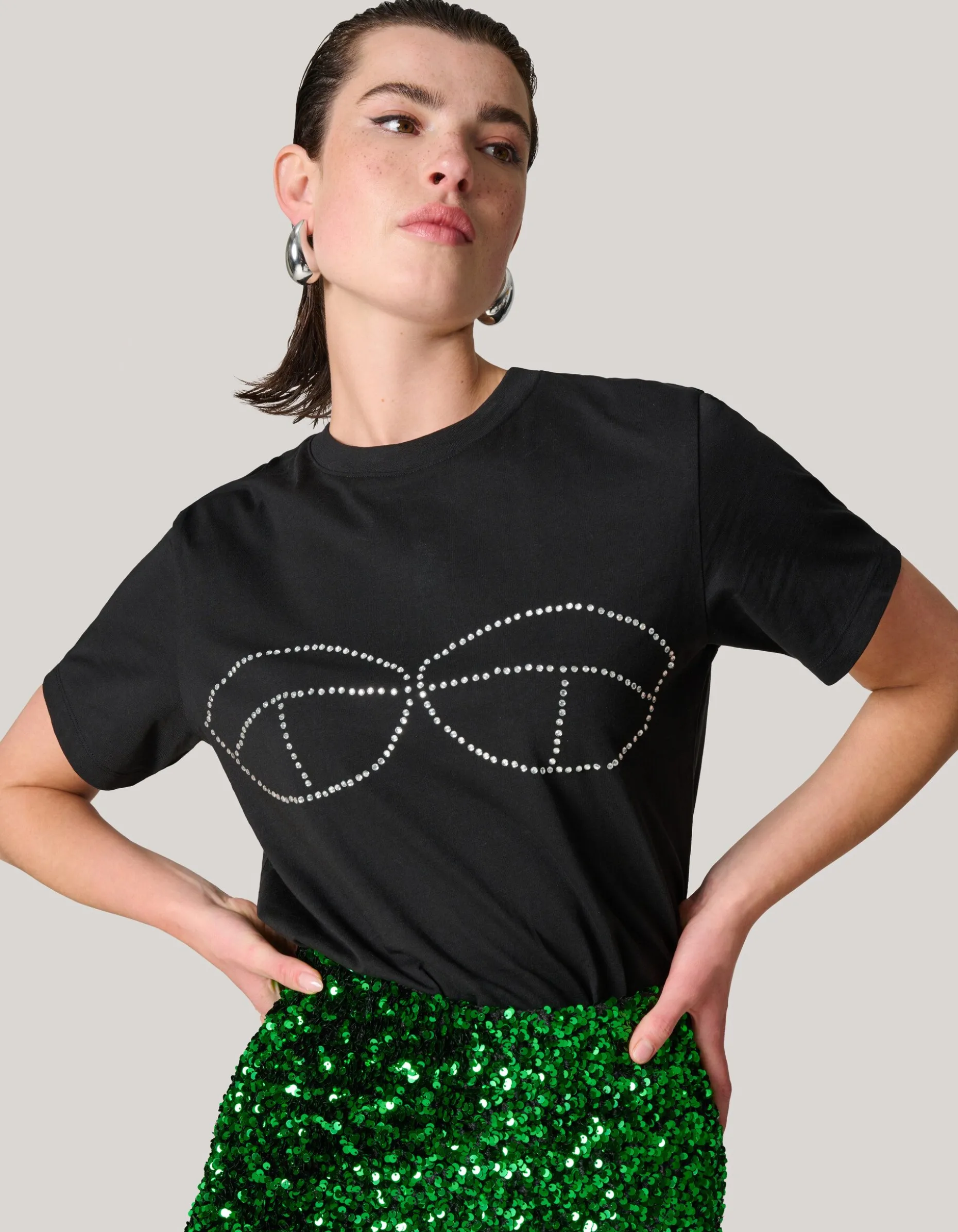 Get the perfect blend of comfort and style with our Shoeby T-shirts! Het Strass Bra T-shirt heeft korte mouwen, een hoge ronde hals, een stretch stof en een relaxed fit. Het item wordt gekenmerkt door de zwarte kleur met strass steentjes op de borst. Door de strass steentjes krijgt het t-shirt een edgy effect! Het is gemaakt van katoen. Door deze samenstelling draagt het comfortabel. Combineer het samen met je favoriete rok en een paar loafers voor een on trend look! De totale lengte van het t-shirt bij maat S is 62 cm. Het model is 178 cm en draagt maat S.