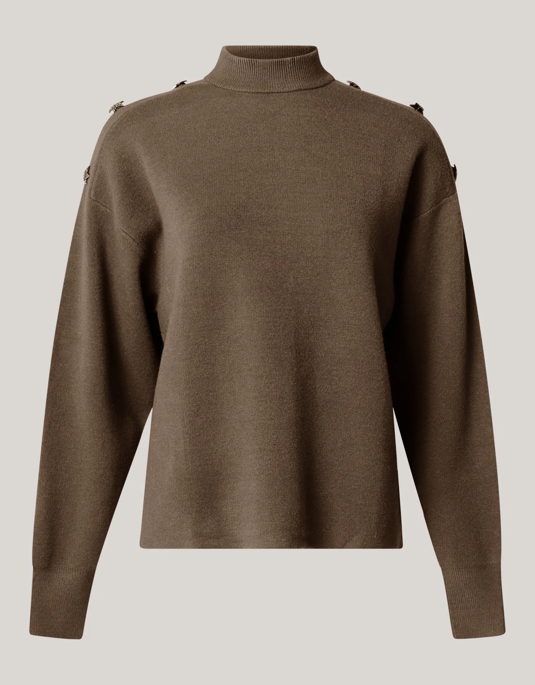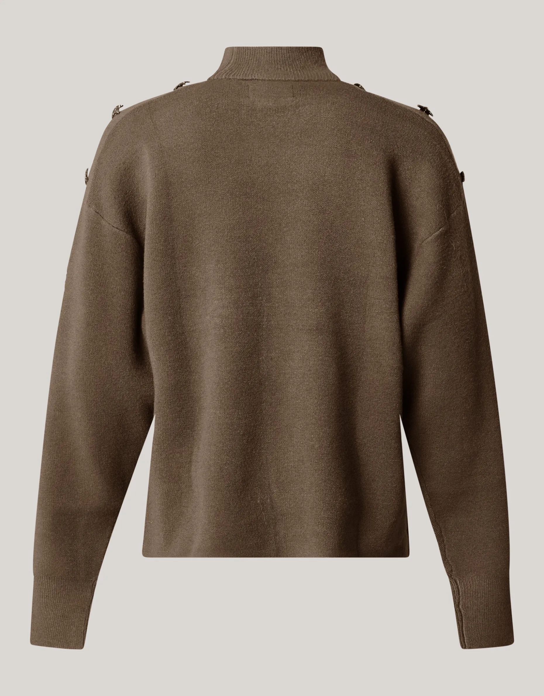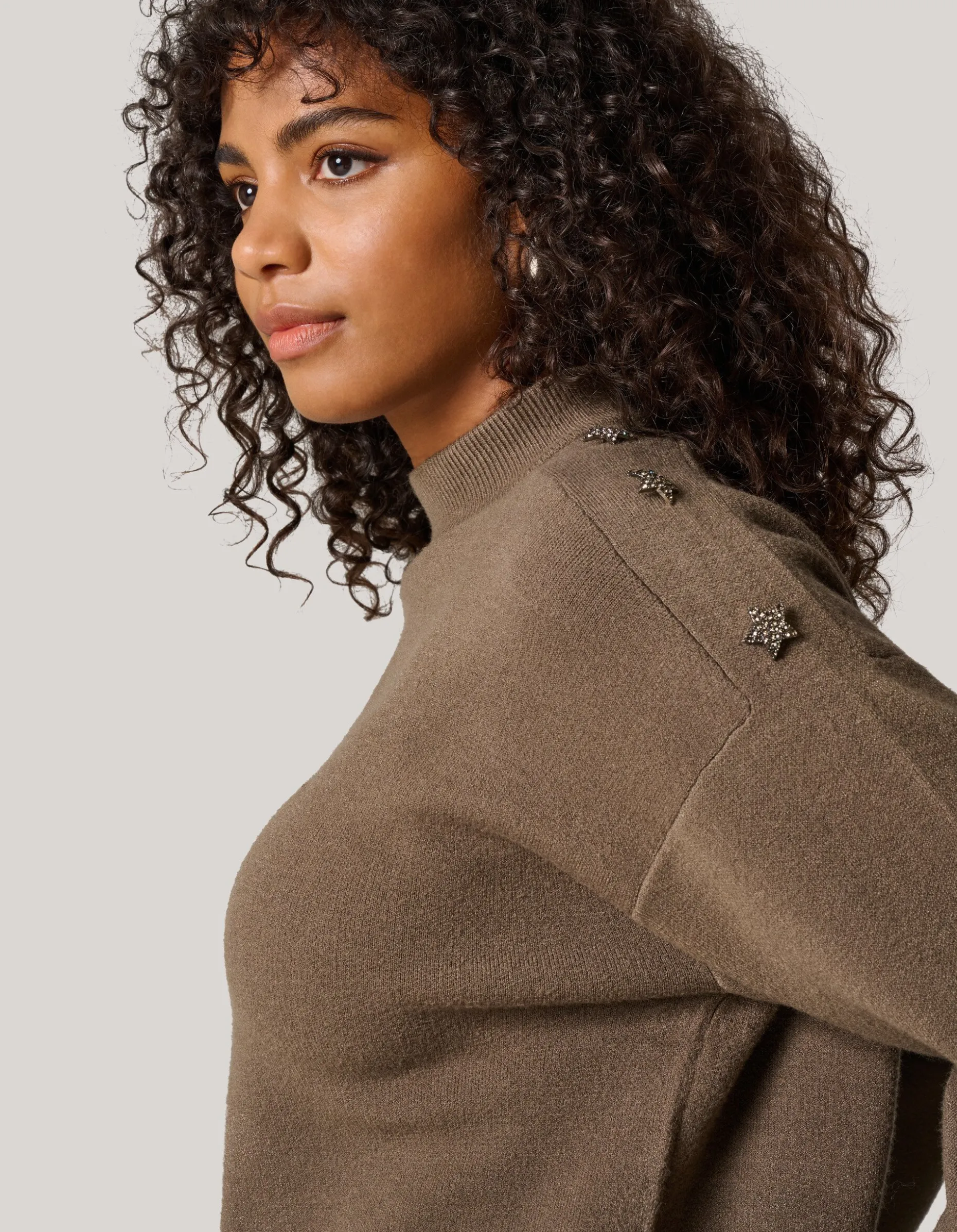 Ontdek de Button Trui Donkergroen! De trui heeft een hoge ronde hals, donkergroene kleur, relaxed fit en lange mouwen. Verder wordt de trui gekenmerkt door de sterren details op de beide schouders. De trui is gemaakt van viscose, polyester en polyamide. Deze samenstelling zorgt ervoor dat de trui sterk van kwaliteit, kleur- en vormvast is. Het model heeft een lengte van 176 cm en draagt maat S. De trui heeft een totale lengte van 57 cm bij een maat S.