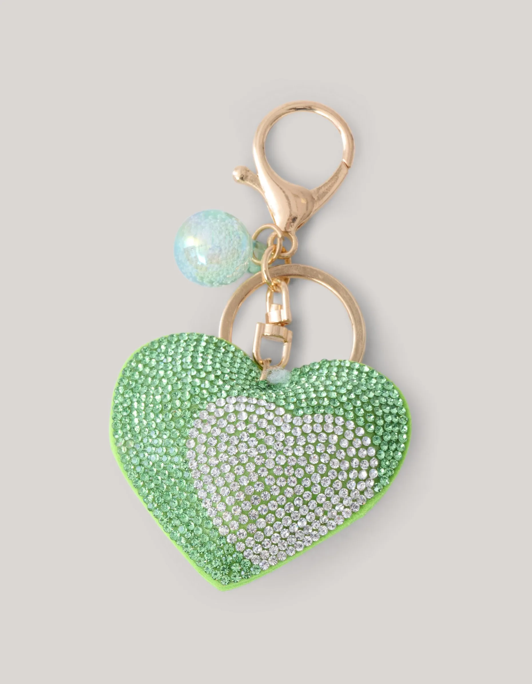 Ontdek de betoverende charme van onze groene hartvormige sleutelhanger, versierd met glinsterende steentjes. Perfect voor elke tas of sleutelbos. De sleutelhanger wordt gekenmerkt door het grote, groene hart met zilver detail en de gouden keychain.