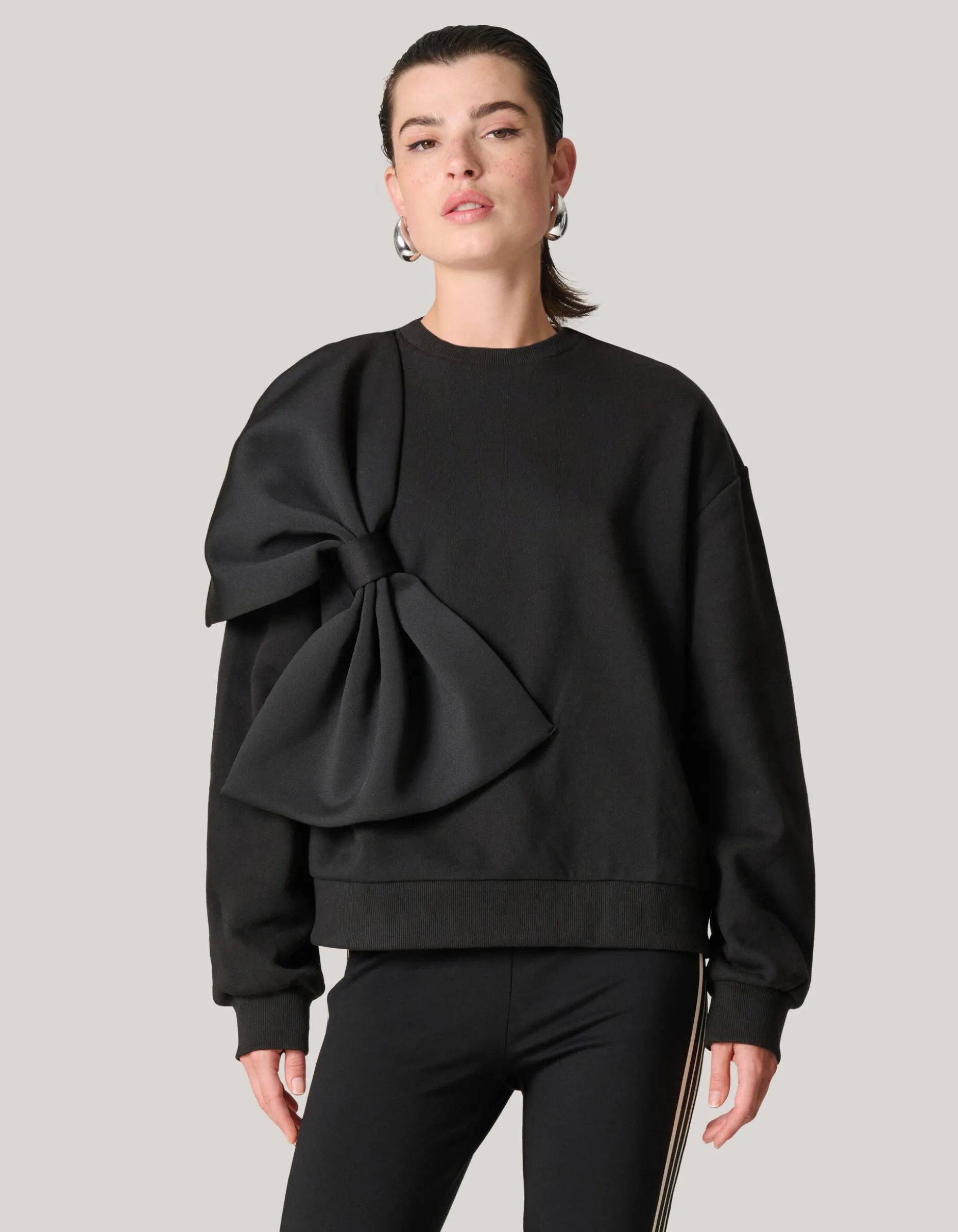 Musthave! De Strik Sweater Zwart heeft lange mouwen, een hoge ronde hals, een low-stretch stof en een oversized fit. Het item wordt gekenmerkt door de zwarte kleur en de grote, satijn look strik op de voorzijde van de sweater. Verder is het gemaakt van katoen en polyester. Door deze samenstelling is het sterk van kwaliteit, vormvast en comfortabel. Draag het samen met een sporty legging voor een trendy but casual look! De totale lengte van de sweater is 58 cm bij maat XS/S. Het model is 177 cm en draagt maat XS/S.