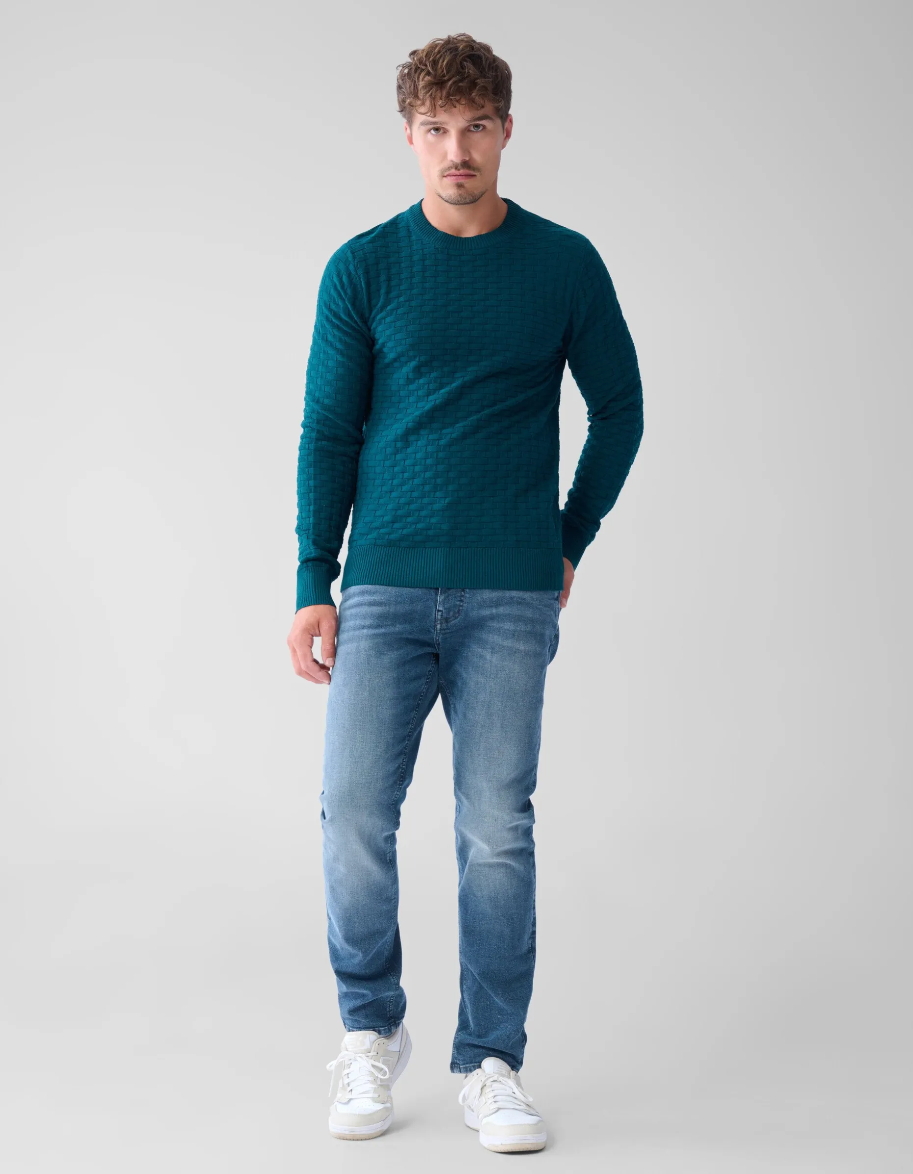 Musthave! De Structuur Trui heeft lange mouwen, een hoge ronde hals en een regular fit. Het item wordt gekenmerkt door de donkergroene kleur met een all-over structuur in de stof verwerkt. Het shirt is gemaakt van katoen, viscose en polyamide, hierdoor is het sterk van kwaliteit en comfortabel. Draag het samen met jouw favoriete broek voor een stijlvolle look! Het model heeft een totale lengte 185 cm en draagt maat M.