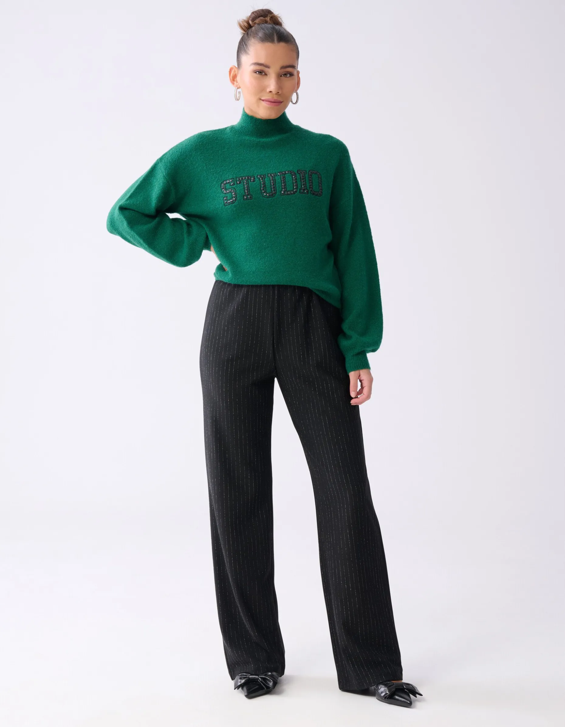 Musthave! De studio Strass Trui Donkergroen heeft een opvallende studio opdruk met strass steentjes. Verder wordt de trui gekenmerkt door de oversized fit, donkergroene kleur, hoge kraag en de lange mouwen. De trui is gemaakt van acrylic, polyamide en elastaan. Deze samenstelling zorgt ervoor dat de trui sterk van kwaliteit, kleurvast en subtiel rekbaar is. Het model heeft een lengte van 171 cm en draagt en maat S. De trui heeft een totale lengte van 57 cm bij een maat S.