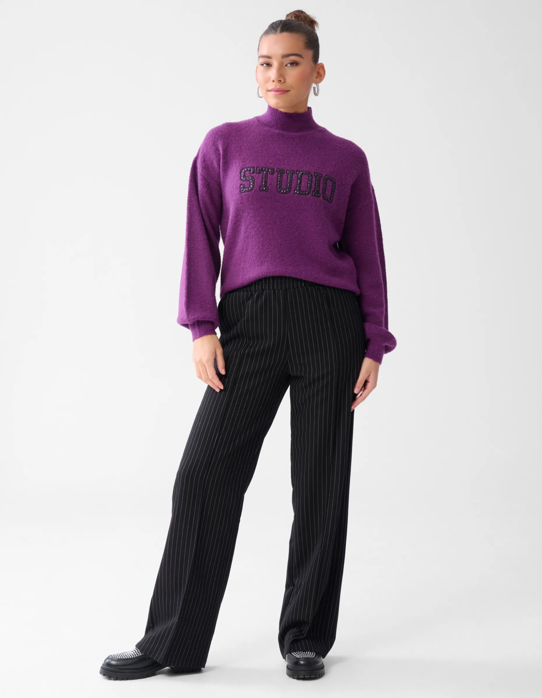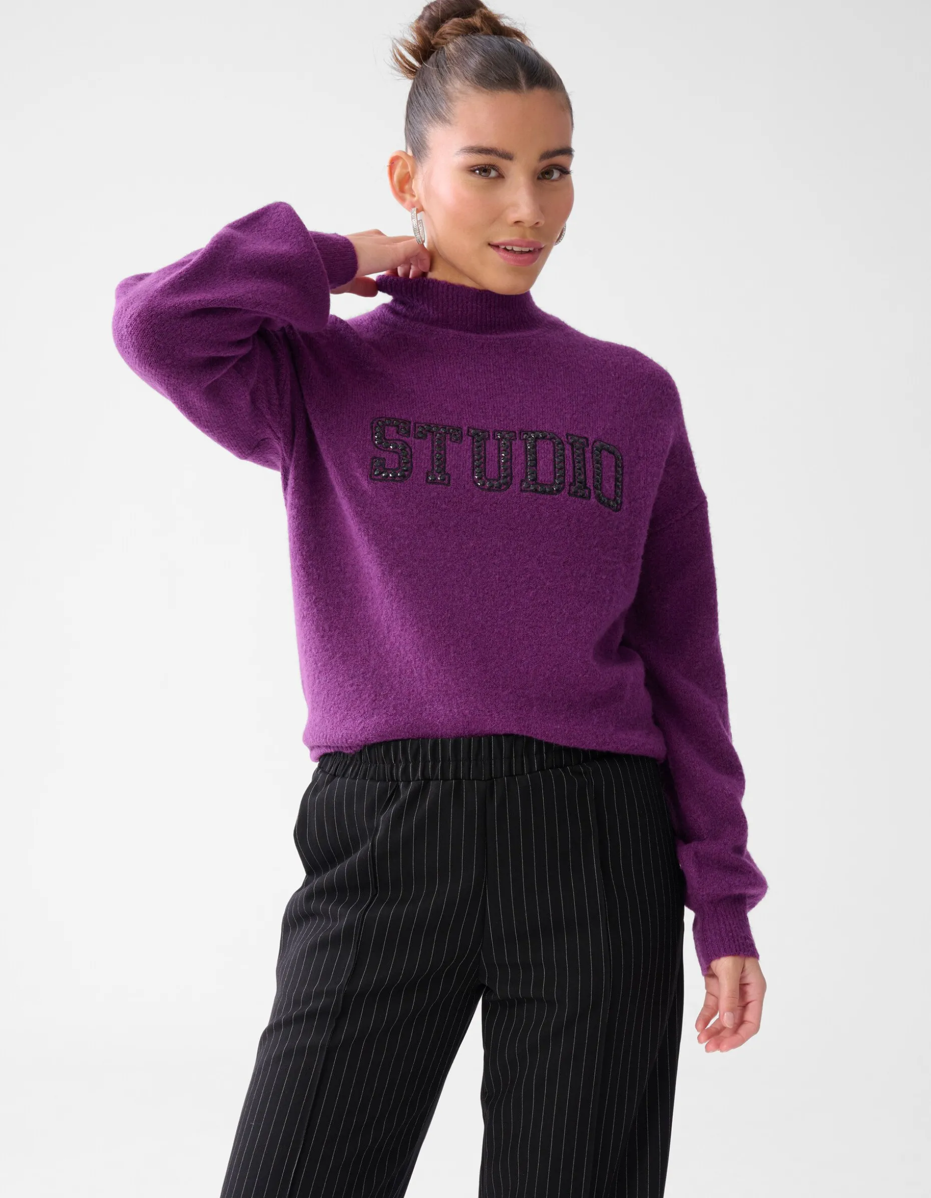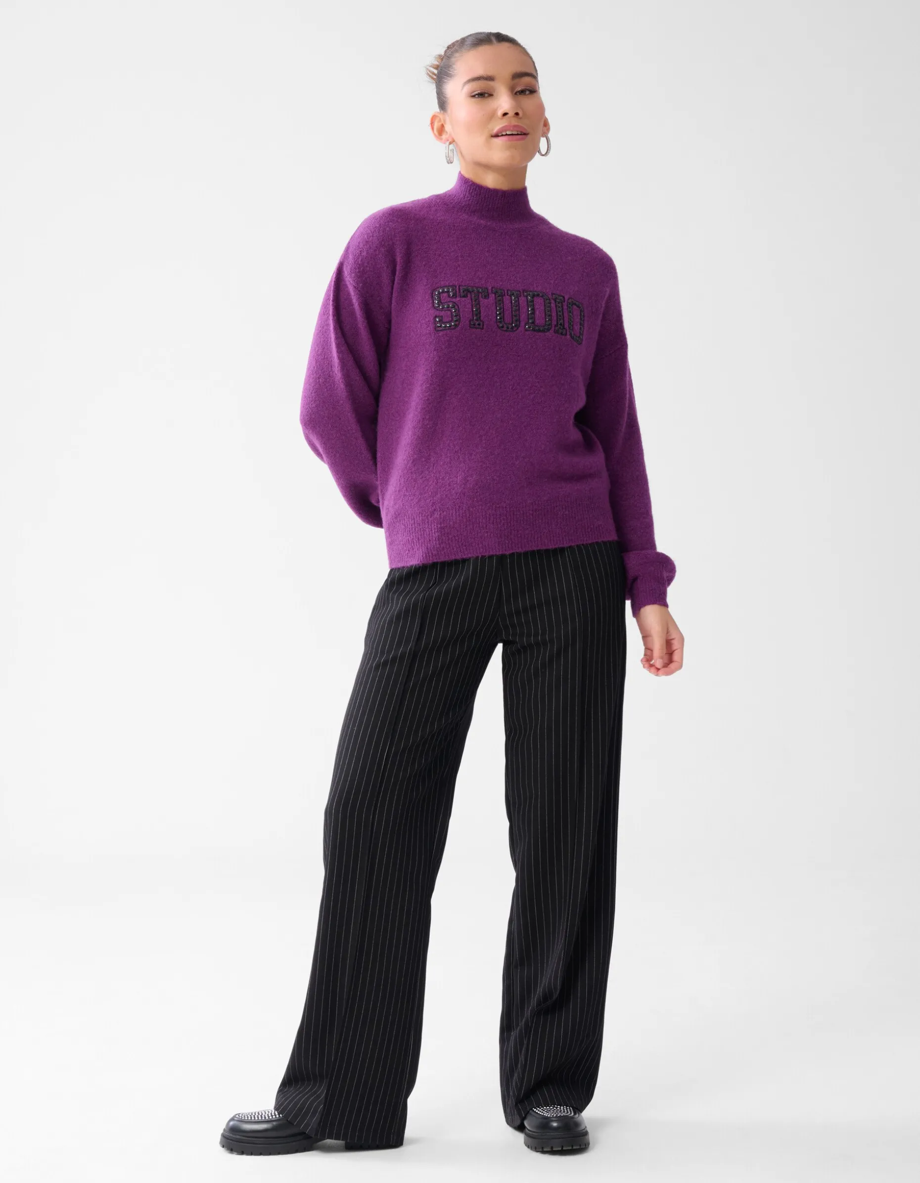 Musthave! De studio Strass Trui Donkerpaars heeft een opvallende studio opdruk met strass steentjes. Verder wordt de trui gekenmerkt door de oversized fit, paarse kleur, hoge kraag en de lange mouwen. De trui is gemaakt van acrylic, polyamide en elastaan. Deze samenstelling zorgt ervoor dat de trui sterk van kwaliteit, kleurvast en subtiel rekbaar is. Het model heeft een lengte van 171 cm en draagt en maat S. De trui heeft een totale lengte van 57 cm bij een maat S.