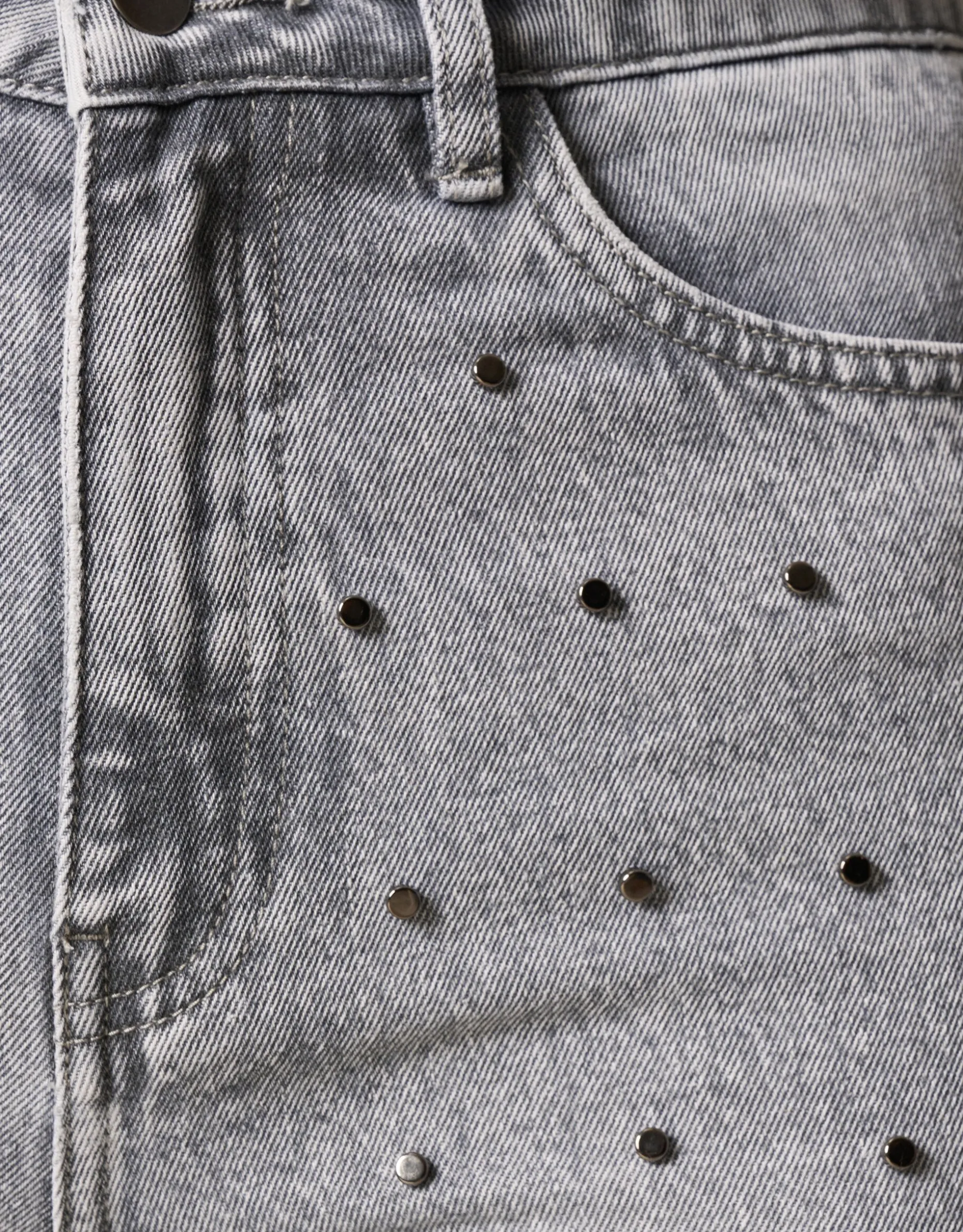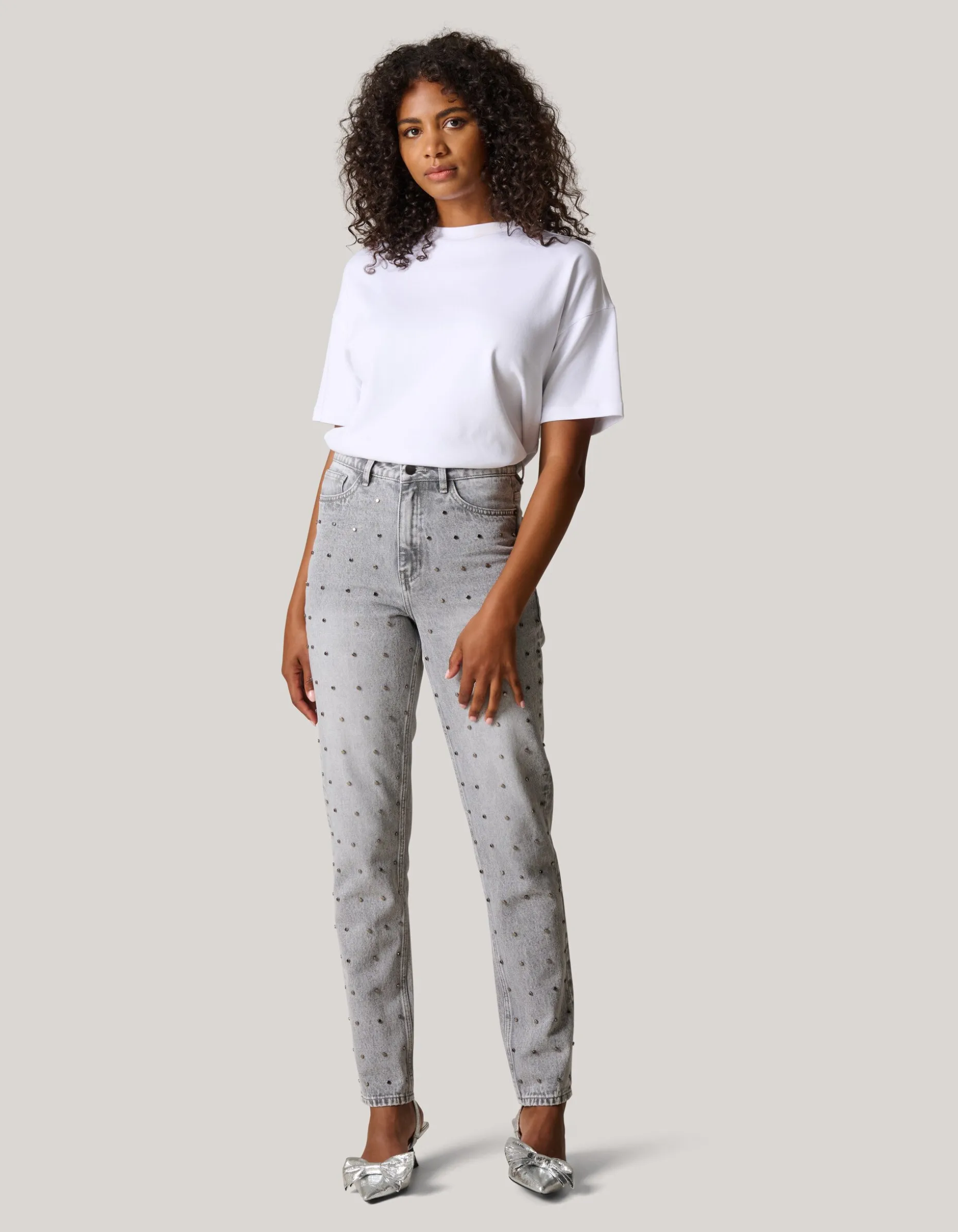 The perfect basic! De Studs Denim Jeans heeft een hoge taille, een tapered fit en een knoop-en ritssluiting. Het item wordt gekenmerkt door de grijze kleur en de studs op de broek voor een speels effect. De jeans is gemaakt van katoen. door deze samenstelling draagt het comfortabel. Maak de look compleet met een witte top, een paar sneakers voor een stijlvolle look! De jeans heeft een binnenbeenlengte van 78,7 cm.