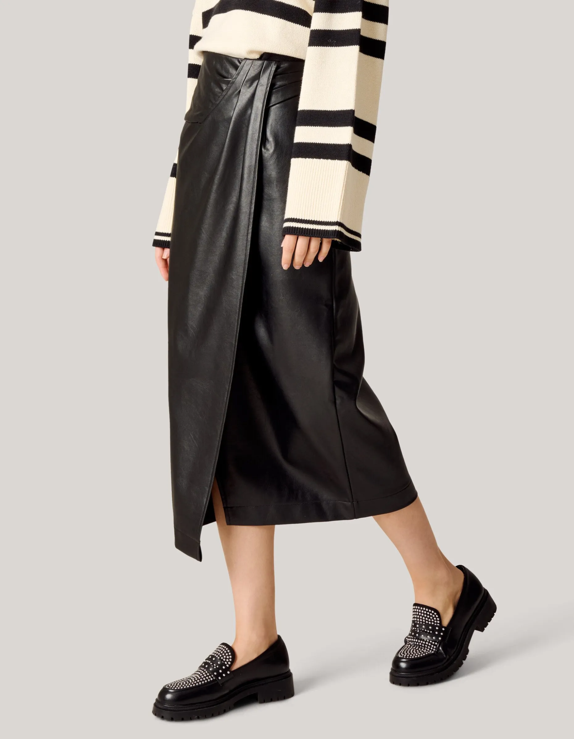 Effortlessly chic! De Vegan Leren Midi Rok Zwart heeft een hoge taille, een aangesloten fit en een maxi lengte. Het item wordt gekenmerkt door de zwarte witte kleur en overslag detail. De rok heeft een ritssluiting, waardoor het makkelijk aan en uit te doen is. Verder is de rok gemaakt van polyurethaan. Door deze samenstelling voelt de rok zacht aan en draagt het soepel. Combineer het item samen met een stijlvolle trui en je bent ready to go! Het model heeft een lengte van 176 cm en draagt maat S. De rok heeft een totale lengte van 85 cm.
