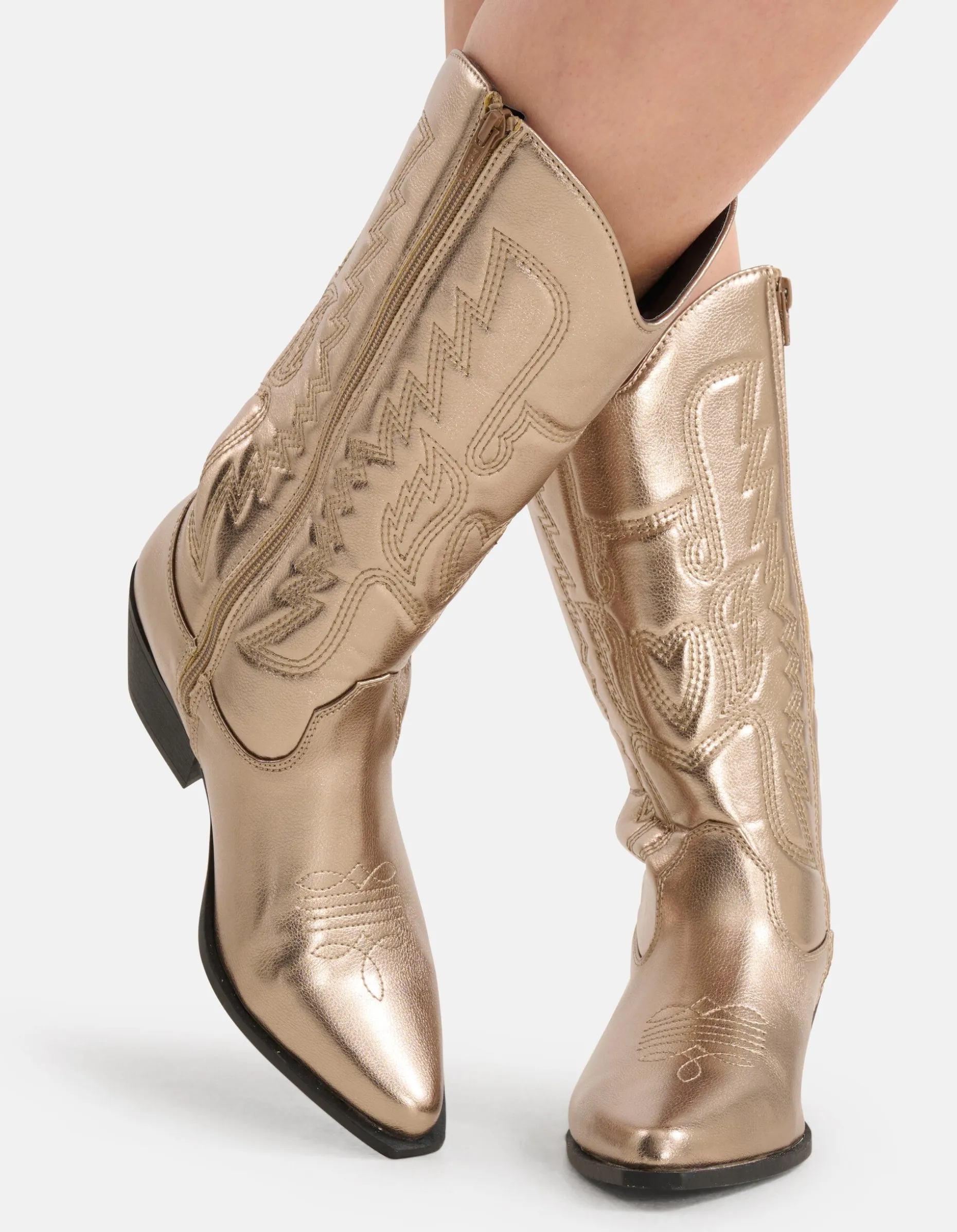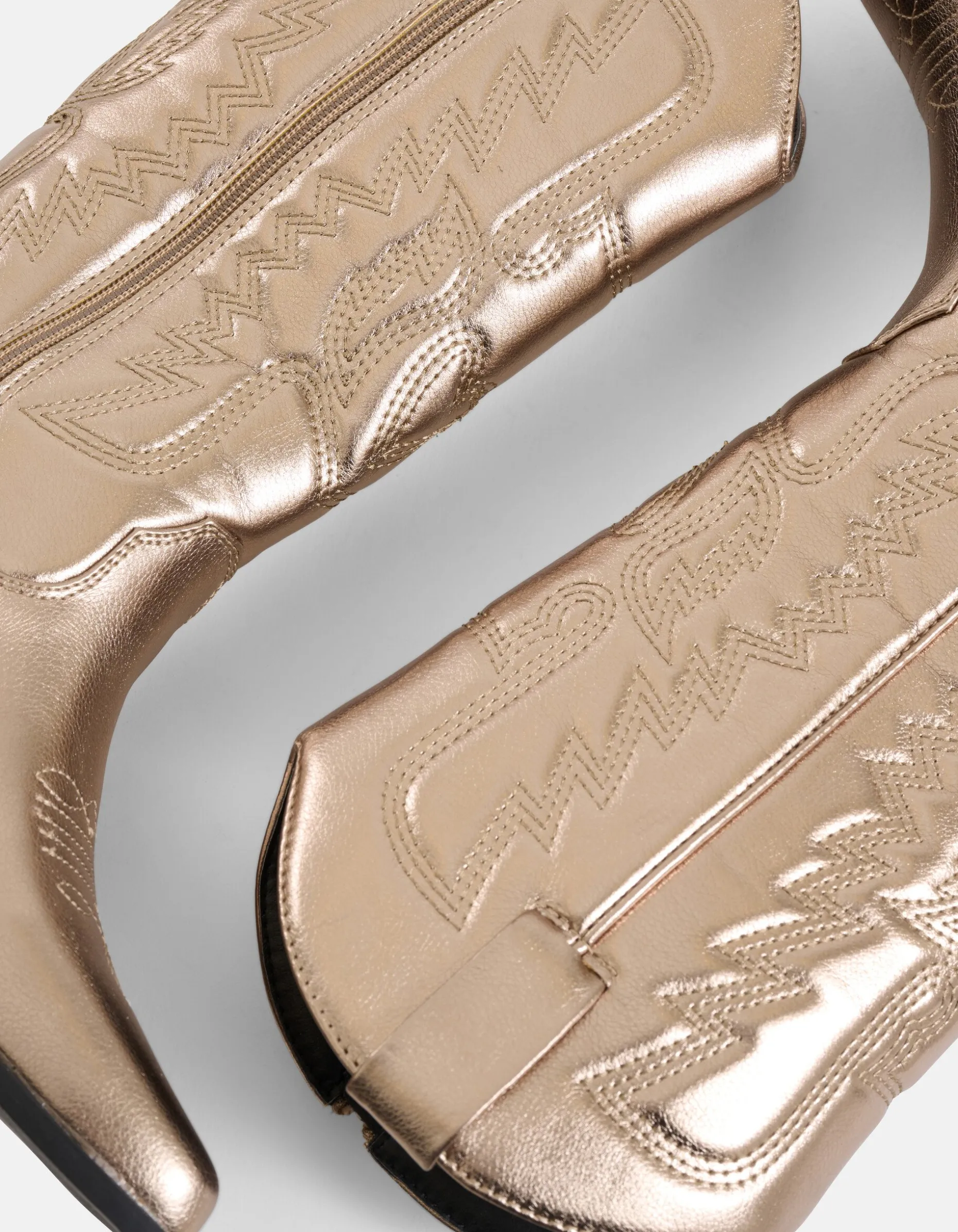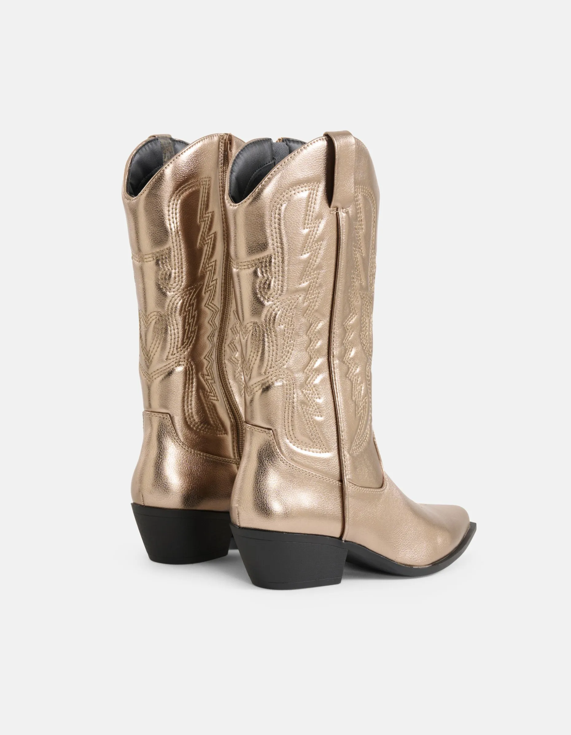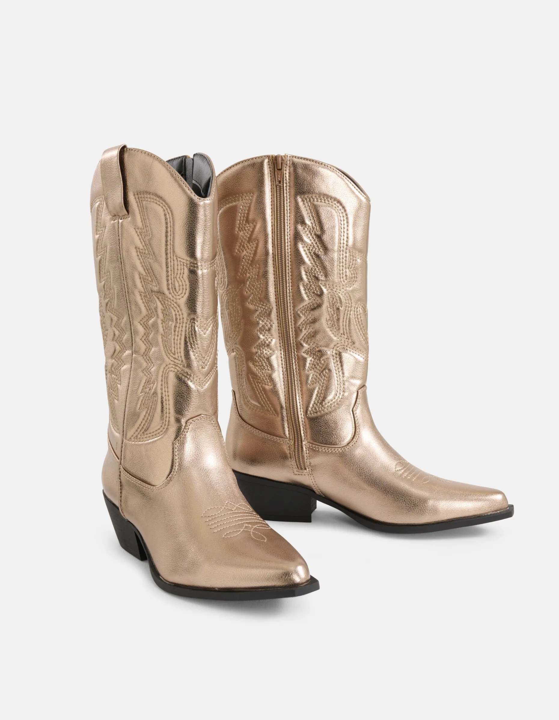 Golden eyecatcher! De middelhoge laarzen blijven dit seizoen weer trending en al helemaal met een opvallend kleurtje. De Western Laarzen worden gekenmerkt door het vegan leer en de shiny gouden kleur. Een leuk detail zijn de all-over stiksels met een western design, waardoor het een stoer effect heeft. Verder hebben de laarzen een spitse neus, een ritssluiting aan de zijkant, een inkeping aan de voor-en achterzijde en een western hak. Het item heeft een schachthoogte van 24,5 cm en een hakhoogte van 6 cm.