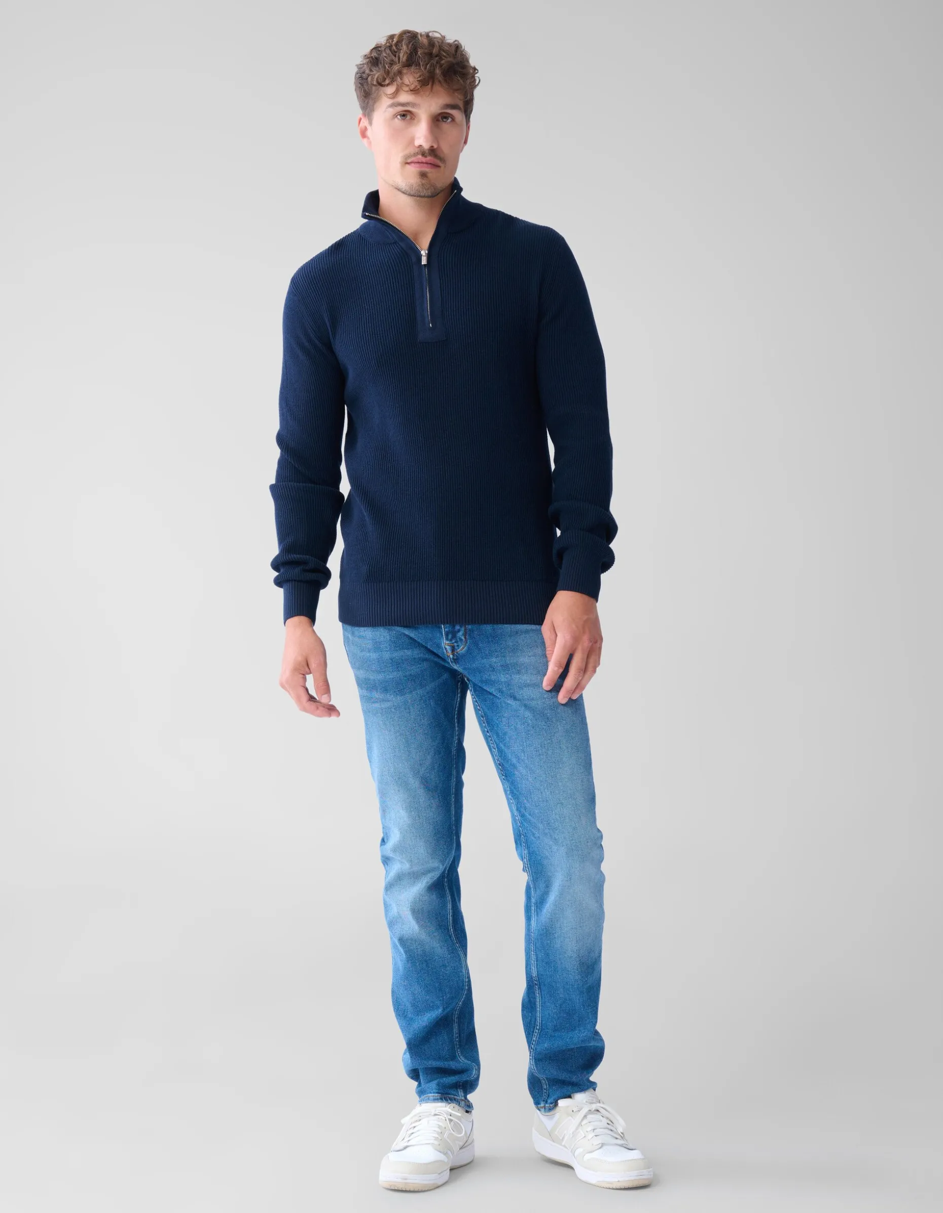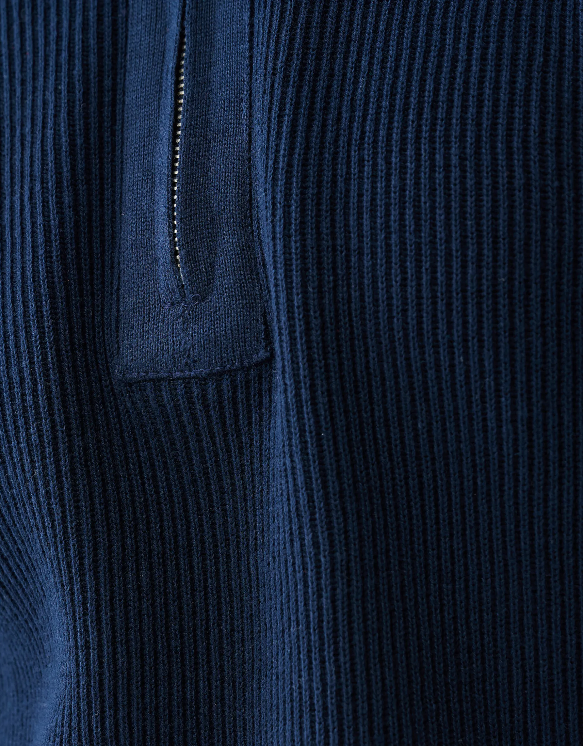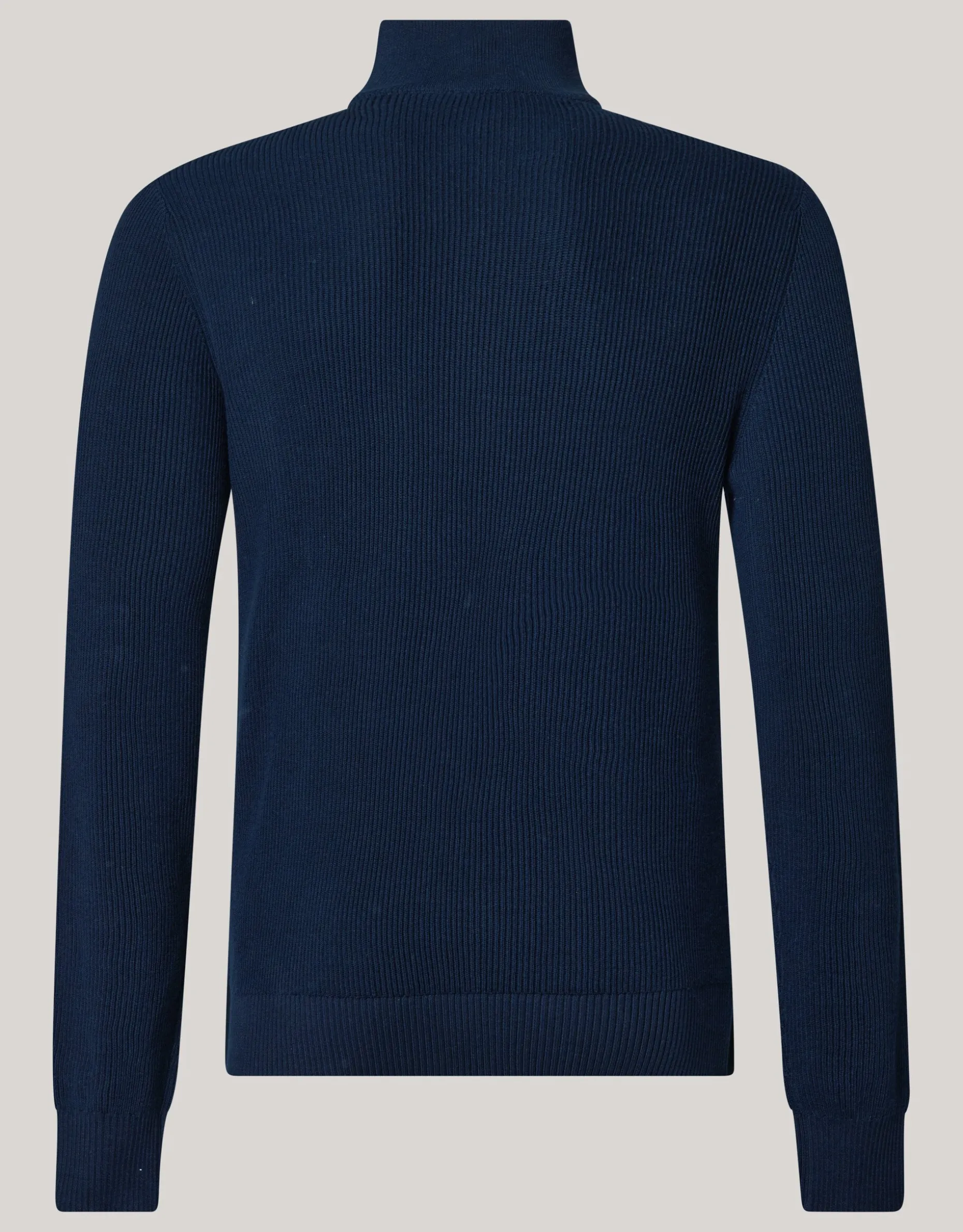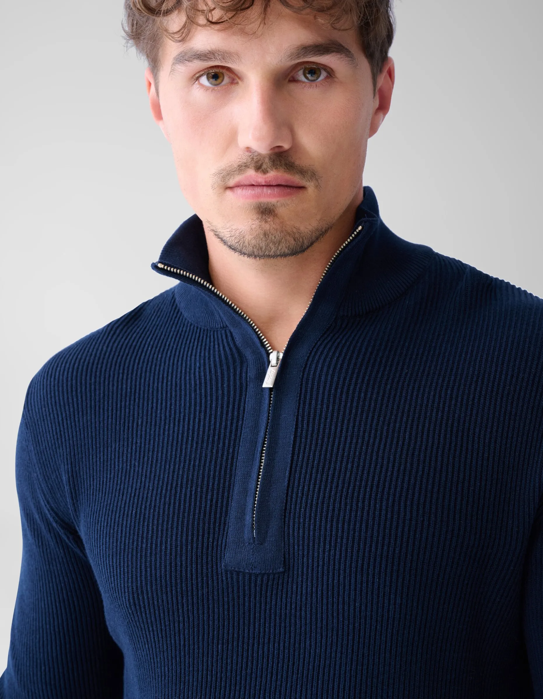 Artistry in every stitch! De Zipper Trui heeft lange mouwen, een hoge opstaande hals, een ritssluiting, een stretch stof en een regular fit. Het item wordt gekenmerkt door de rib brei en de navy kleur. Verder is het artikel gemaakt van 100% katoen. Door deze samenstelling draagt het comfortabel. Draag het samen met een jeans en een paar sneakers voor een casual look! Het model heeft een lengte van 185 cm en draagt maat M. Het artikel heeft een totale lengte van 70 cm bij maat M.